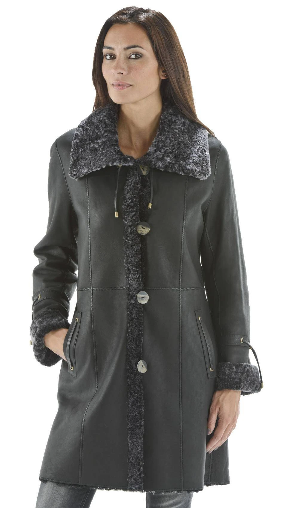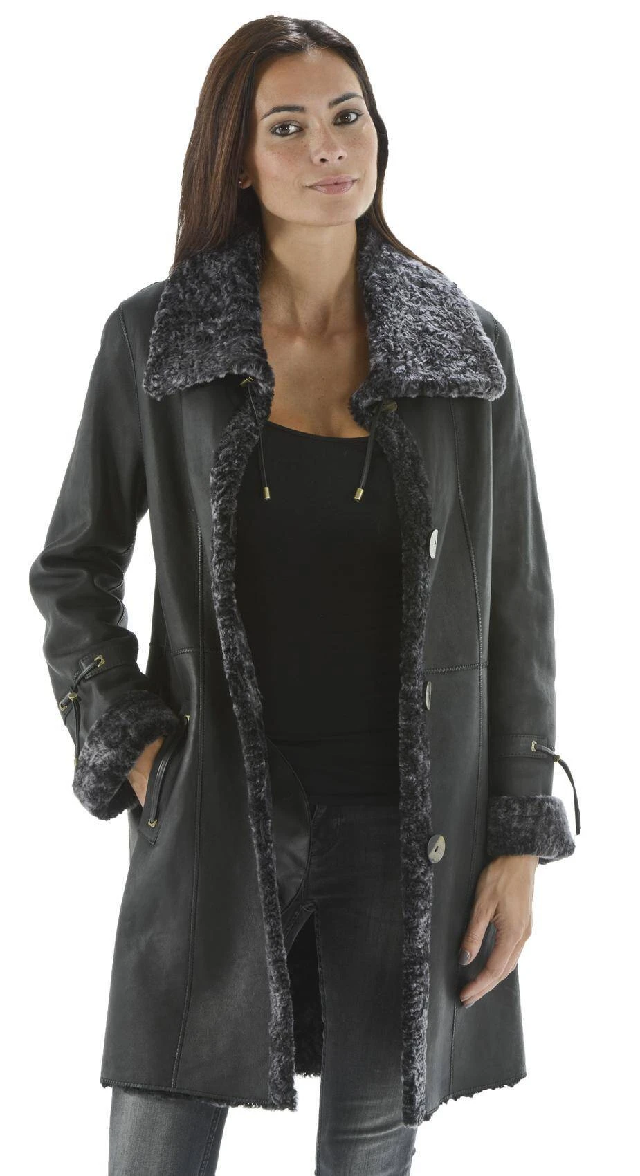 trois quart mouton, coupe droite, col droit, fermeture par boutons, poches biais, fantaisie sur la bas de la manche, longueur corps 90 cms