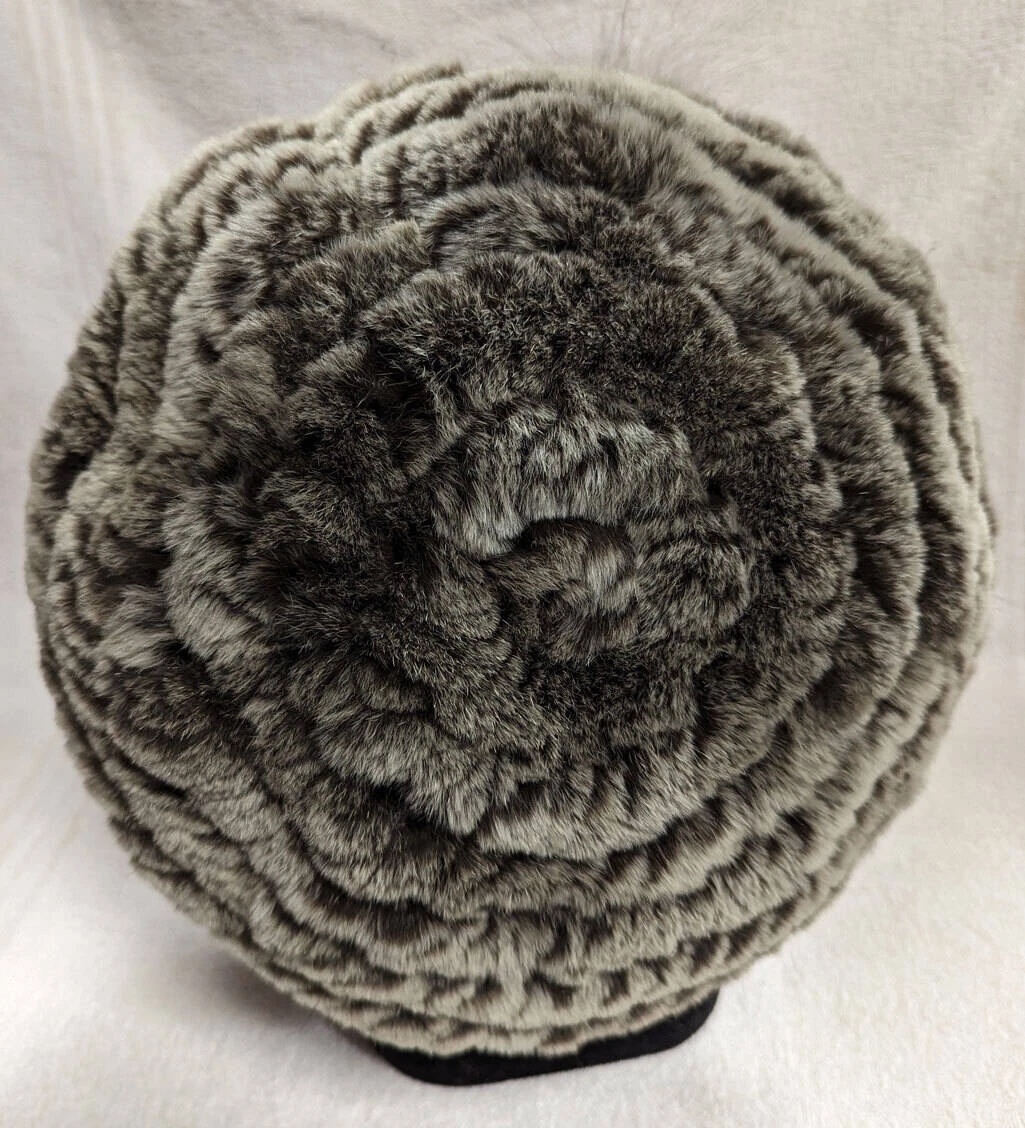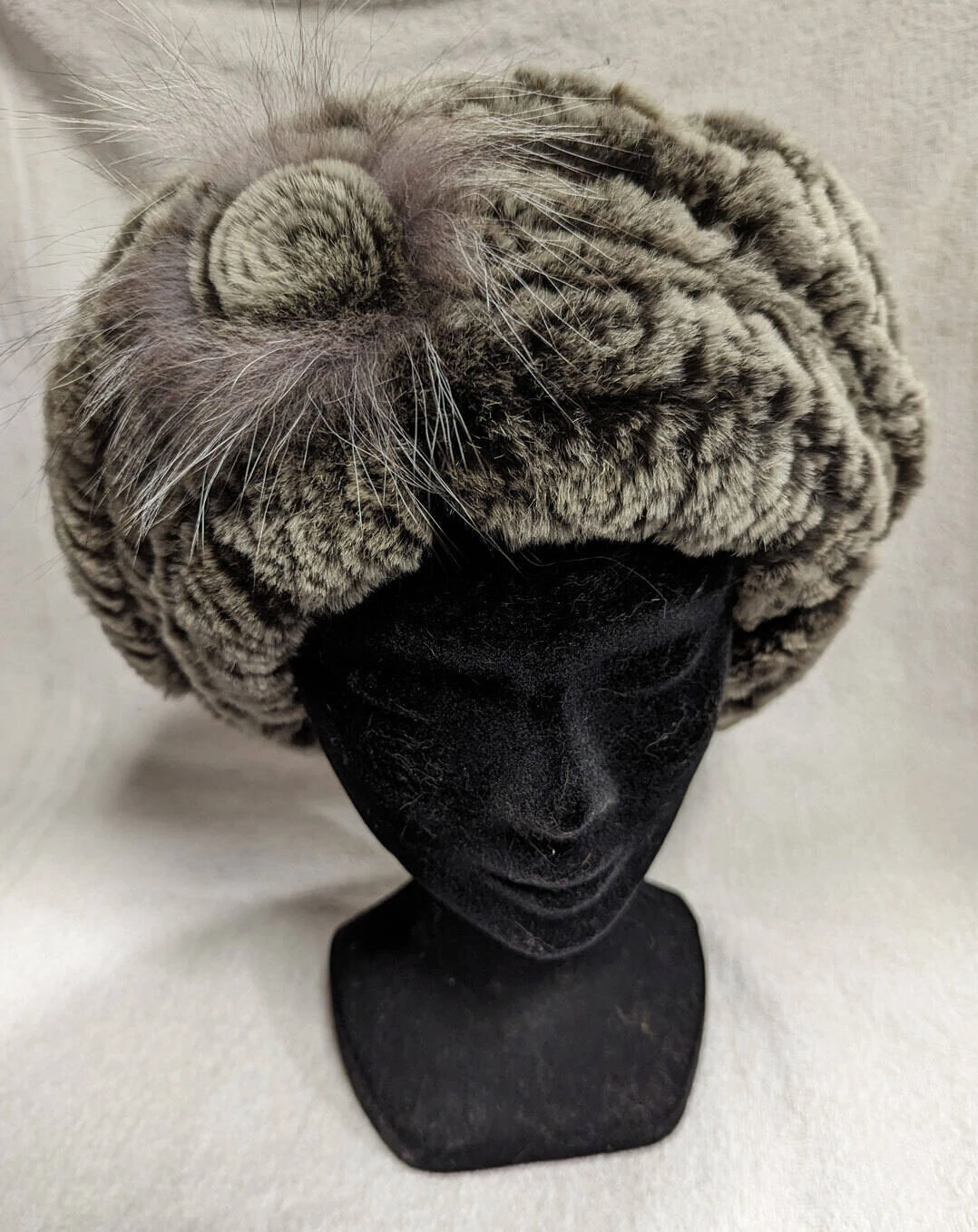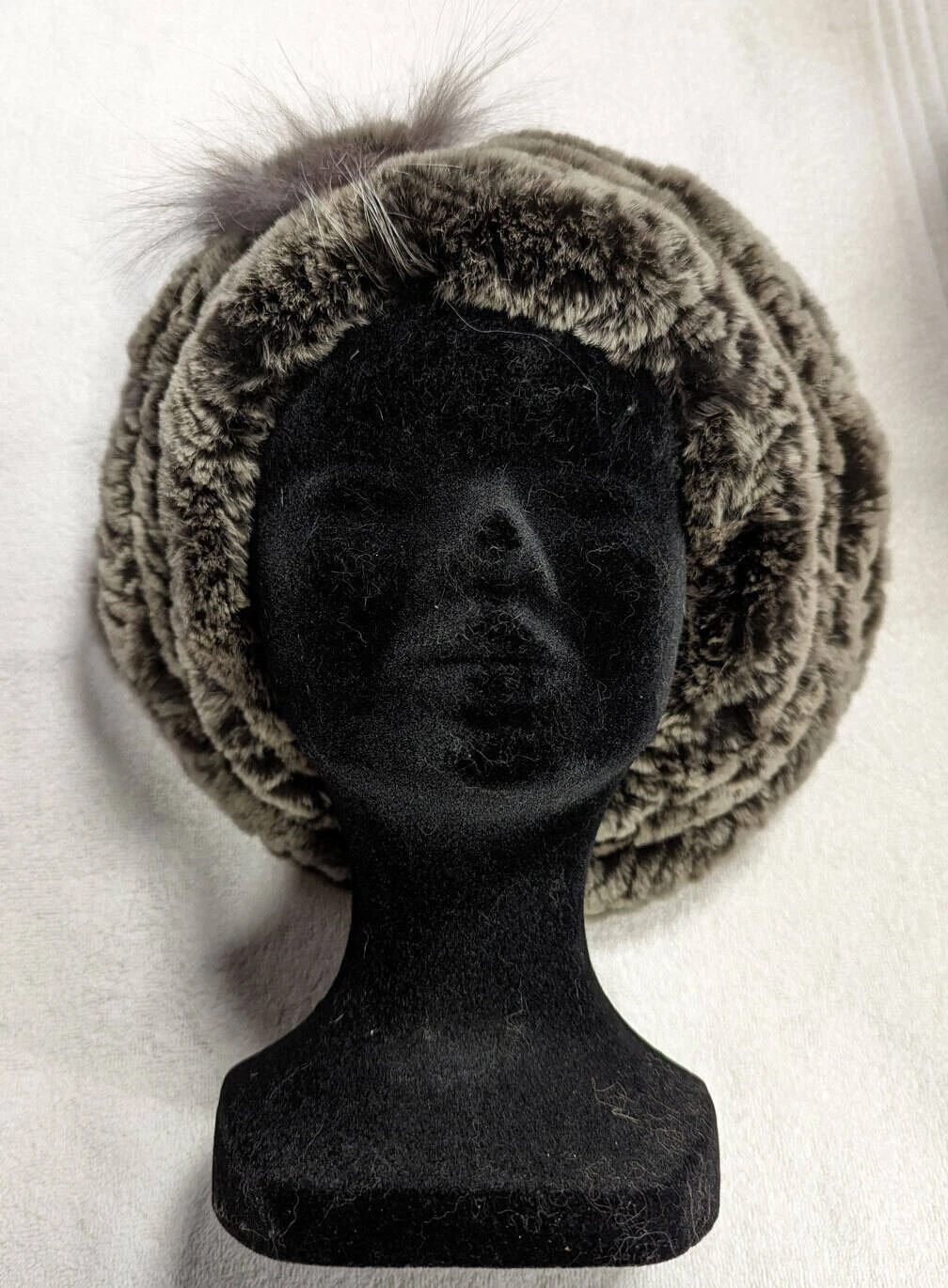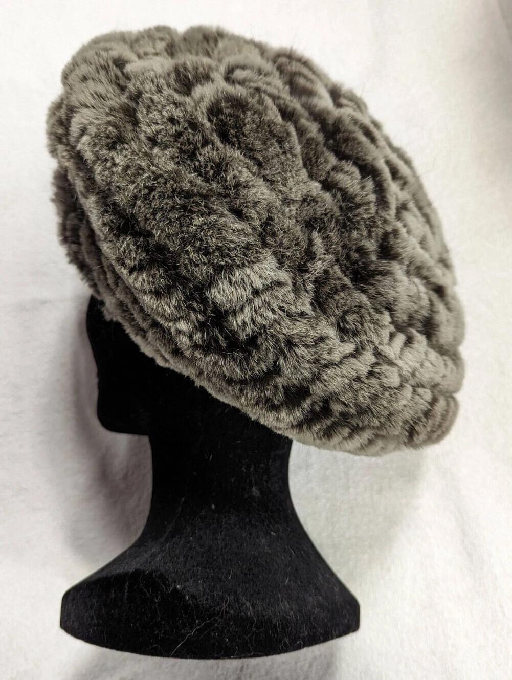 Chapeau pour femme dans un style béret chic en lapin tricoté , il y a une petite fantaisie sur le coté avec une petite forme arrondie en lapin et des pointe de fourrure véritable.