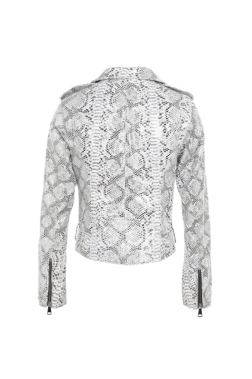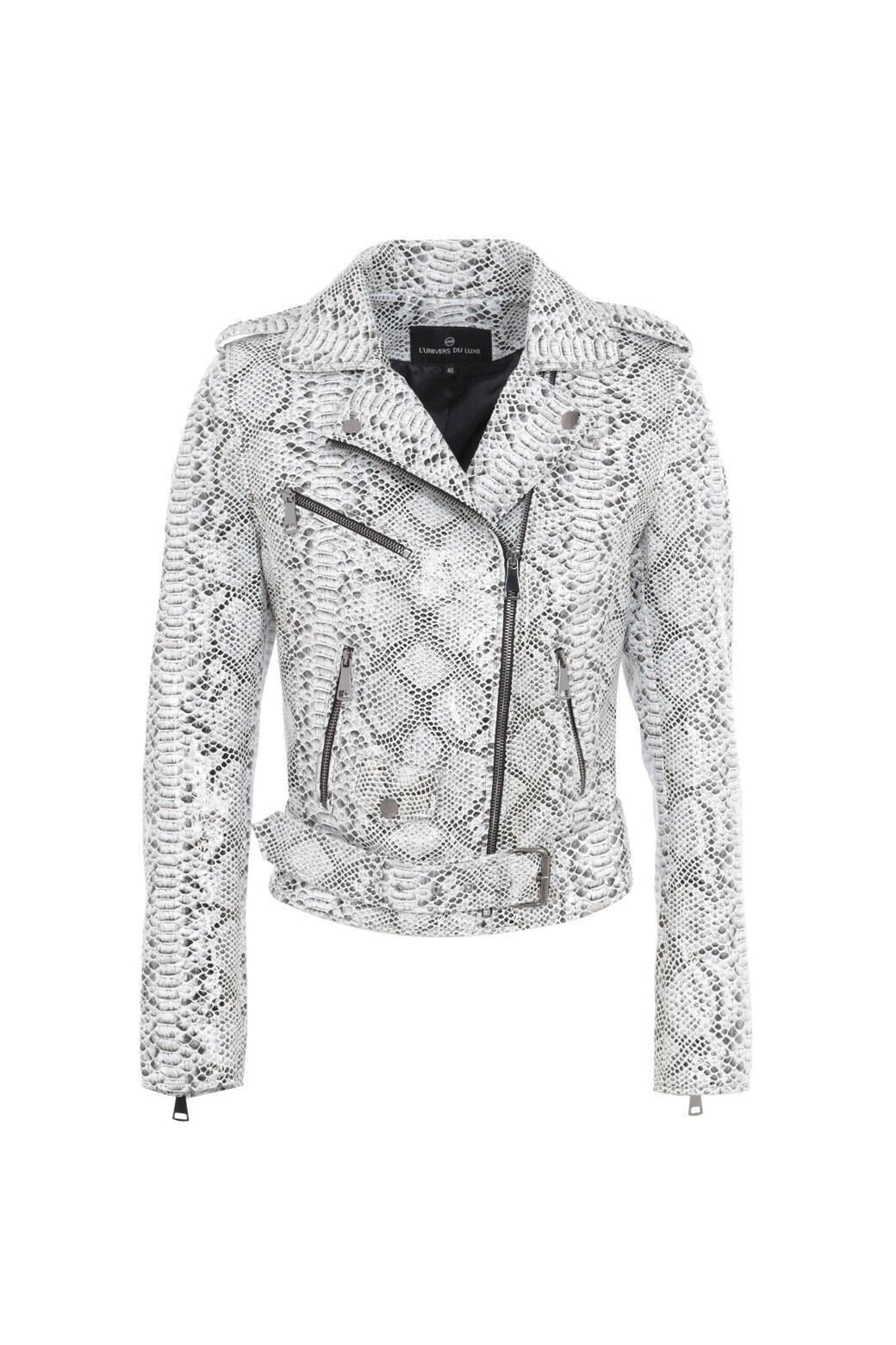 Blouson cuir biker pour femme dans un cuir d’agneau imprimé python, fin et souple . Il possède un col tailleur à pressions, se ferme à l’aide d’un zip asymétrique . Sur le bas des manches, vous avez des zips d’aisance, au niveau de la taille, vous avez une ceinture à boucle . Vous avez des pattes d’épaules, une petite pochette et deux poches biais zippées + 1 au niveau de la poitrine . Sa doublure est en polyester Comptez une longueur de corps de 50cms.