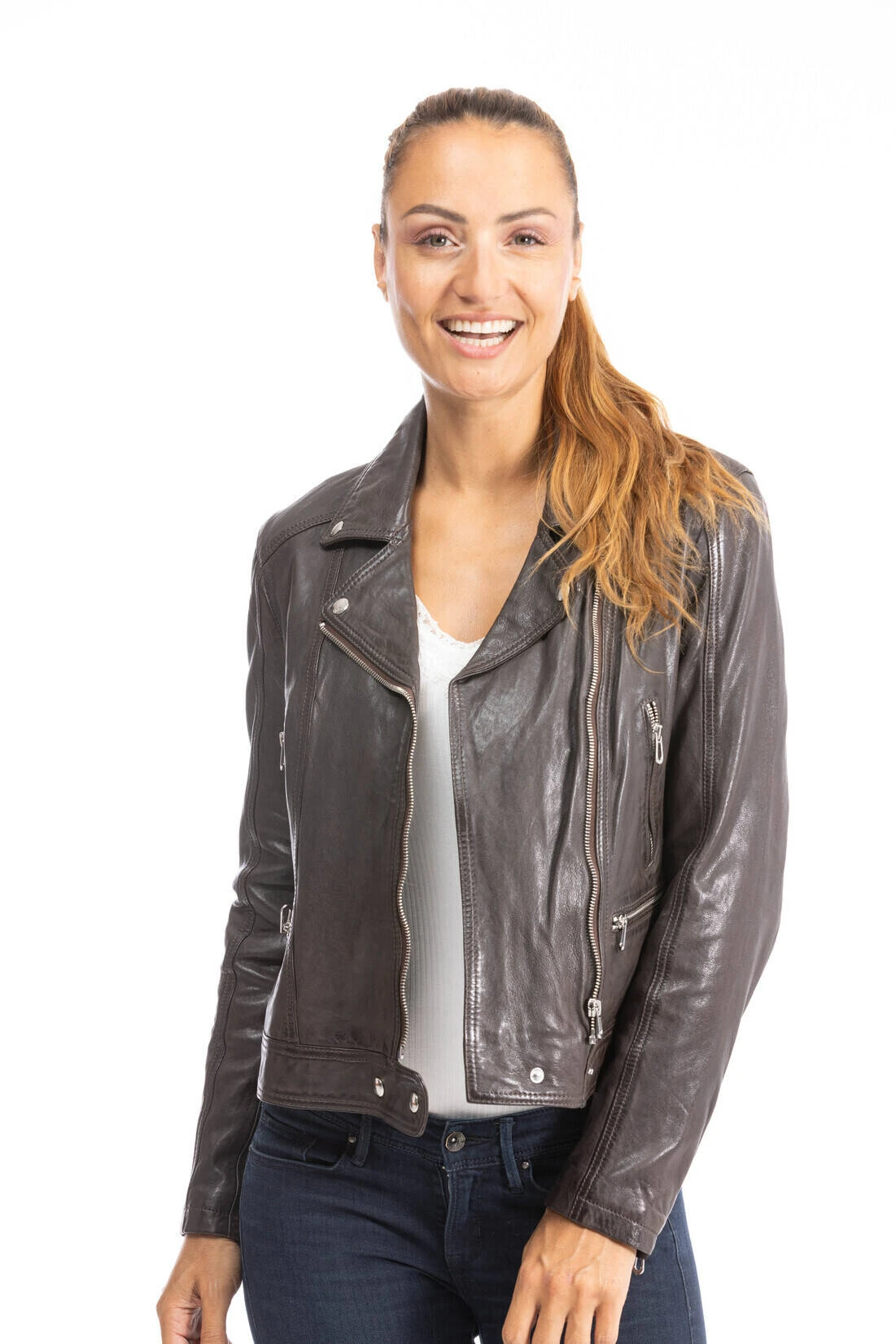 Blouson en cuir de la marque Rose Garden dans un style moderne et tendance. Ce blouson est en cuir d’agneau au tannage végétal décliné en 6 coloris , pour satisfaire toutes vos envies et vos looks . On retrouve un col tailleur à pressions, une Fermeture asymétrique zippée avec patte à pressions. Pour plus de confort , d’aisance , vous avez également un Bas de manches zippés. Sur l’avant, il y a 4 poches extérieures zippées dont 2 poches poitrine. Sa doublure corps est en coton esprit tropical avec 1 poche intérieure et ses manches en polyester.