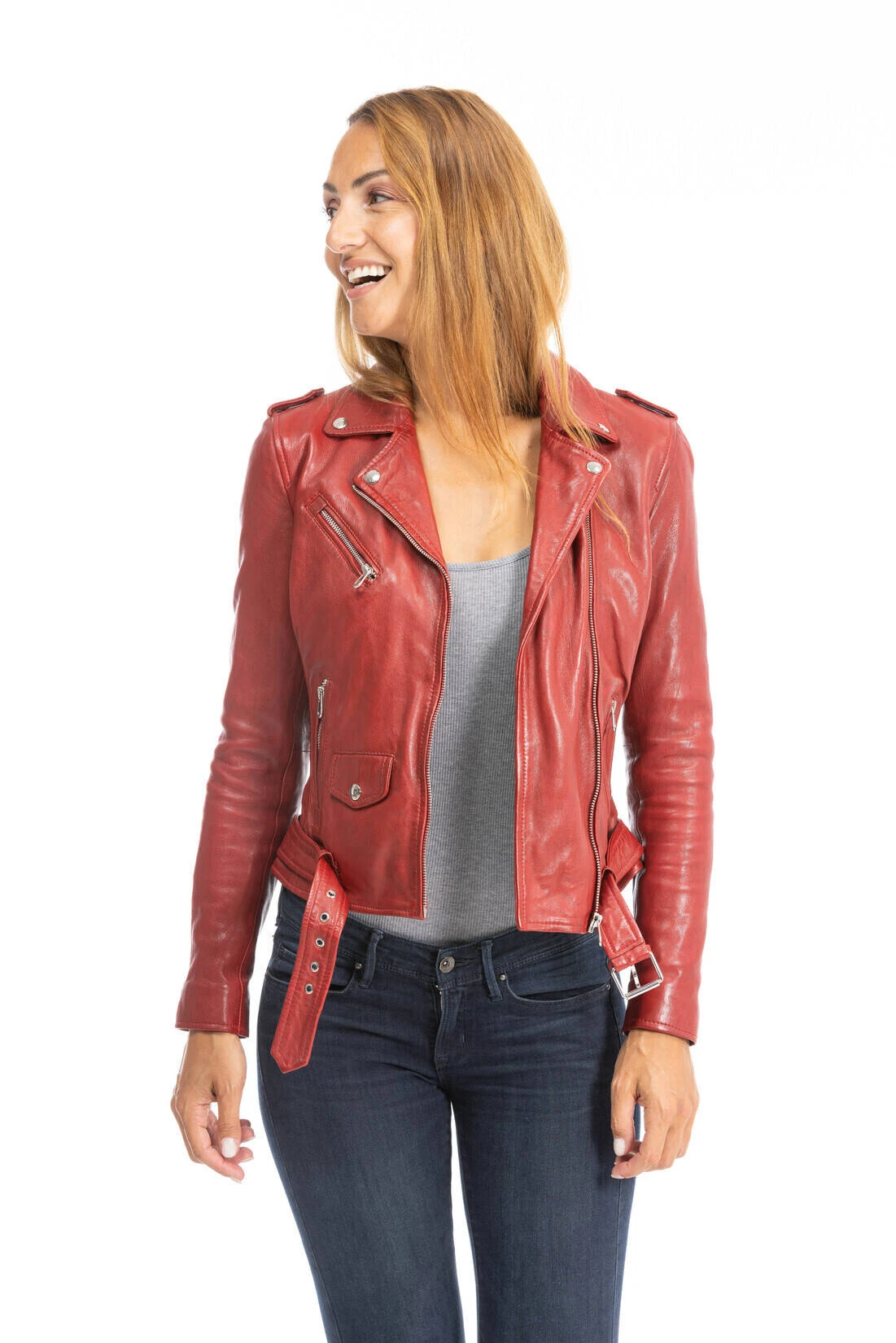 Blouson en cuir d’agneau lavé et ciré , tannage 100 % végétal de la collection Rose Garden .Ce modèle fait partie d’une gamme colorée , son look rock moderne puise son inspiration dans les blousons biker largement visible à travers les détails comme le col tailleur à pressions, la fermeture zippée asymétrique, les pattes d’épaule et la ceinture à la taille avec boucle métallique de serrage. On retrouve également des zips d’aisance en bas de manche. Vous avez 3 poches extérieures zippées et 2 poches intérieures dont 1 zippée . Sa Doublure est en coton inspiration florale et ses manches en polyester.