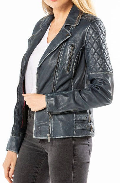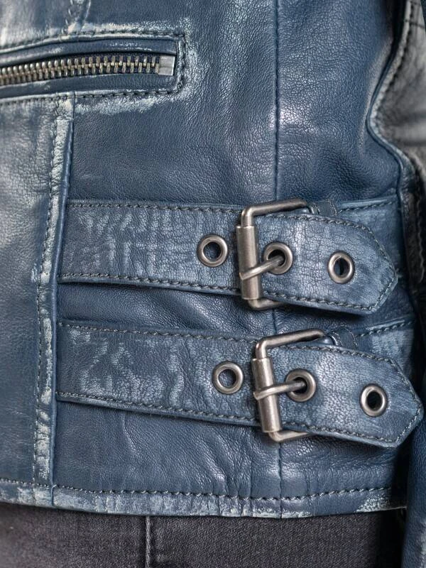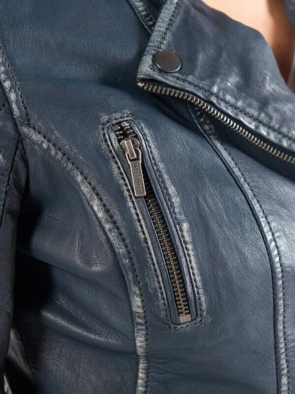 Blouson en cuir d’agneau bleu pour femme en agneau vieilli, très agréable à porter. Son style perf’ est très tendance actuellement et reconnaissable avec son col tailleur et sa fermeture asymétrique. Vous retrouvez sur le blouson cuir 4 poches zippées ( 2 verticales au niveau de la poitrine et 2 horizontales au niveau de la taille). Il arbore une fantaisie surpiquée sur le haut des manches et des épaules . Le blouson de cuir biker est agrémenté de 2 fermetures zippées en bas de manches et de 2 grosses boucles avec pattes de resserrage sur les côtés. Sa doublure est 100 % polyester avec une poche intérieure cachée taille smartphone .