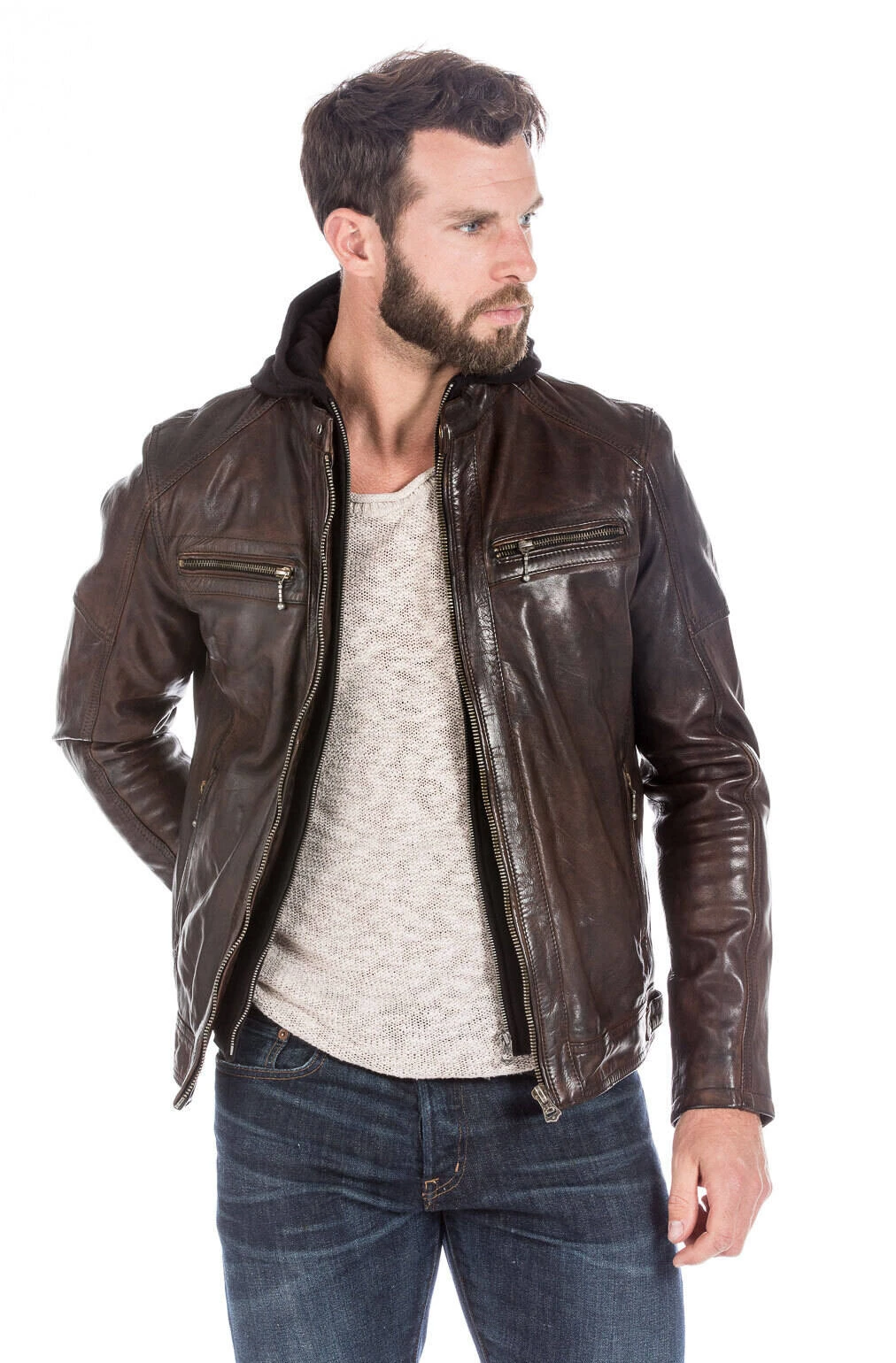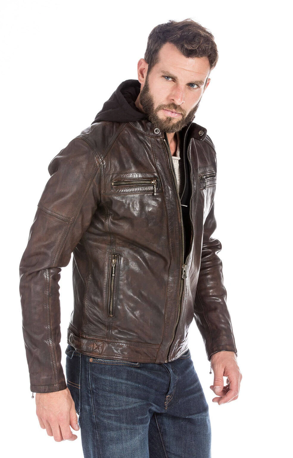 Blouson en cuir d’agneau pour homme dans un aspect vieilli, moderne , tendance. On aime sa coupe style motard avec son col debout court, sa coupe ajustée au corps. Vous avez des poches poitrine zippées, deux biais zippées, elles aussi et enfin des zips d’aisance en bas de manches. Sa doublure est légèrement ouatinée, avec deux poches intérieures, très confortable. Sa capuche est amovible, ce qui vous permet de le mettre en toutes circonstances, avec tous les styles. Comptez une longueur corps de 62 cms sur une taille S.