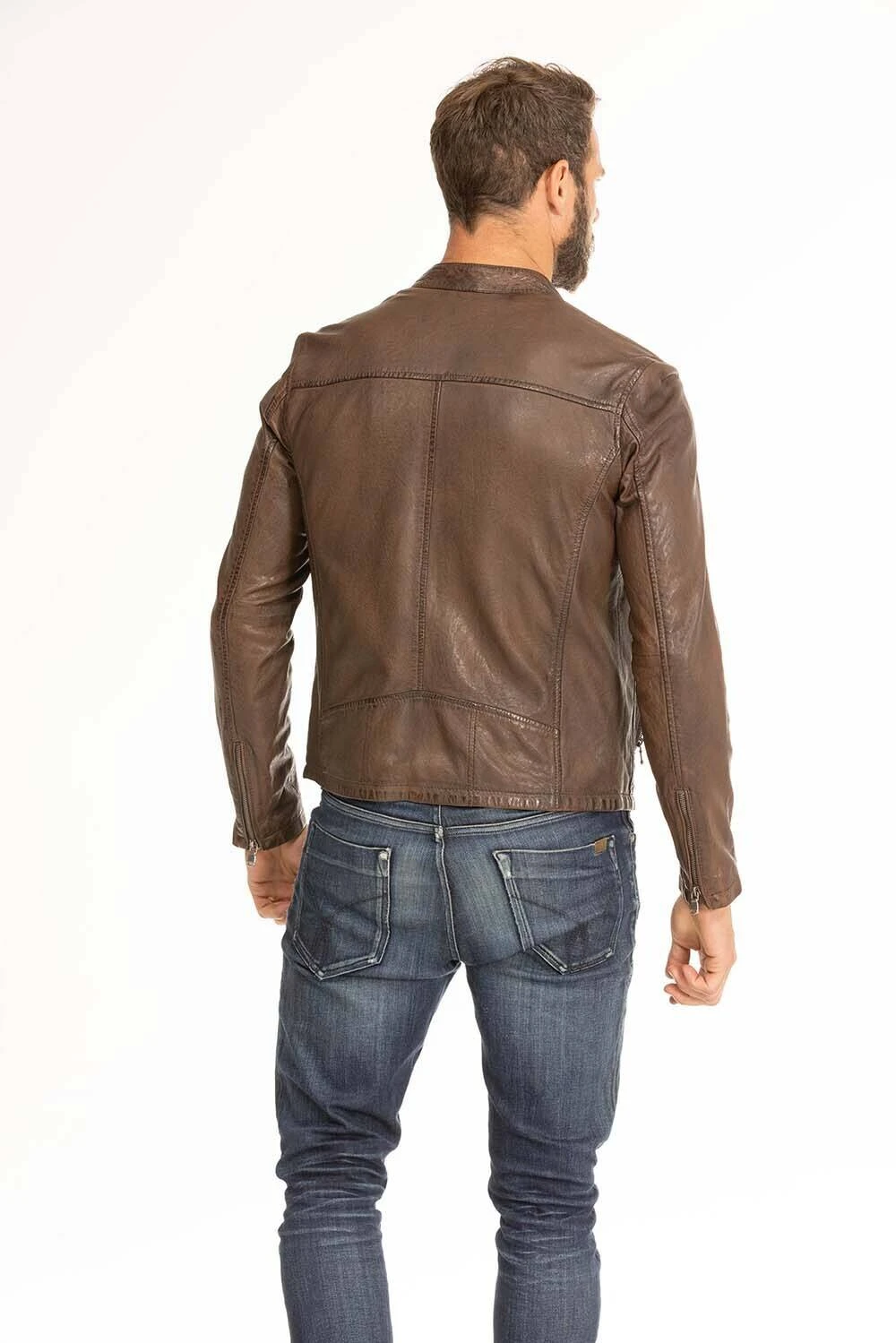 Blouson de cuir en agneau pour homme de la marque Daytona. Il est agréable à porter et est pourvu d’un léger grain qui lui donne un aspect vieilli et vintage. Le col est surmonté d’un col mao style moto et les manches ont une finition avec des fermetures. Le blouson de cuir possède 4 poches extérieures zippées ainsi que 3 poches intérieures : à zip, pression et pour le téléphone. La doublure est en coton au niveau du corps et polyester au niveau des manches.