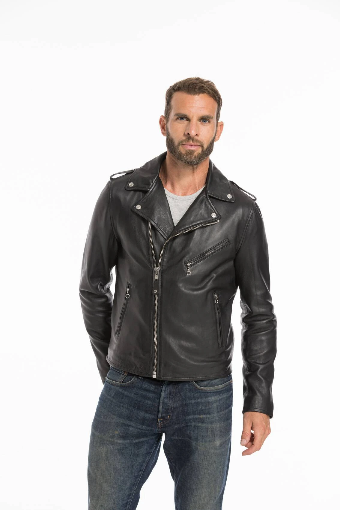 Perfecto LC 1140 noir pour homme de la marque Schott en cuir d’agneau, très souple, léger . Le blouson en cuir est la pièce incontournable du dressing masculin, tout particulièrement le Perfecto. Admirez ce splendide blouson cuir de la marque Schott réputé pour ses perfectos de grandes qualités. On retrouve ici un basique du perfecto avec son col tailleur à pressions, ses pattes d’épaules, sa fermeture par zip de légèrement de coté, ses 3 poches zippées. Attention, vous le remarquerez ce modèle ne dispose pas de ceinture au niveau de la taille . De plus, ce blouson cuir est en cuir d’agneau pleine fleur, aspect lisse uniforme, on retrouve donc un cuir souple, léger tout le contraire de l’original 618 Schott qui est en cuir très épais, rigide. Ce perfecto sera très agréable en intersaison. Portez un perfecto cuir, c’est montrer son coté viril. Coté look ce blouson cuir supporte aussi bien le classique que l’originalité. Pour un style casual chic, misez sur une association jean brut / pull au contraire si vous cherchez un style plus moderne , branché, préférez une chemise à motif ou encore un sweat à capuche .