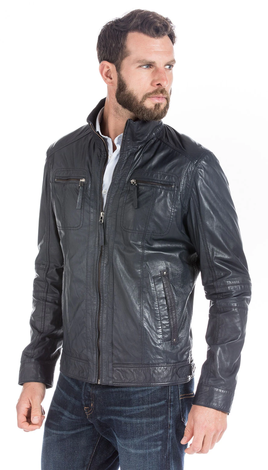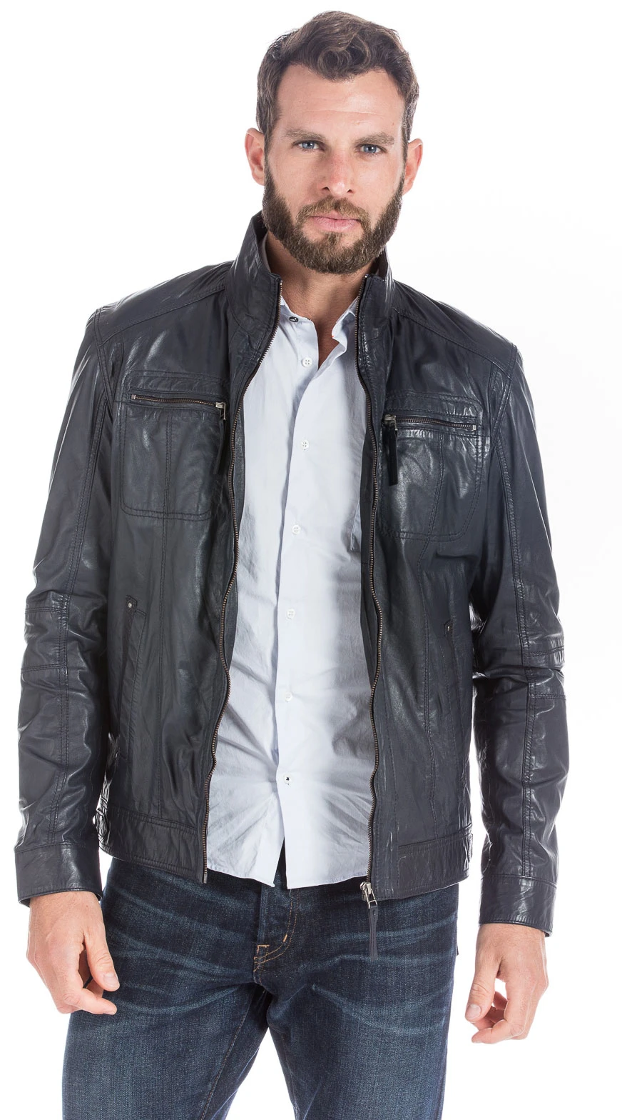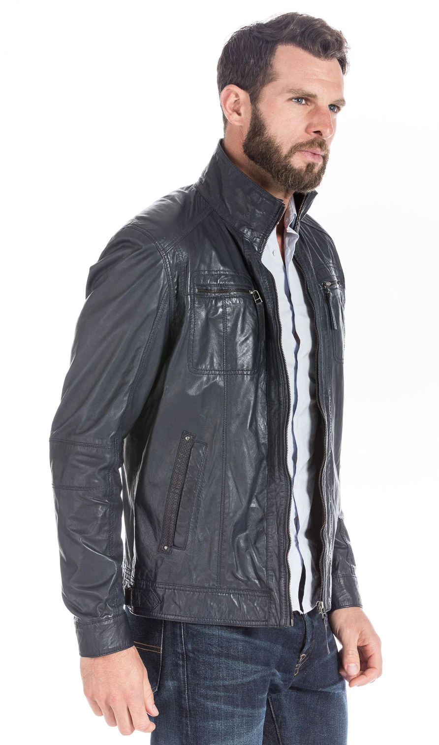Blouson en cuir pour homme idéal pour la mi saison . On découvre un joli blouson en cuir d’agneau, il est très souple, léger, très fin. Assez classique, ce blouson est très facile à porter et associer, il possède un col chemise, une fermeture centrale. Sur le devant , vous avez deux poches zippées en poitrine, deux poches biais. Il est joliment travaillé avec ses nombreuses surpiqures, finitions. Sa doublure reste très confortable, assez fine en polyester, très pratique vous avez deux poches intérieures, pour vos effets personnels. Sa coupe est droite, confort, assez couvrant, comptez une longueur corps de 68 cms de la base du col au bas du blouson. Comptez une longueur corps de 67 cms sur une taille 50.