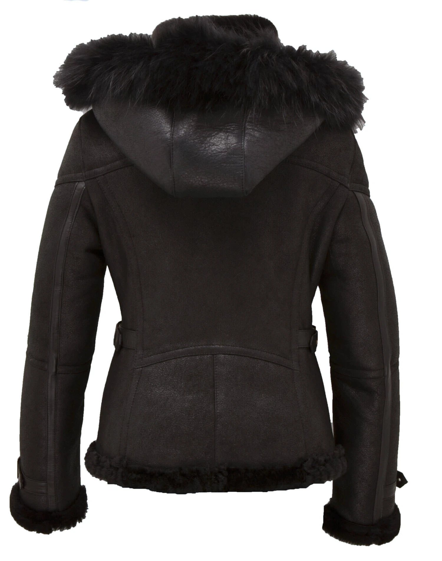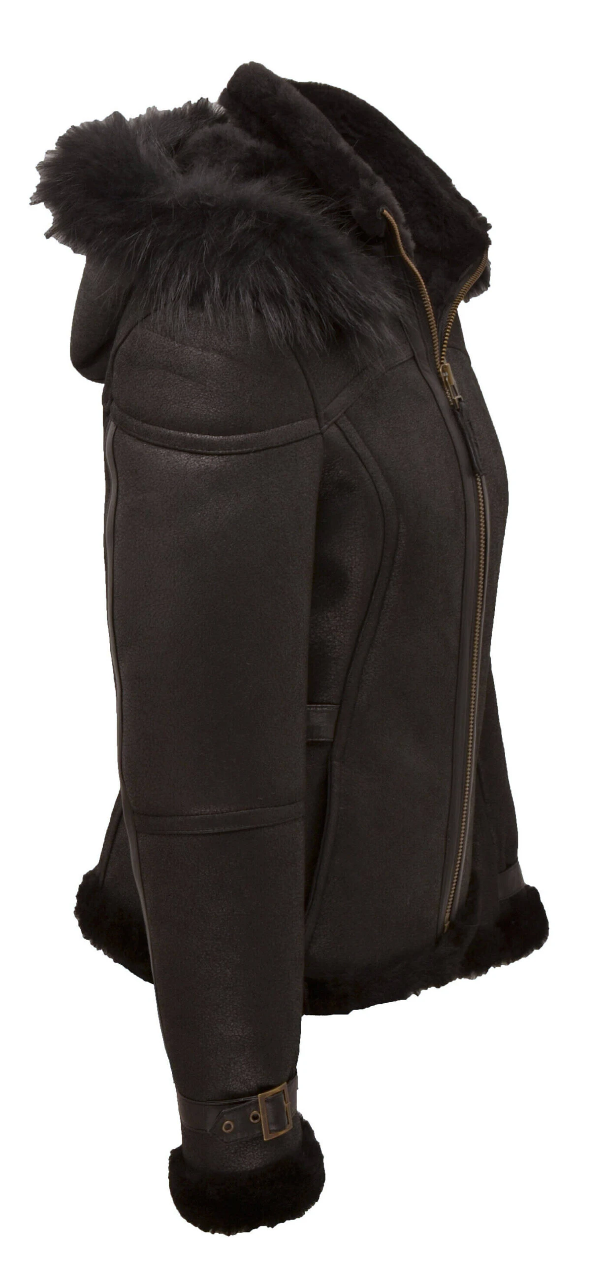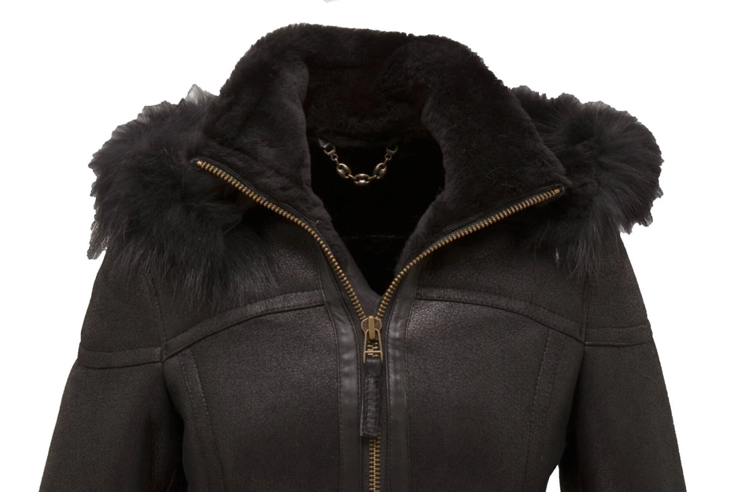 Blouson en cuir de mouton pour femme dans un esprit bombardier assez féminin. On retrouve une capuche amovible avec une bordure en renard véritable . Le blouson cuir se ferme par une fermeture zippée centrale qui remonte jusqu’à la capuche. Ce produit est indispensable pour l’hiver , vous avez la fourrure du mouton qui se trouve à l’intérieur du blouson , très chaud et agréable à porter . Le cuir extérieur a un aspect légèrement patiné , vieilli, la coupe est très ajusté au corps. Si vous aimez le style bombardier , tout en restant assez féminin, ce blouson cuir mouton devrait vous séduire .