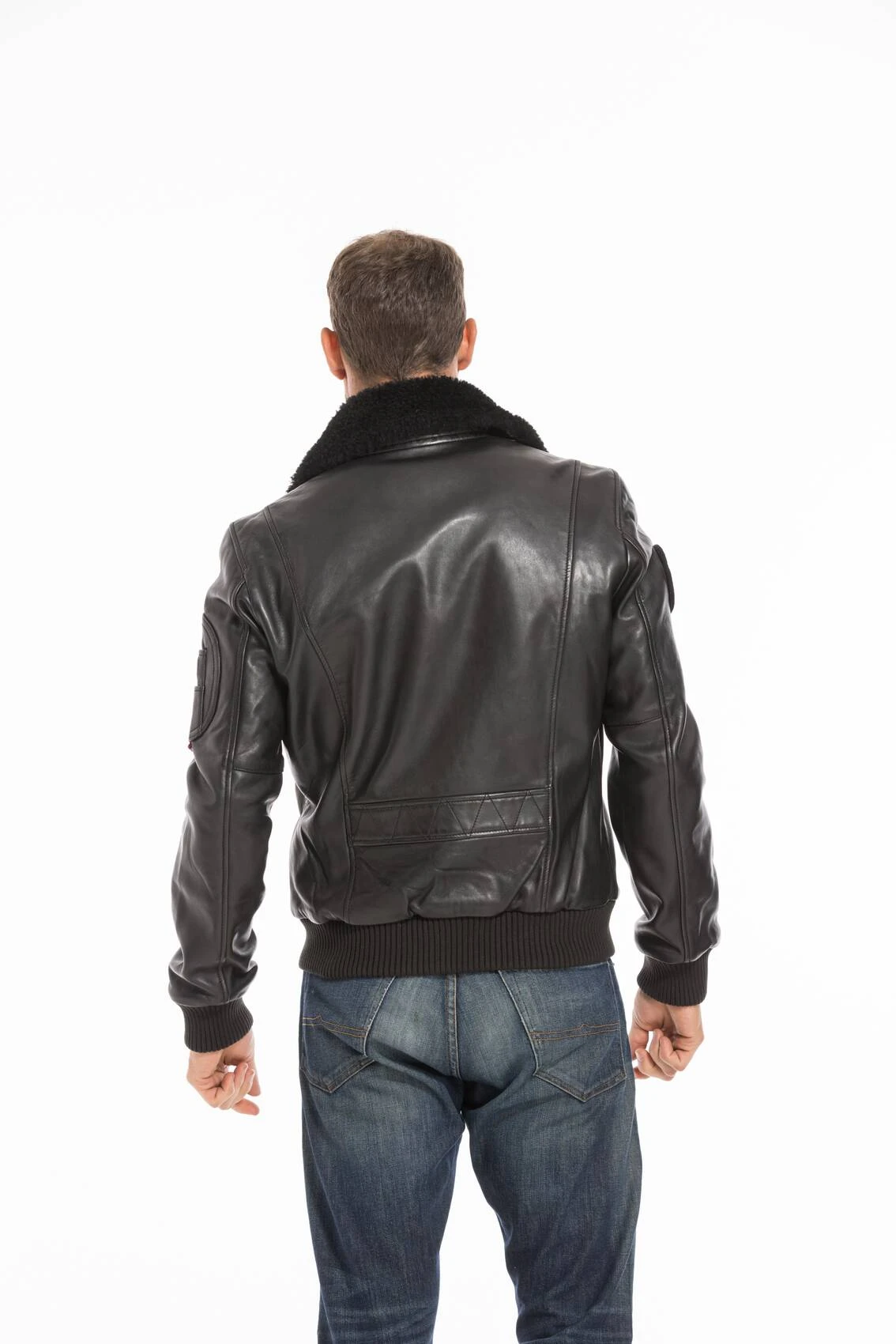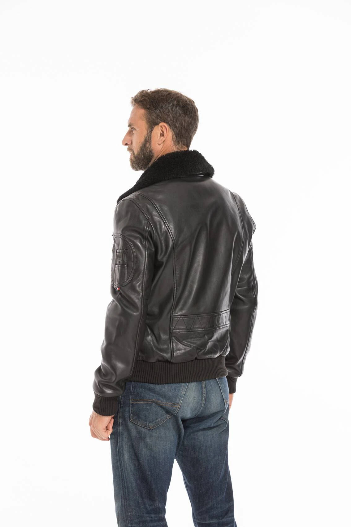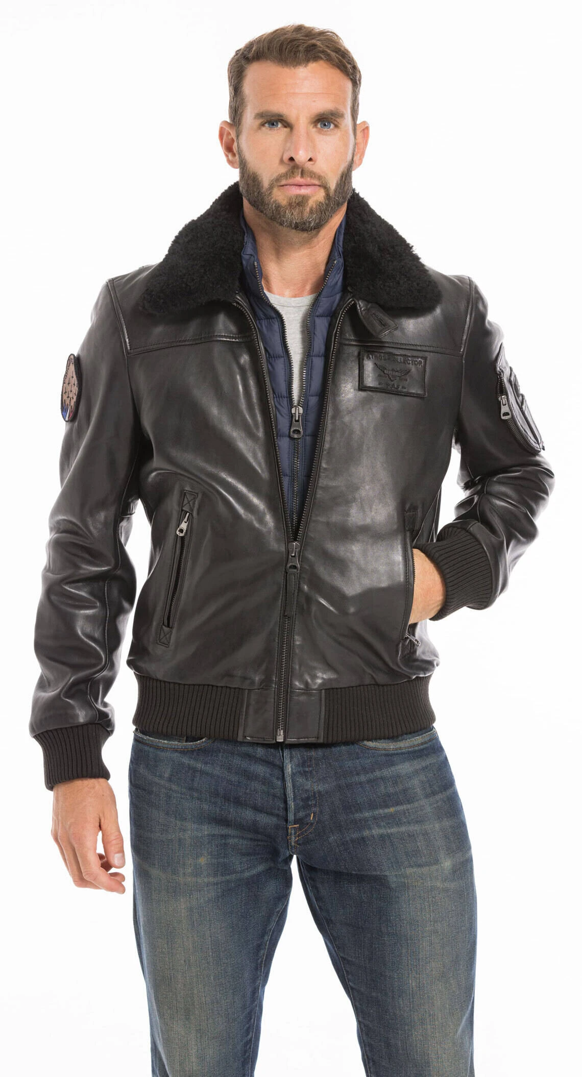 Blouson en cuir d’agneau noir. Ce modèle fait parti de la collection patrouille de France, il arbore une multitude de détails emblématiques. Vous avez un badge brodé » Patrouille de France » sur la manche droite et une poche en cuir » aviateur français » sur la manche gauche. C’est un incontournable pour votre dressing, une coupe célèbre, produit intemporel et chaud. Son col chemise en fourrure ton sur ton apporte une touche raffinée et élégante. Petit plus, celui ci est amovible par boutons, vous pouvez ainsi choisir de le mettre ou non en fonction de votre sortie. Le col est en fourrure de mouton véritable, une fois retiré il laisse apparaitre un col chemise en cuir. On aime son style aviateur avec une coupe cintrée, ses bords-côte aux poignets et à la ceinture, une fermeture centrale. Sur le devant, vous avez 2 poches biais zippées, un écusson à scratch sur la poitrine. Et comment résister à son impressionnante doublure en coton, ouatinée polyester, décorée d’un imprimé Patrouille de France collector. Celle ci possède 2 poches intérieures zippées , pratique pour vos effets personnels. Il y a également une parmenture effet doudoune détachable à l’aide d’un zip. La patrouille de France fait confiance à la marque depuis plusieurs années pour l’élaboration de ses blousons aviateurs en cuir, qui apporte à ses pilotes style et confort .