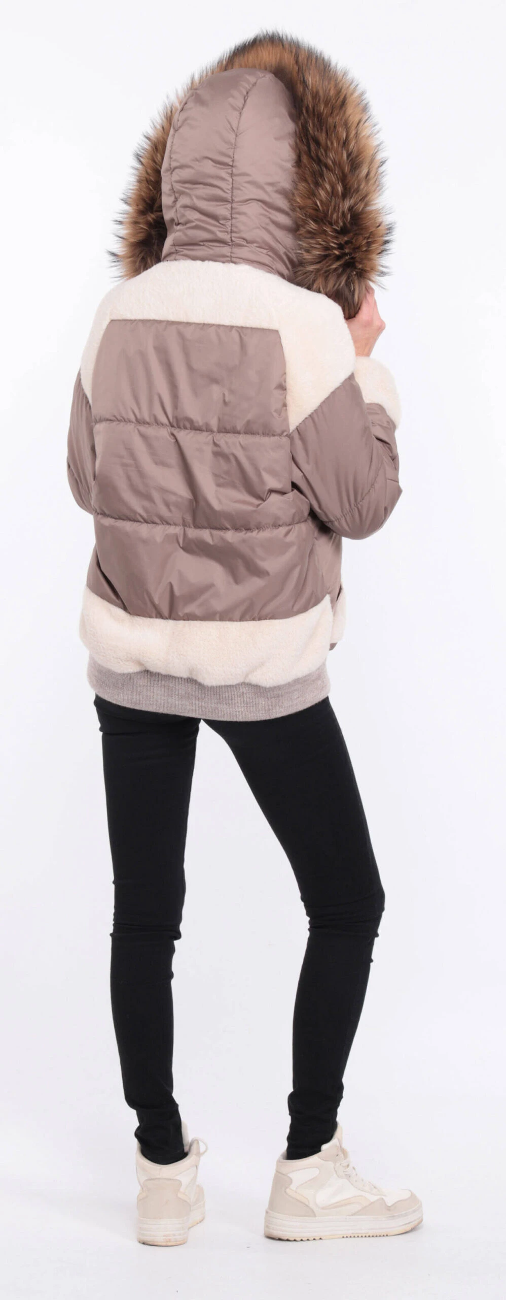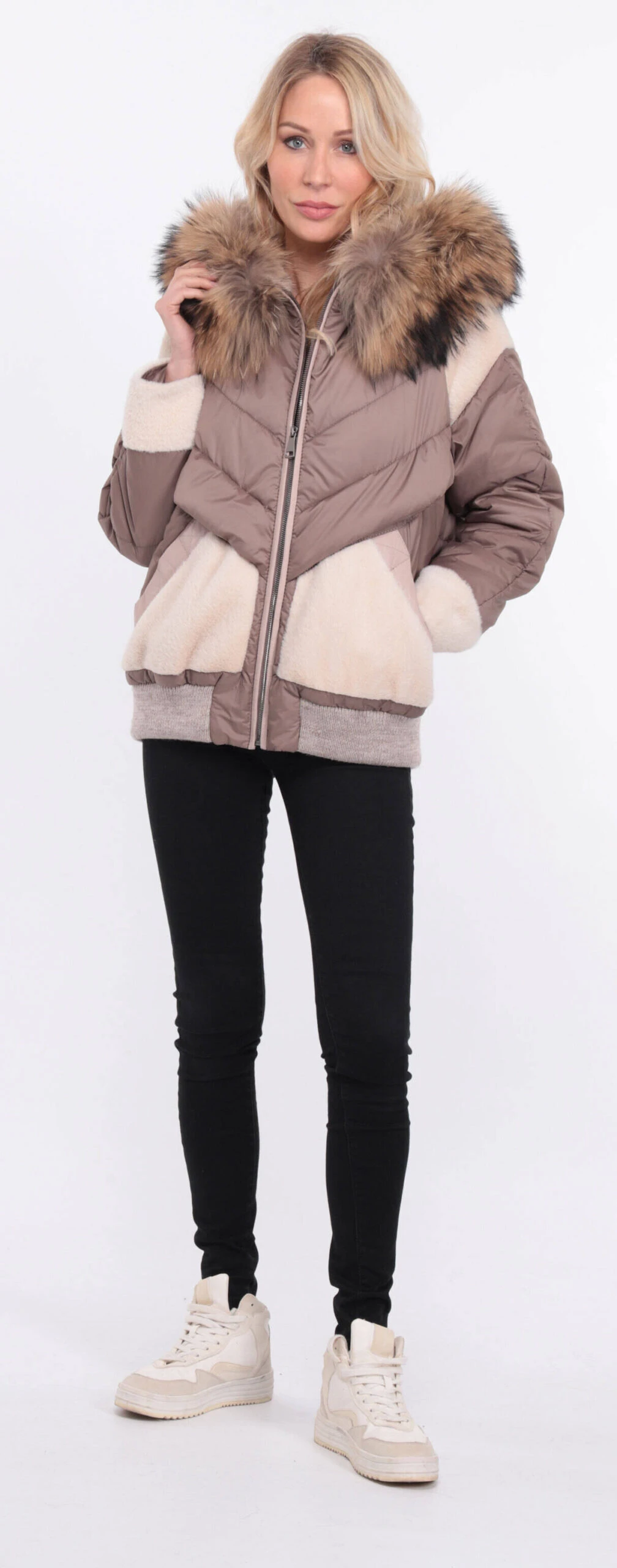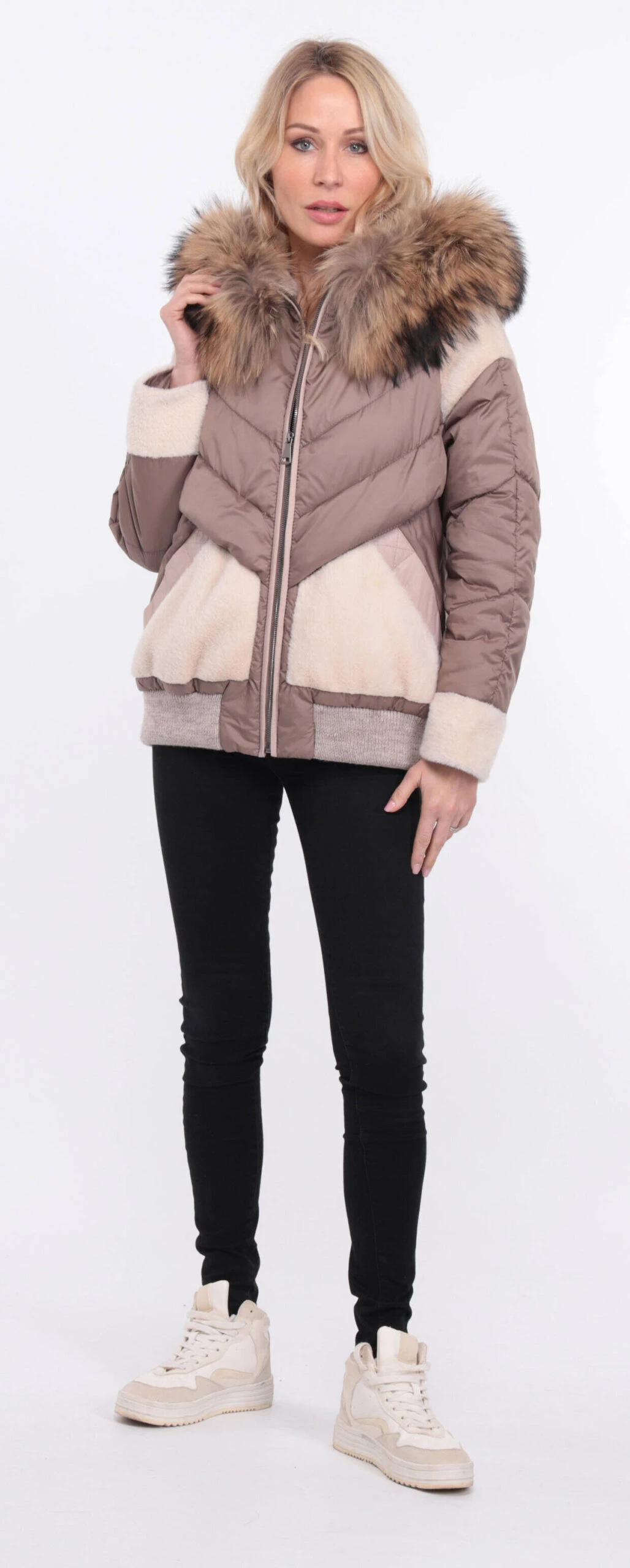 Blouson long pour femme dans un look doudoune , sport. Vous avez un mix de matières et couleurs sur ce joli blouson long. En effet, vous avez principalement du tissu au niveau du corps , avec un peu de laine de mouton au niveau des poches , bas de manches, épaules, bas du dos. De plus , on retrouve une fourrure de renard qui borde la capuche . Le blouson est resserré au niveau de la taille par un bord côte, il se ferme à l’aide d’un zip droit. Vous avez une capuche fixe, chaud pour l’hiver.