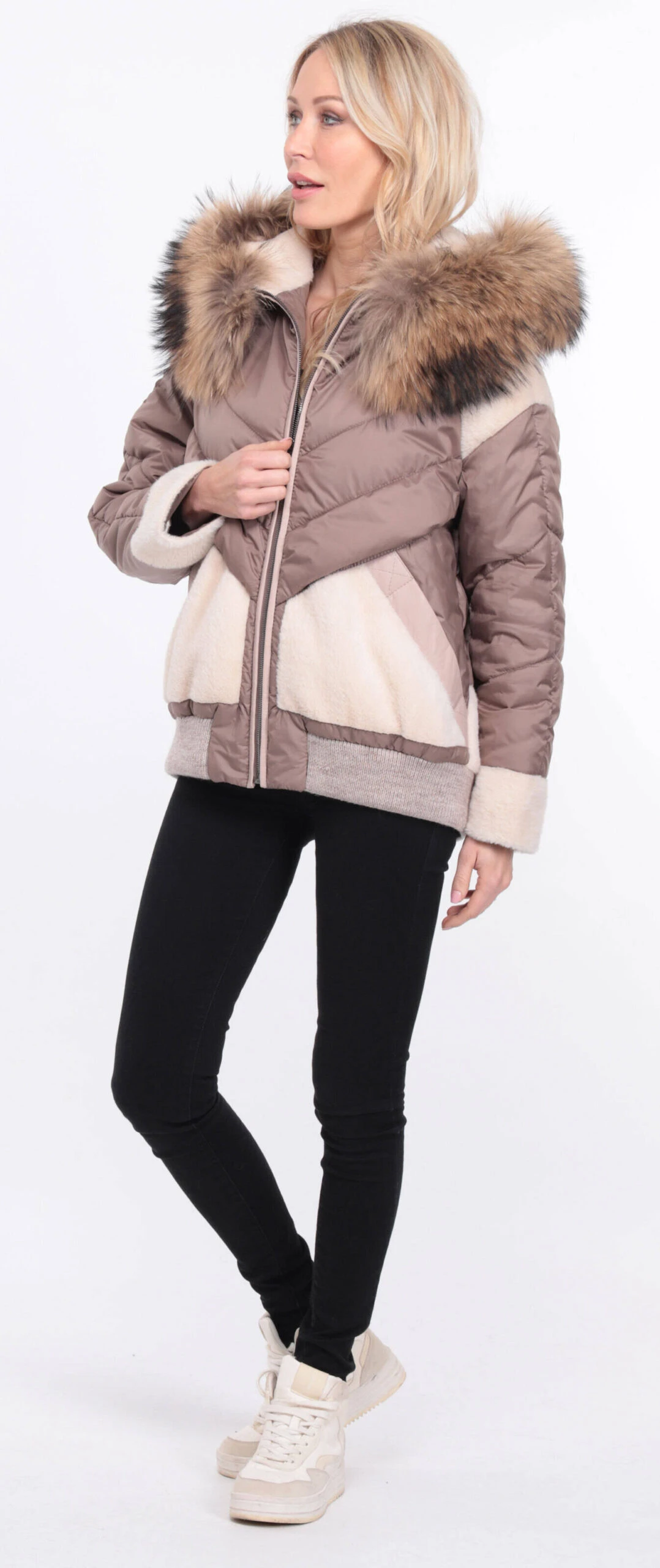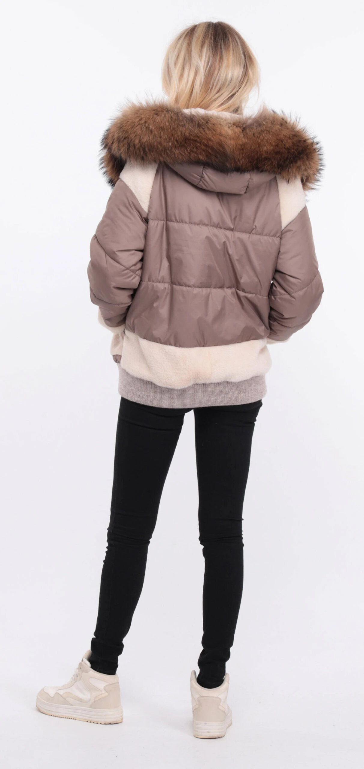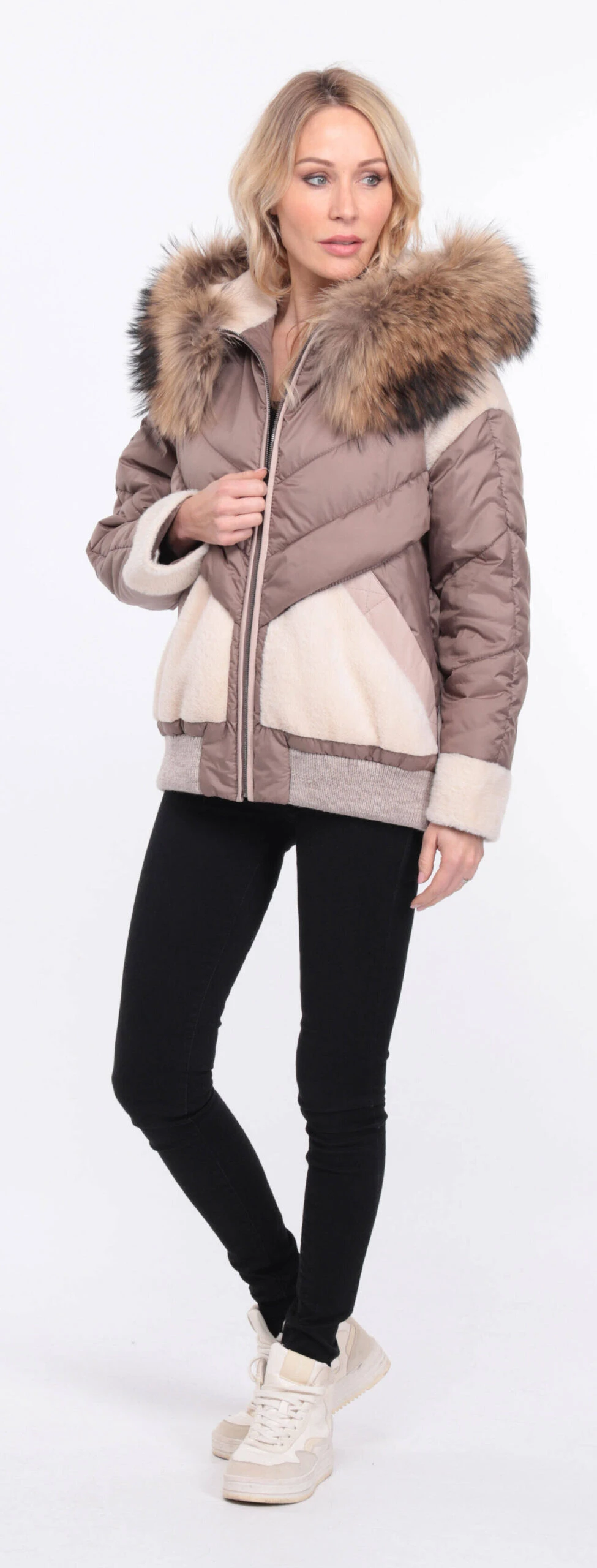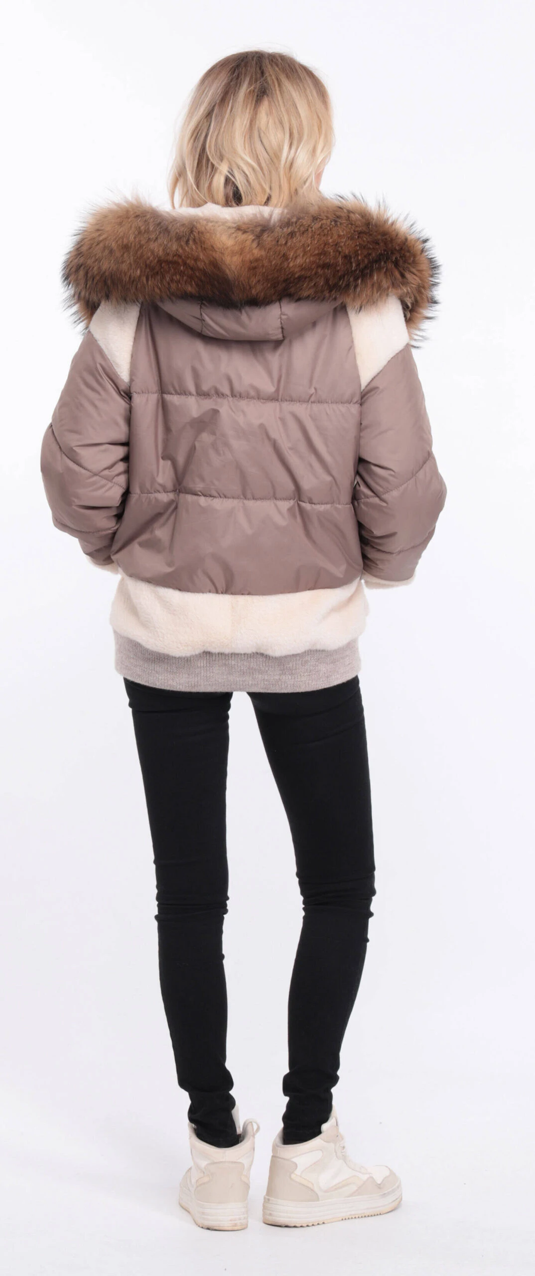 Blouson long pour femme dans un look doudoune , sport. Vous avez un mix de matières et couleurs sur ce joli blouson long. En effet, vous avez principalement du tissu au niveau du corps , avec un peu de laine de mouton au niveau des poches , bas de manches, épaules, bas du dos. De plus , on retrouve une fourrure de renard qui borde la capuche . Le blouson est resserré au niveau de la taille par un bord côte, il se ferme à l’aide d’un zip droit. Vous avez une capuche fixe, chaud pour l’hiver.