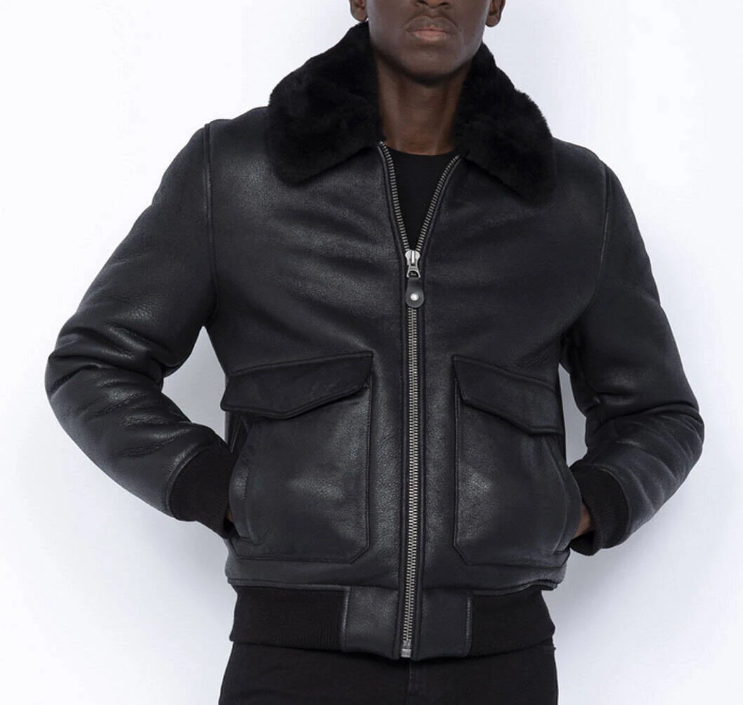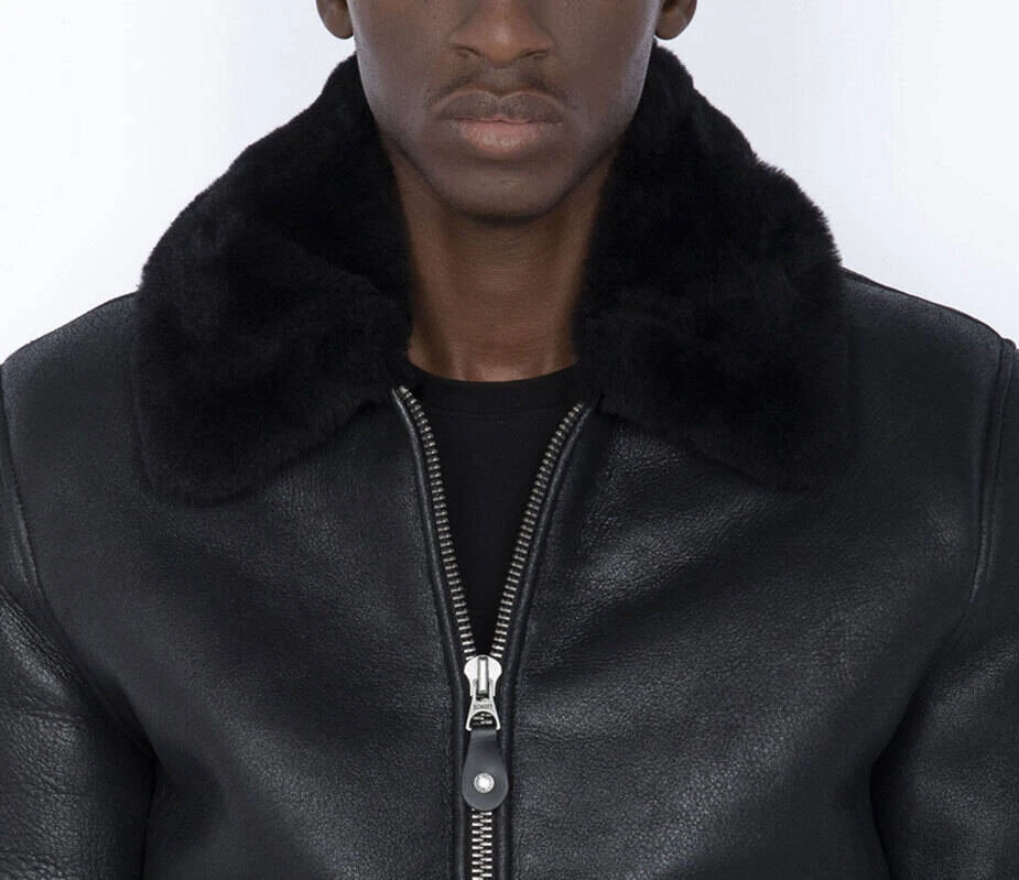 Blouson en cuir de mouton retourné pour homme de la collection Schott automne/ hiver. On aime son look à la fois bombardier et pilote . Il est très chaud pour l’hiver, vous avez la laine du mouton à l’intérieur et le cuir à l’extérieur,il s’agit d’une seule et même peau . Le col est de forme chemise tout en mouton , le blouson se ferme par un zip droit. Vous avez du bord côte au niveau de la taille et des bas de manches. Sur l’avant, il y a deux grandes poches plaquées à rabat et ouvertes sur le coté .