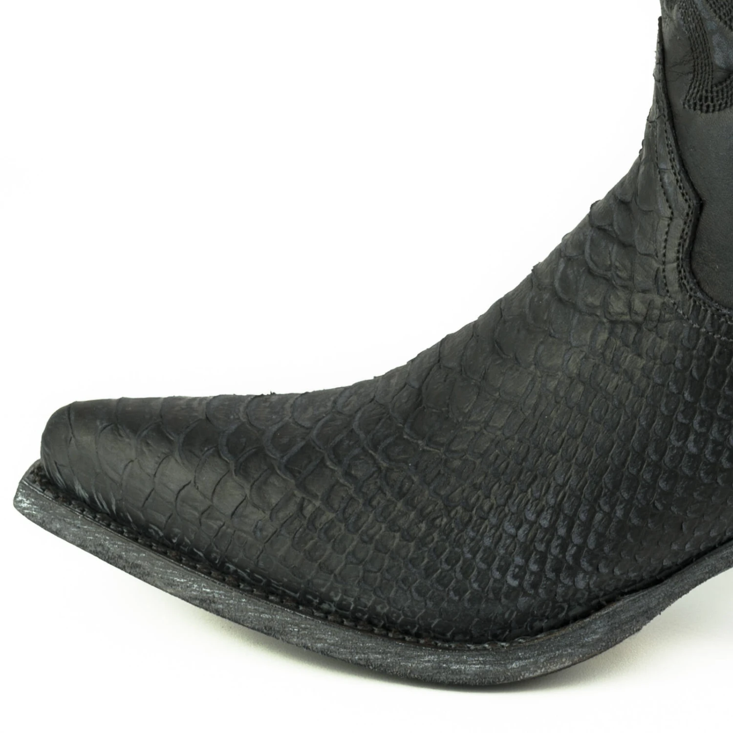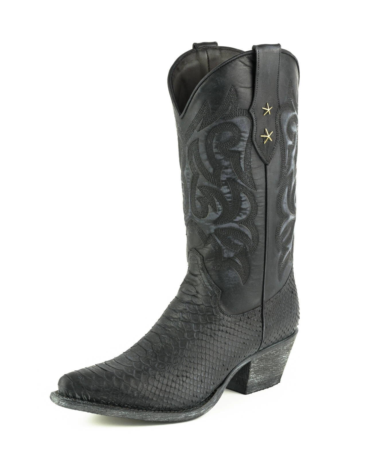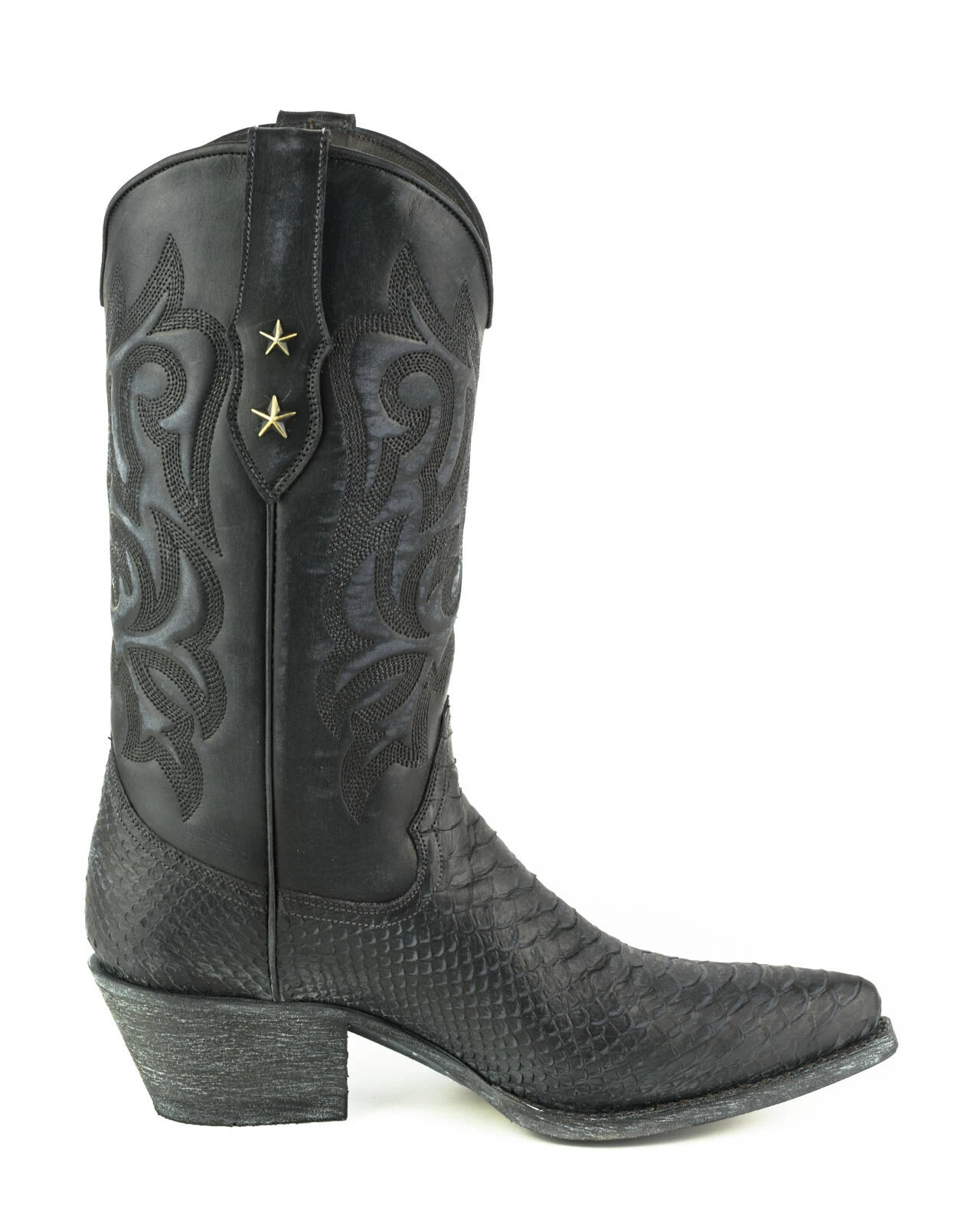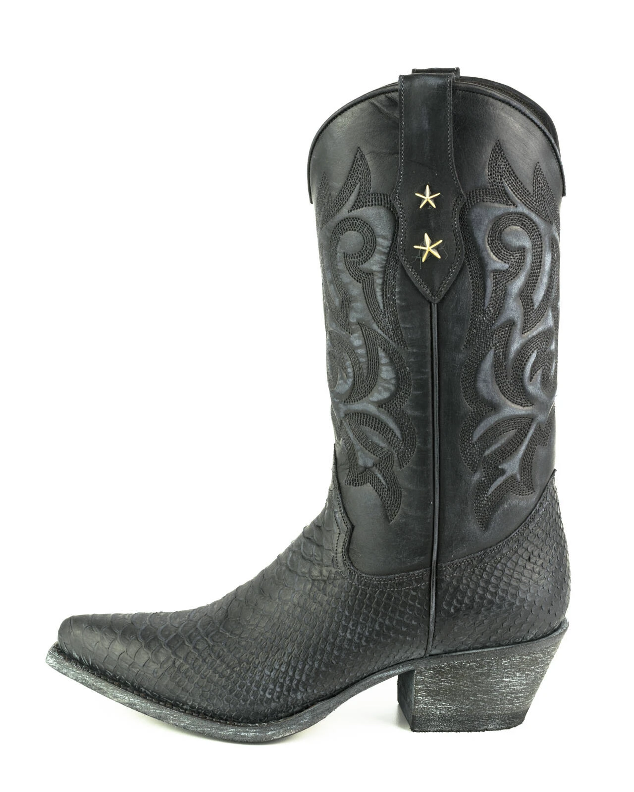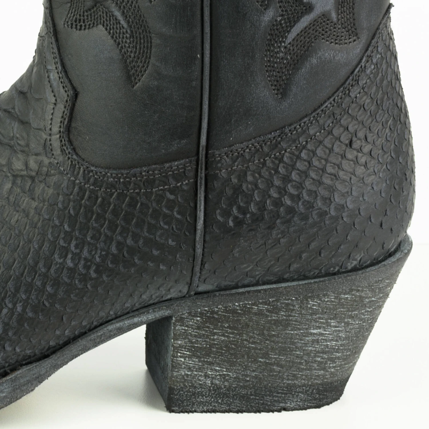 Boots en cuir de vachette pour femme de la marque Mayura. Elles sont entièrement faites à la main avec du cuir de qualité supérieure. On aime son look vintage avec son aspect patiné, vieilli, il y a un imprimé python original sur le bas de la boots .La tige est