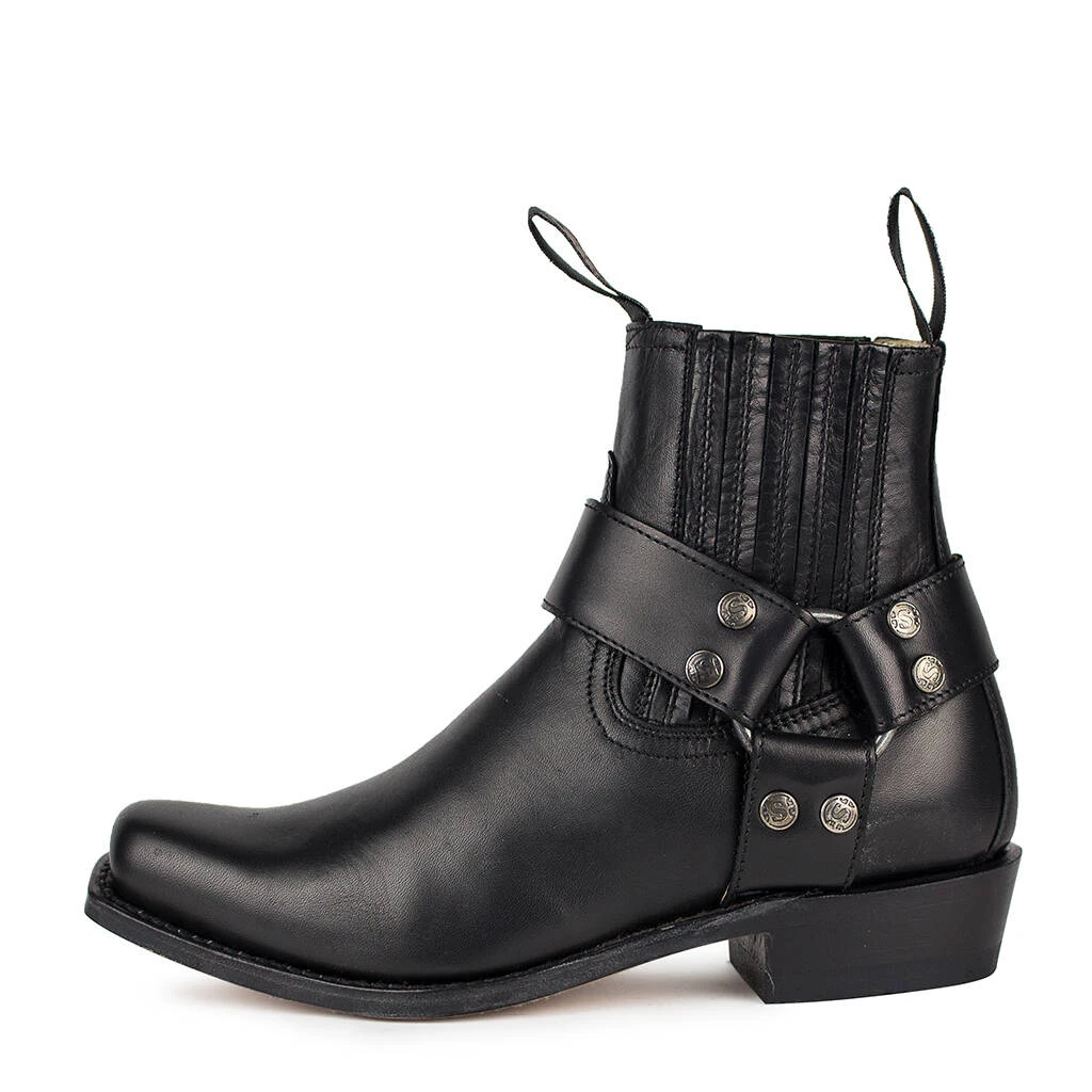 Boots en cuir de vachette noir dans un aspect vieilli patiné pour homme et femme de la marque Sendra. De forme basse, vous avez une ouverture élastiquée et les tires mains pour vous faciliter le passage du pied et une bonne prise en main . Vous avez un harnais fixe sur la cheville , son talon est droit et le bout est carré assez fin . La semelle est elle aussi en cuir, il faut faire poser un patin chez un cordonnier .