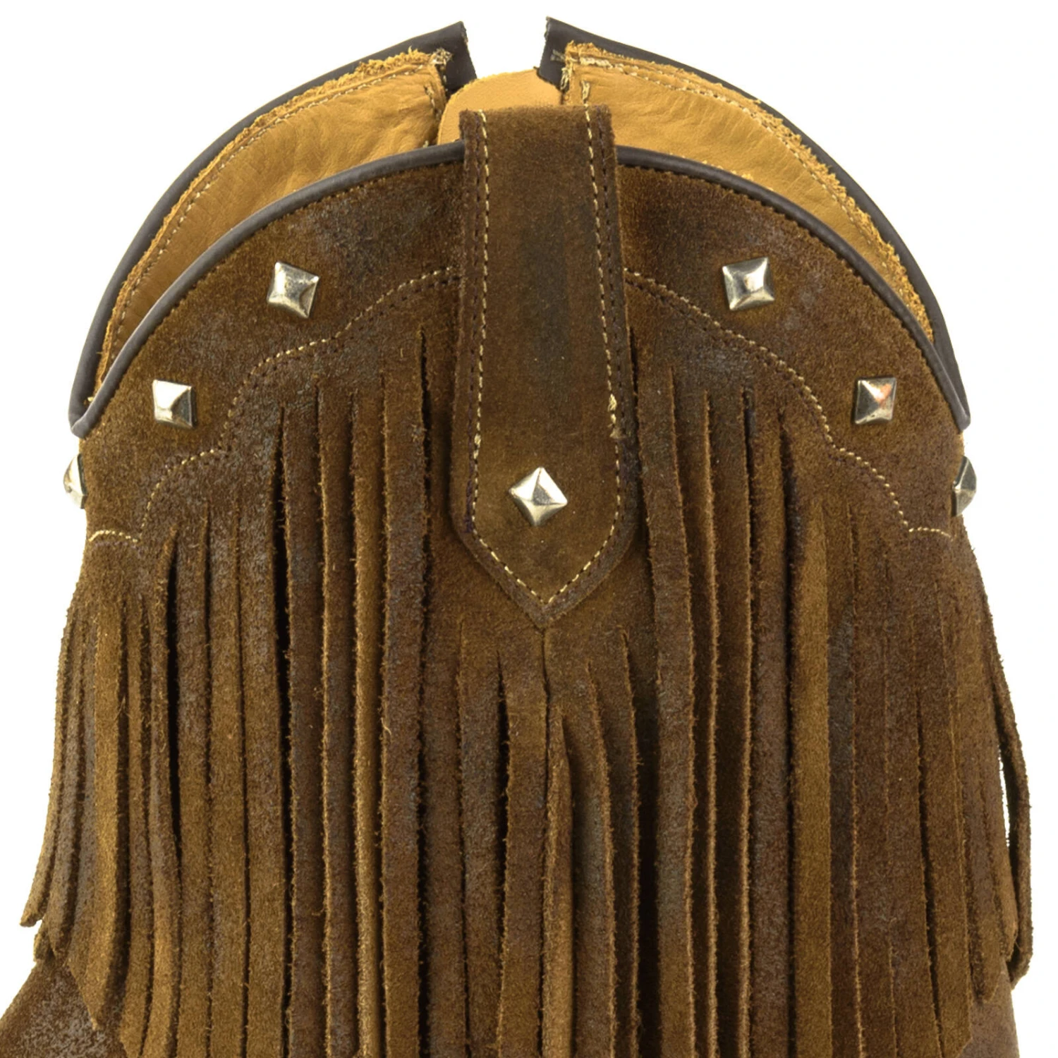 Boots en cuir vieilli de vachette aspect vintage pour femme . On aime son look western avec ses franges et ses ornements en métal tout en restant sur un look fashion urbain remis au goût du jour pour un usage intemporel . Vous avez des tires mains sur les cotés pour vous aider à les enfiler.Avec une semelle en cuir abrasif pour une adhérence maximale et fabriquée avec le système GOODYEAR Welted, qui assure la durabilité de la botte et un excellent confort.Le talon est assez droit, il y a un zip sur le coté pour vous faciliter le passage du pied . Comptez un talon de 5 cm et une hauteur de boot de 20 cm.