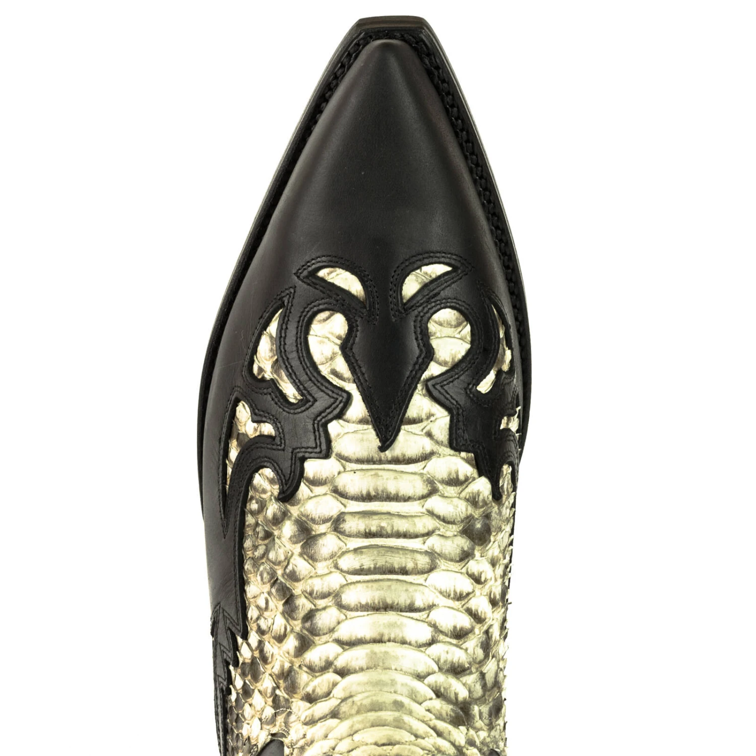 On craque sur ces splendides bottes de la marque Mayura. Stylée avec son dessus de pied en peau de python naturel. Elle est en cuir de vachette huilé de qualité supérieure. Les bottes ont une double semelle en cuir, elles sont fabriquées à la main avec le système de couture reconnu GOODYEAR, qui garantit la durabilité de la chaussure et un excellent confort.Le talon est légèrement biseauté et fait une hauteur de 4cms. Le résultat est une botte de cowboy spectaculaire qui est un incontournable.