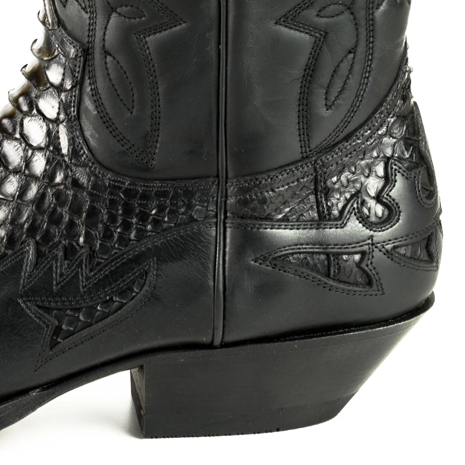 On craque sur ces splendides bottes de la marque Mayura. Stylée avec son dessus de pied en peau de python naturel. Elle est en cuir de vachette huilé de qualité supérieure. Les bottes ont une double semelle en cuir, elles sont fabriquées à la main avec le système de couture reconnu GOODYEAR, qui garantit la durabilité de la chaussure et un excellent confort.Le talon est légèrement biseauté et fait une hauteur de 4cms. Le résultat est une botte de cowboy spectaculaire qui est un incontournable.