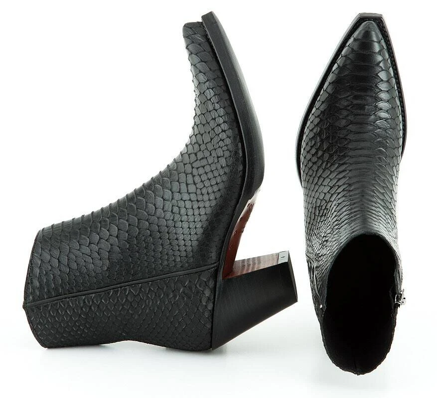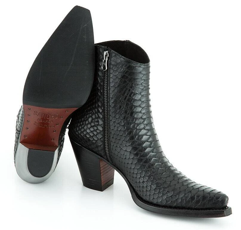 Splendide bottine en cuir de vachette nappa noir imitation peau de python, le cuir est râpé afin d’obtenir cet effet python, ce qui lui donne un rendu vieilli .Boots esprit western haut de gamme, la coupe country est élégante et l’imitation python noir est magnifique, elles allient confort, résistance et élégance. Elles sont fabriquées en Espagne par la marque Sancho et Mayura . Ces bottines luxueuses sont fabriquées artisanalement à l’unité à la main.Ce modèle de boots country est chic et élégant,les semelles intérieures confort sont en cuir, les semelles extérieures sont en cuir cousues Goodyear Welted. Inspiration masculine féminisée par un joli talon de 8 cms de hauteur. Cette boots très fine se mariera à merveille avec toutes vos tenues. Elégance et sobriété, avec toujours la qualité de fabrication Sancho Abarca Boots. Elles sont très confortable, ont de très belles finitions . On aime son coté fin, sobre, qui lui donne une grande classe. Cette bottine cuir est très féminine, sexy et fashion en imitation python noir. On retrouve donc un talon haut, son bout pointu et sa tige courte, elle saura mettre vos jambes en valeur. Vous avez une fermeture afin de vous faciliter la mise en place de votre pied, plus confortable . La forme est bien actuelle, racée et sport chic, quelle allure pour cette incontournable dont la beauté en fait une reine, elle s’adapte avec tout et se porte en de multiples occasions, mais sans jamais passer inaperçue. Son aspect imitation python lui offre un rendu exceptionnel qui saura vous démarquer en toute occasions. L’intérieur de la bottine est doublé en cuir, la très belle coupe de la boots santiag vous procurera style et confort.