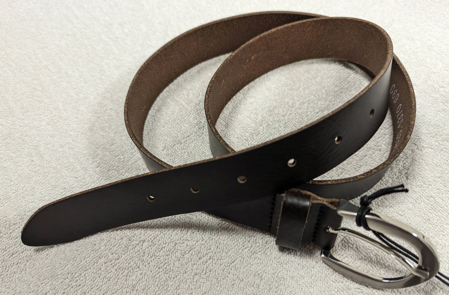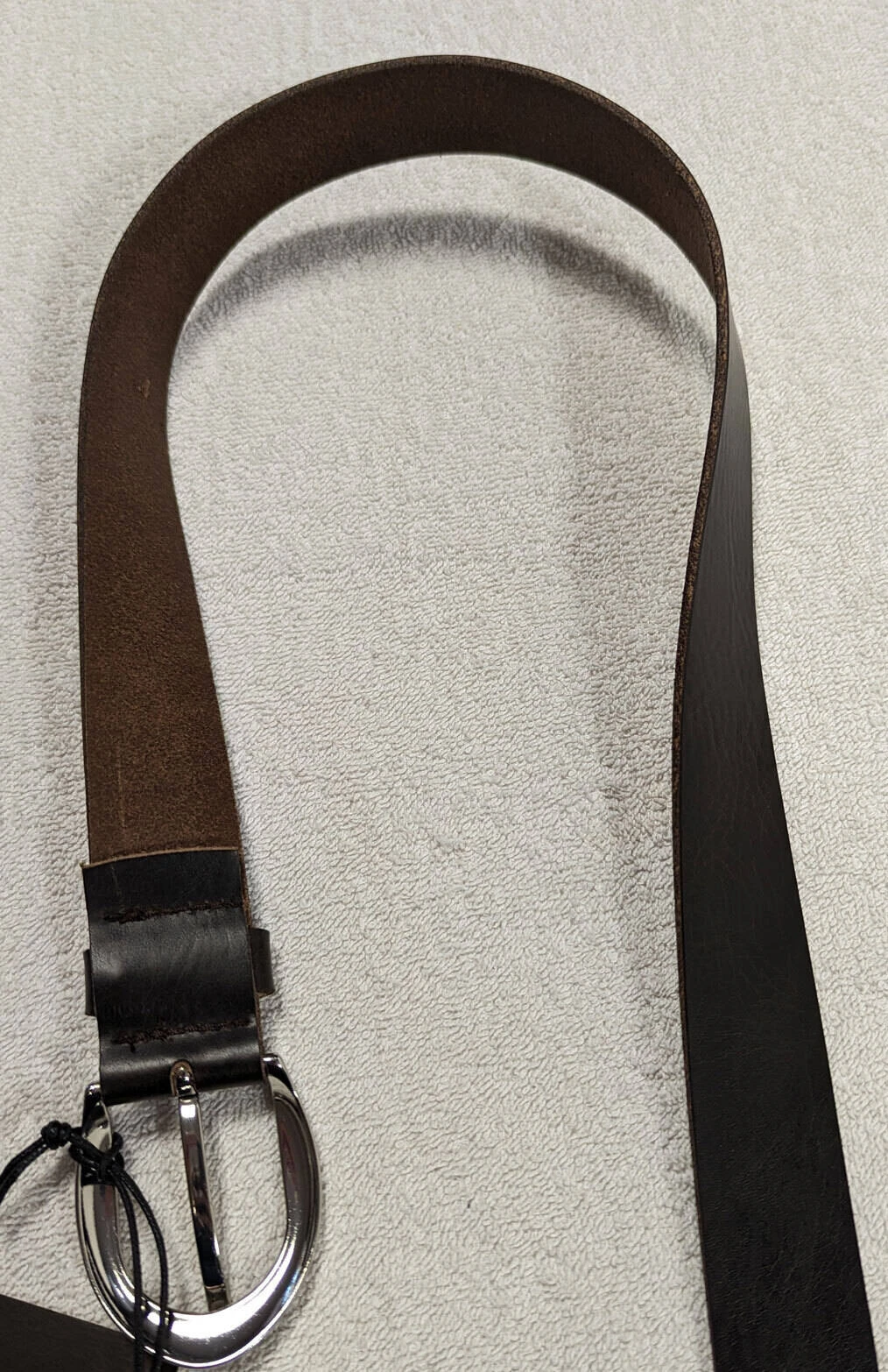 Ceinture cuir femme marron fonce , boucle arrondie de couleur argent , un passant, sans surpiqures, très souple