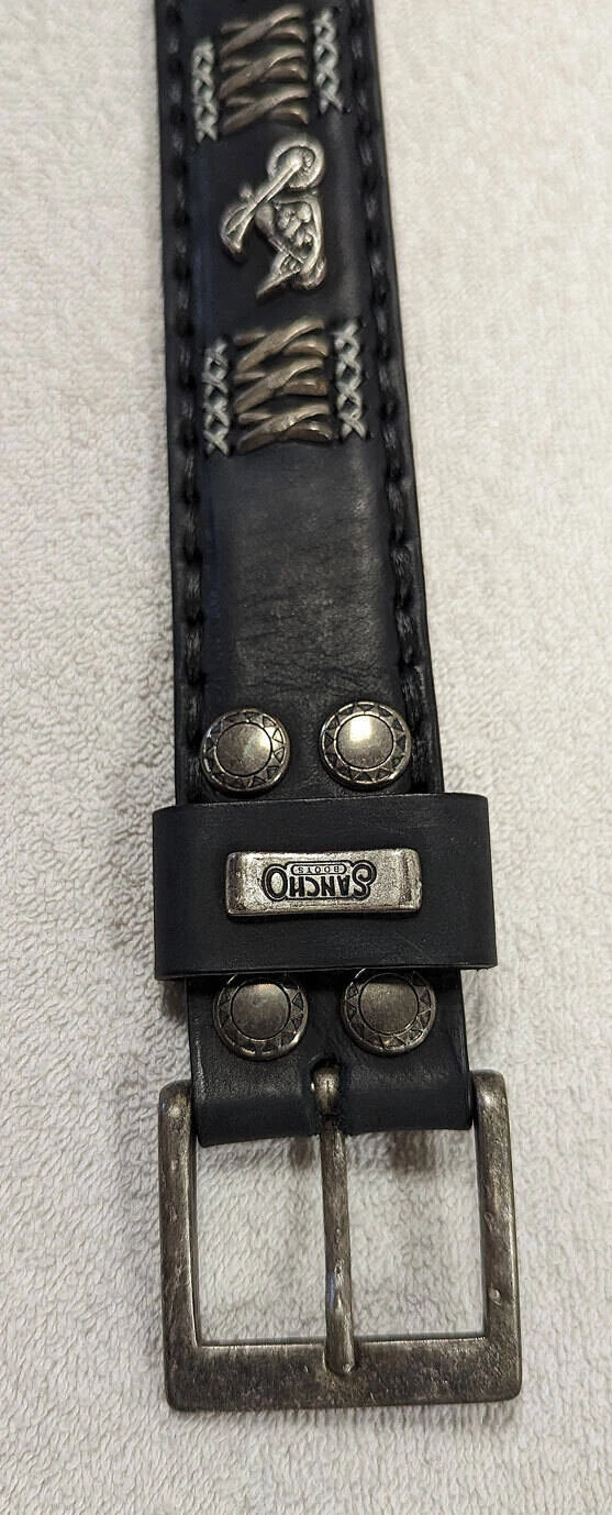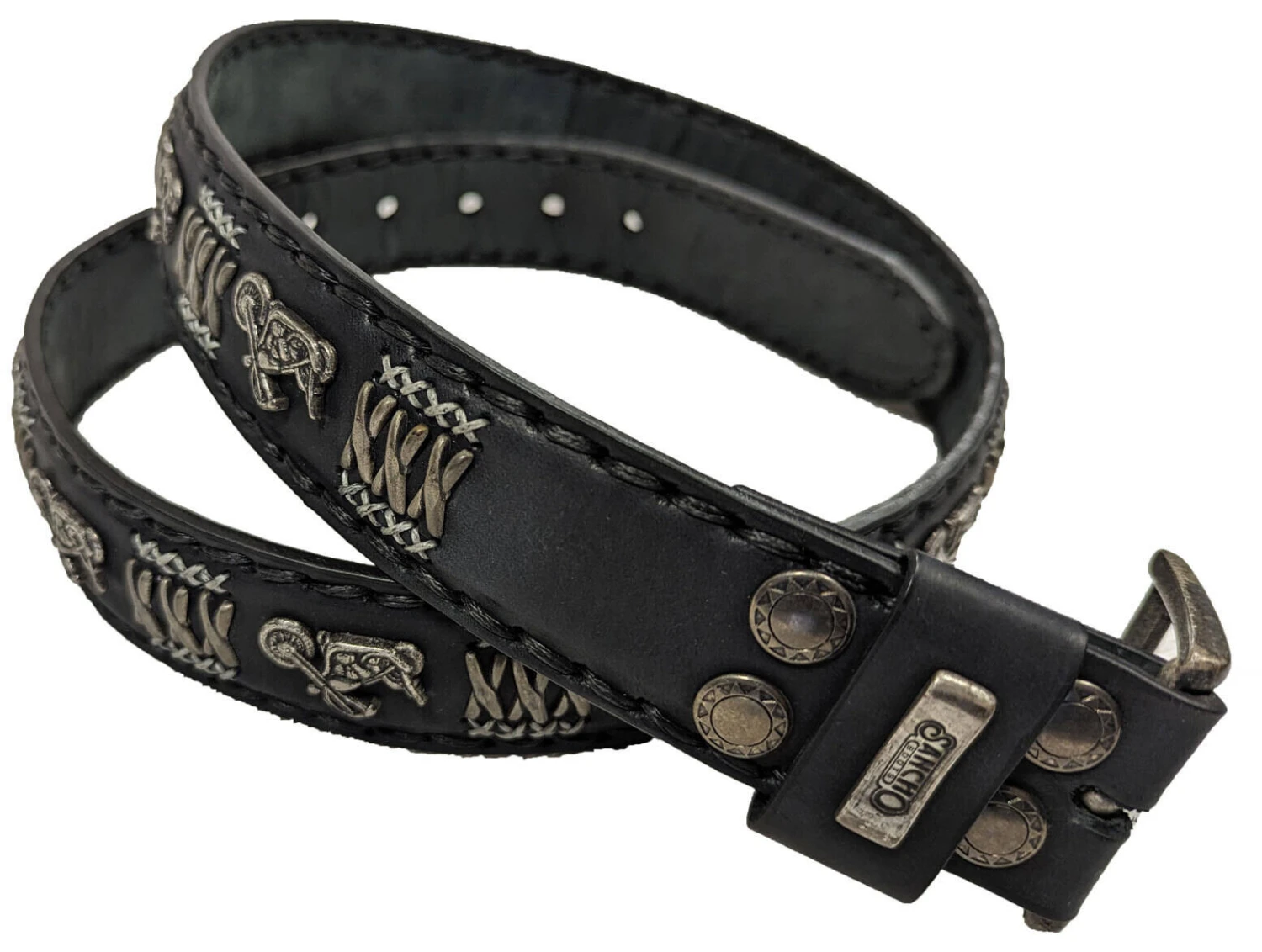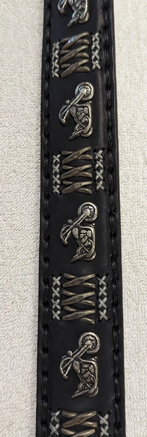Ceinture en cuir de vachette épaisse pour homme de la marque Sancho, très typée avec ses décorations motos, sa boucle est de couleur argent vieilli