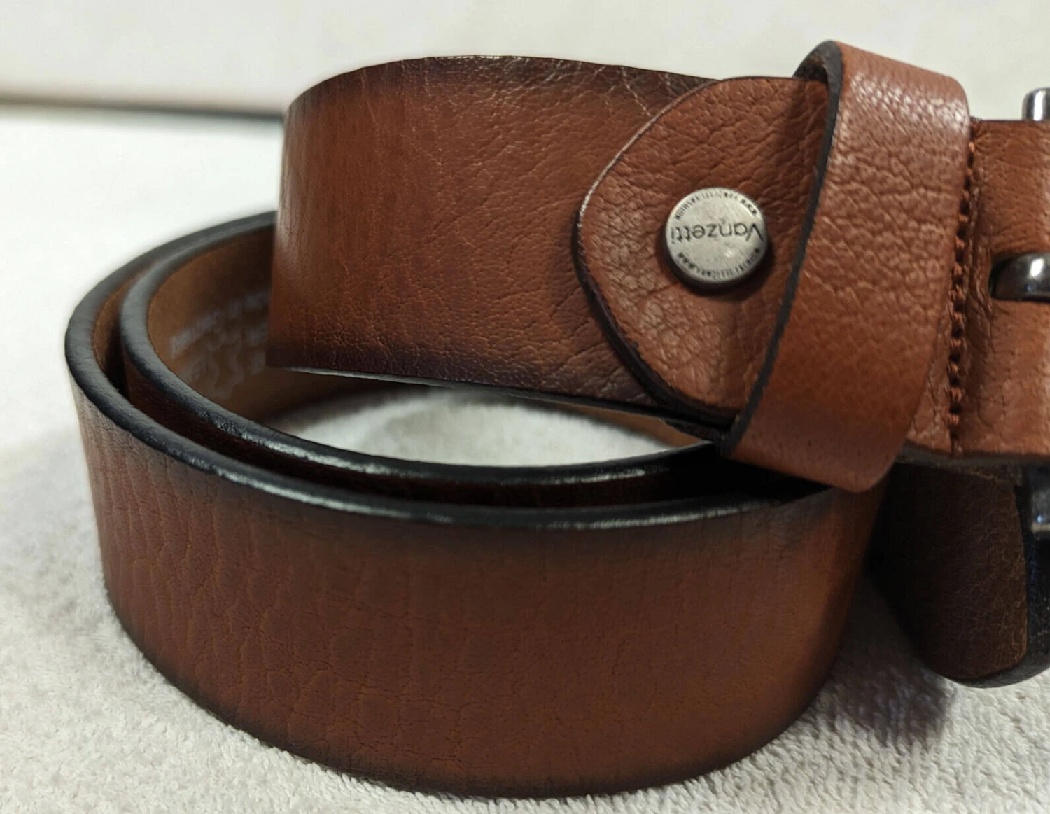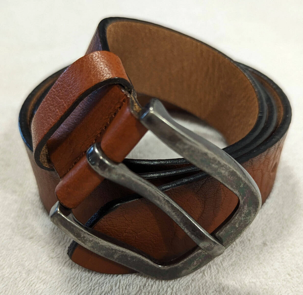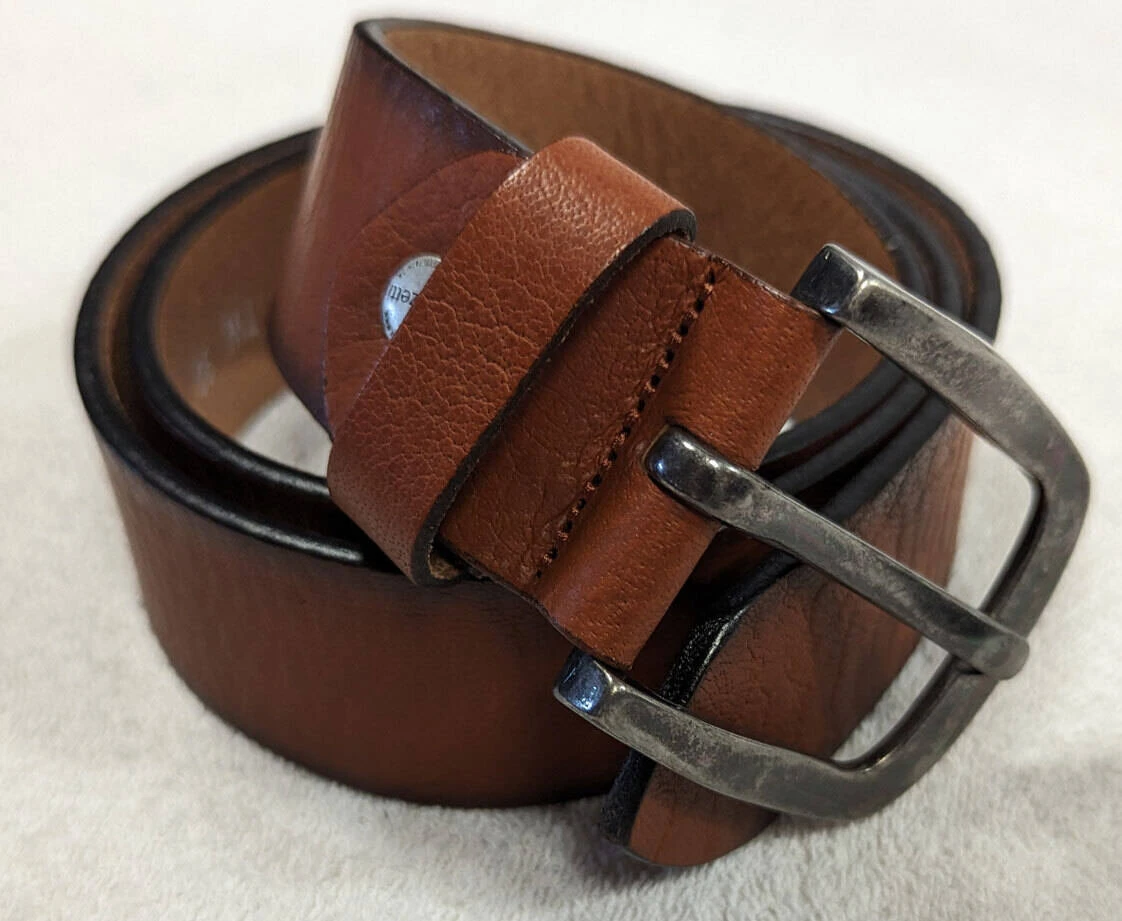 Ceinture en cuir de vachette cognac pour homme , dans un aspect vielli, boucle argent