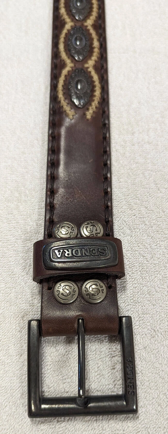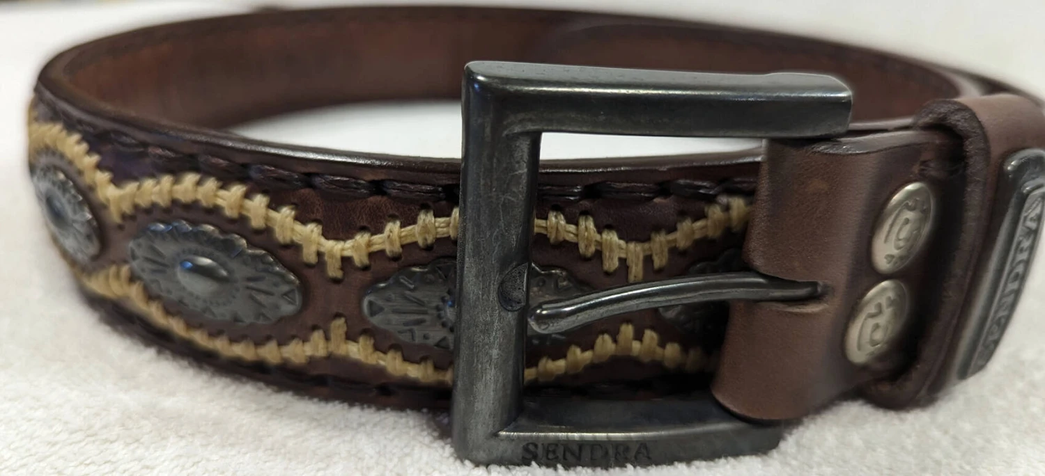 Ceinture en cuir de vachette marron épaisse , de la marque Sendra, on aime son style plus particulier avec ses décorations et piqures, la boucle est de couleur argent patiné