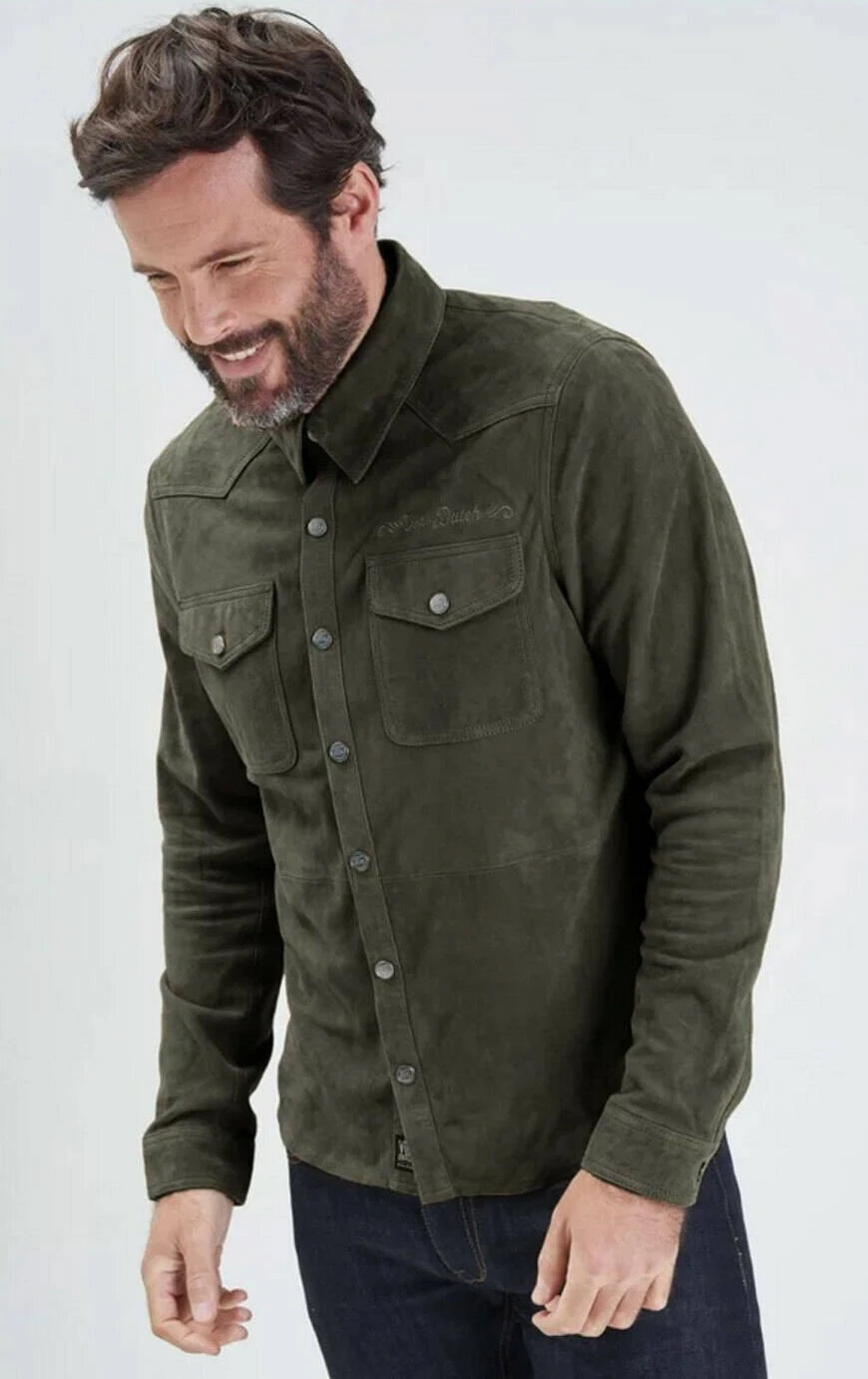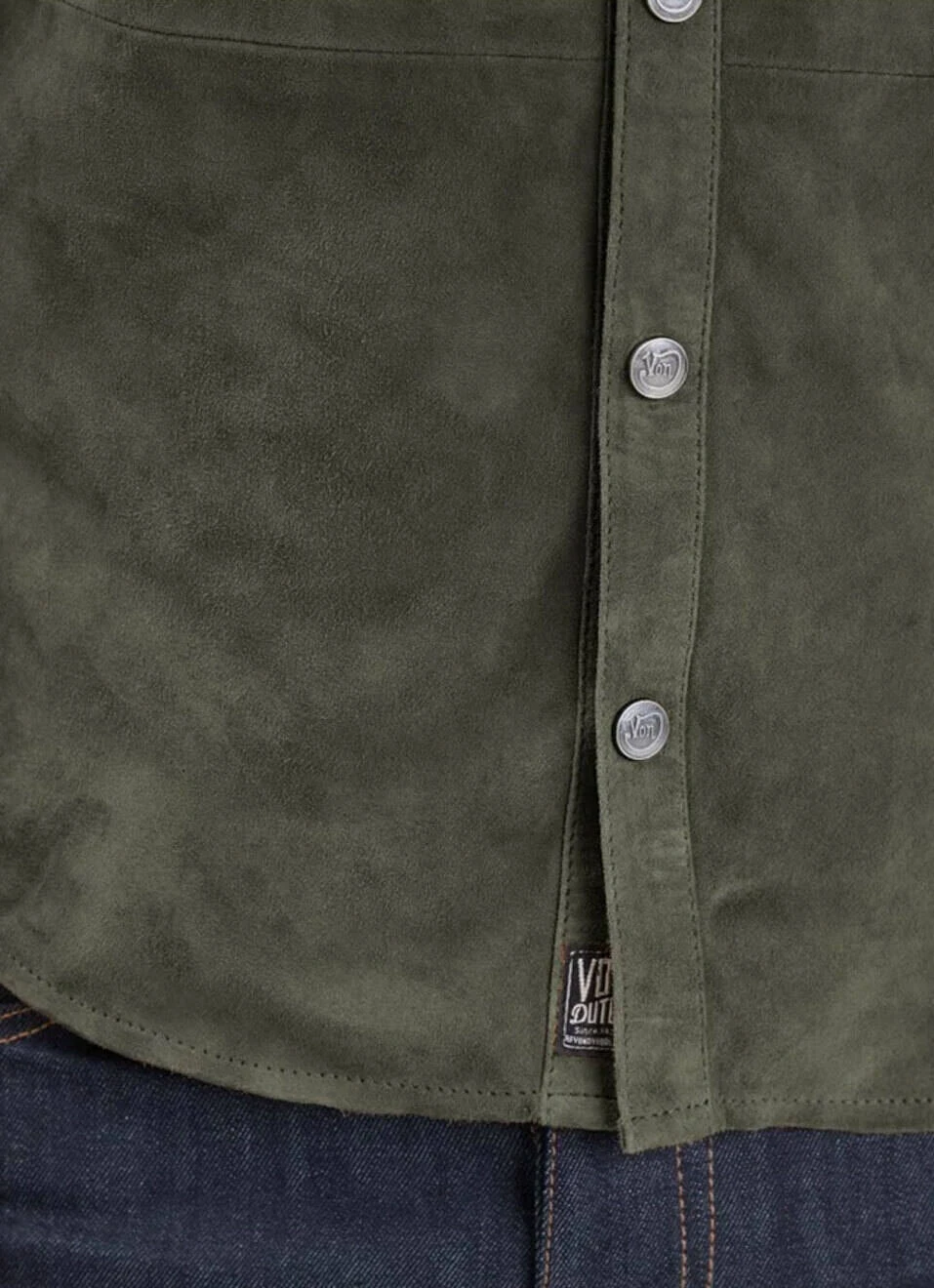 Cette chemise à poches plaquées est fabriquée dans un cuir de chèvre velours d’une grande qualité. Ce modèle de la marque Von Dutch se porte ajusté pour une silhouette affinée. Facile à enfiler grâce à ses boutons pressions, cette surchemise au look vintage est agréable à porter. Elle possède un col chemise, le logo « Von Dutch » brodé à la poitrine. IL y a une finition poignet en bas de manche avec pression. La chemise n’est pas doublée, vous avez 2 poches extérieures plaquées avec rabat à bouton pression.