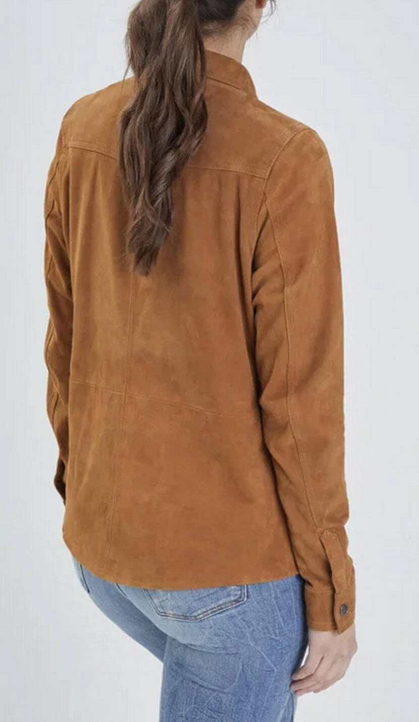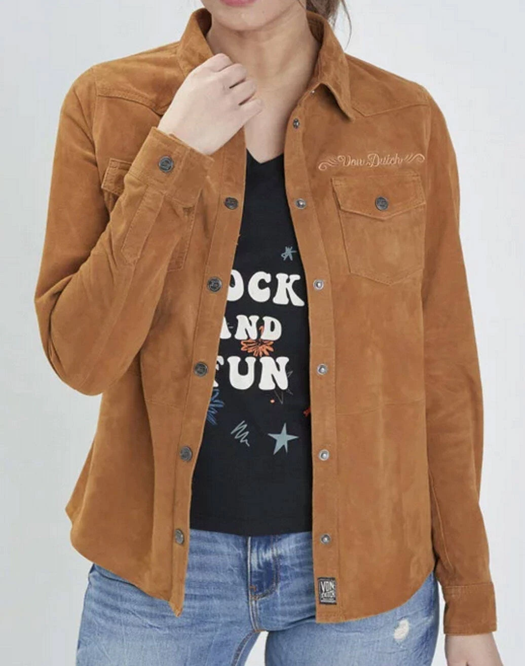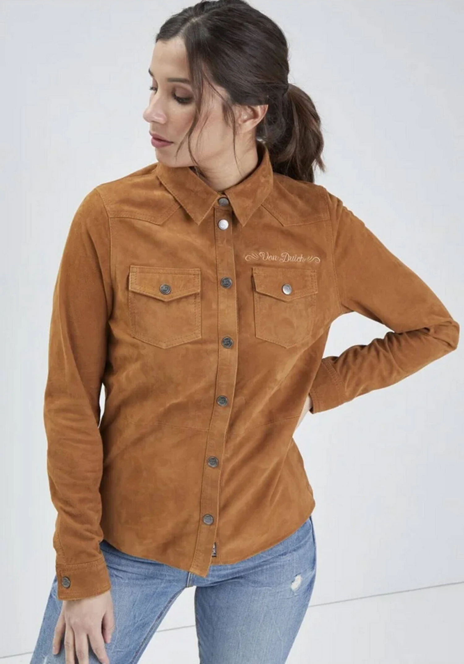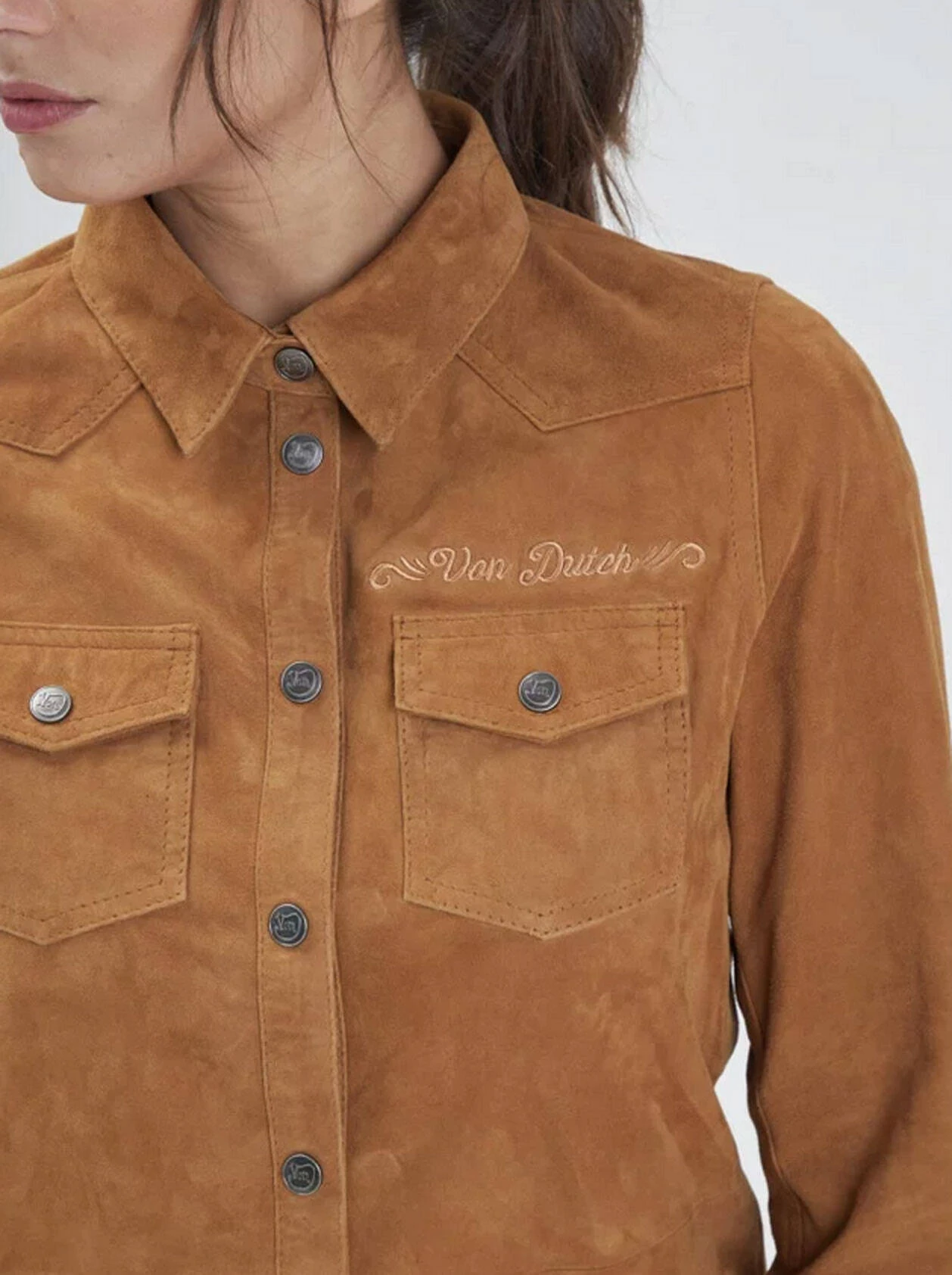 Très jolie chemise en cuir pour femme fabriquée dans un cuir de chèvre velours. Idéal pour la mi saison , doux, léger, elle se prête parfaitement. Elle reste assez classique avec son col chemise, elle se ferme à l’aide de pressions.Vous avez un poignet en bas de manches avec un bouton pression. Ce modèle à la coupe ajustée dispose d’une broderie à la poitrine reprenant le logo « Von Dutch ». On lui retrouve également 2 poches plaquées extérieures au niveau de la poitrine . La chemise ne possède pas de doublure .