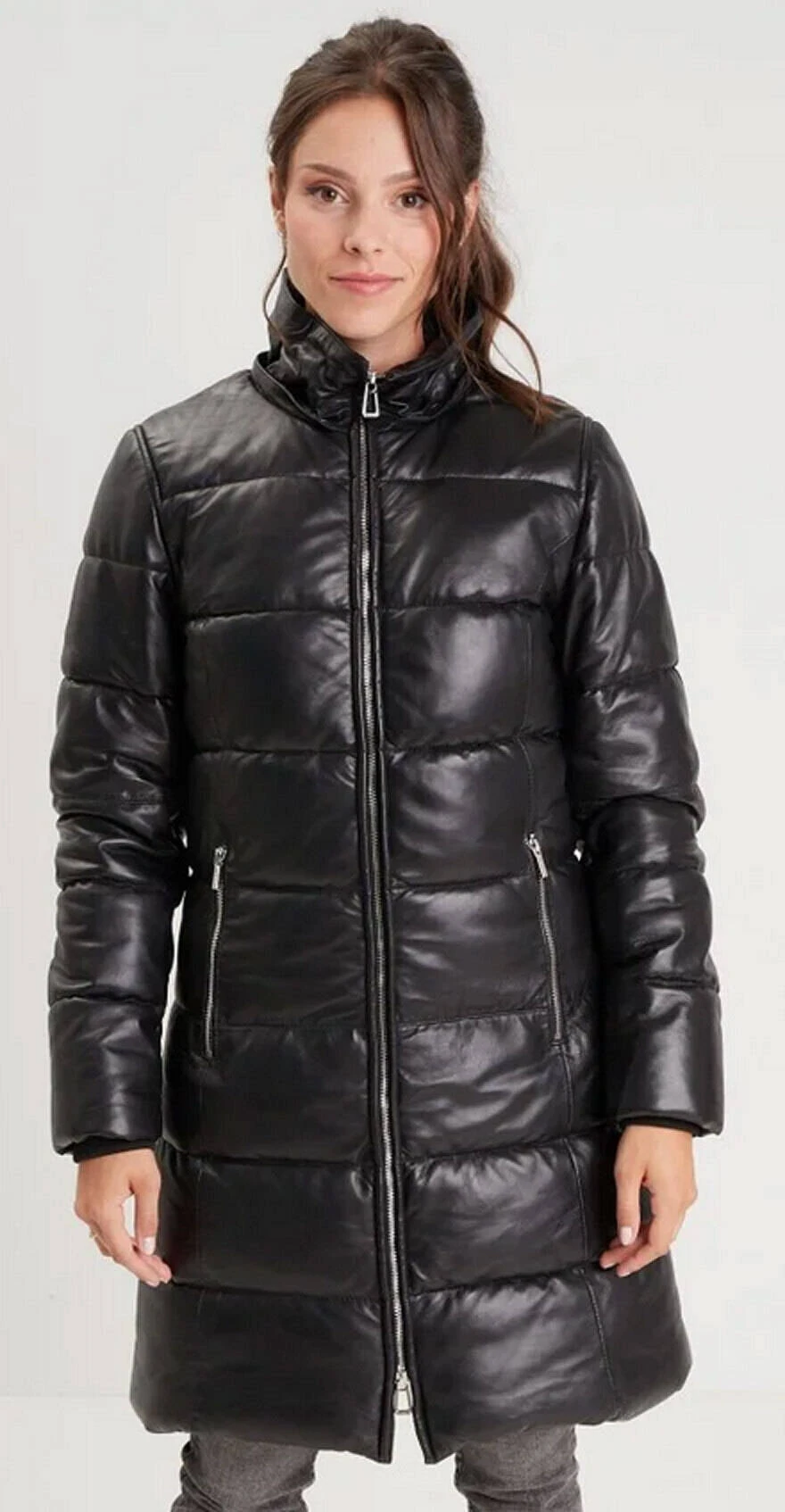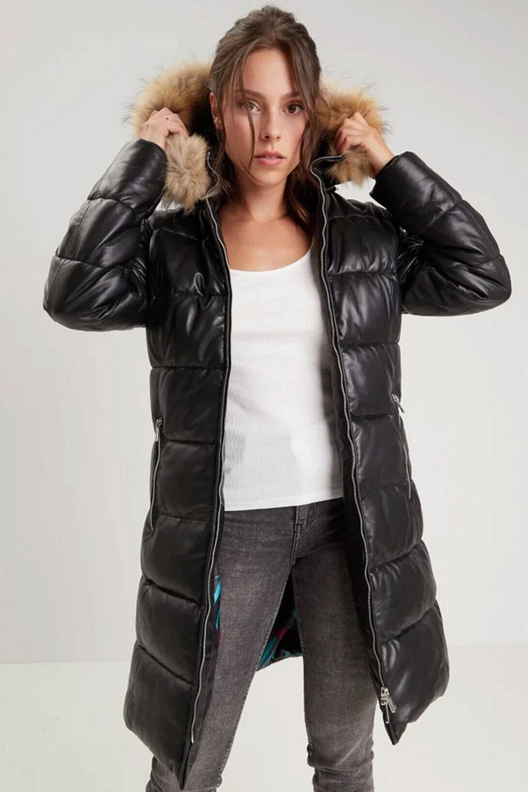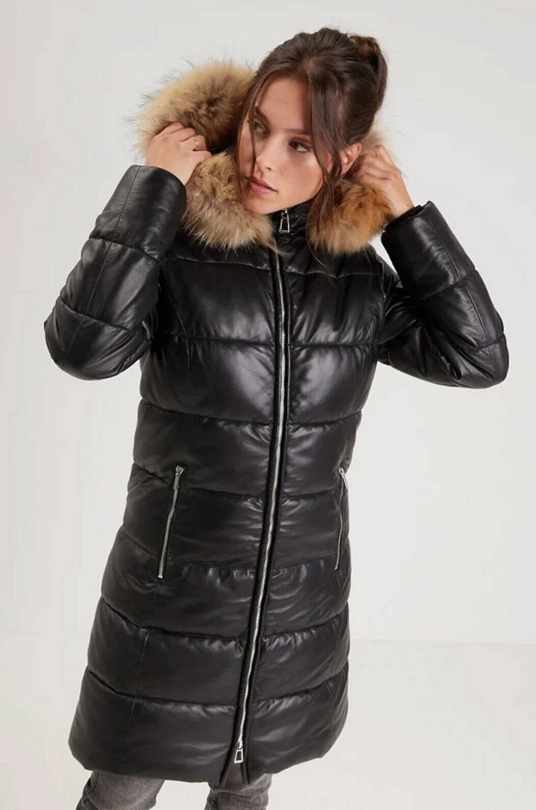 Doudoune longue pour femme , elle est fabriquée en cuir d’agneau , fin et souple . Elle possède une capuche amovible zippée avec une bordure en fourrure véritable. Elle associe parfaitement confort et élégance, vous ne pourrez plus vous passez de cette doudoune longue cet hiver . Vous avez un col montant assez large, une fermeture centrale zippée. Sur l’avant , il y a 2 poches zippées, sa doublure est 100 % polyester Thermocore avec une poche intérieure zippée