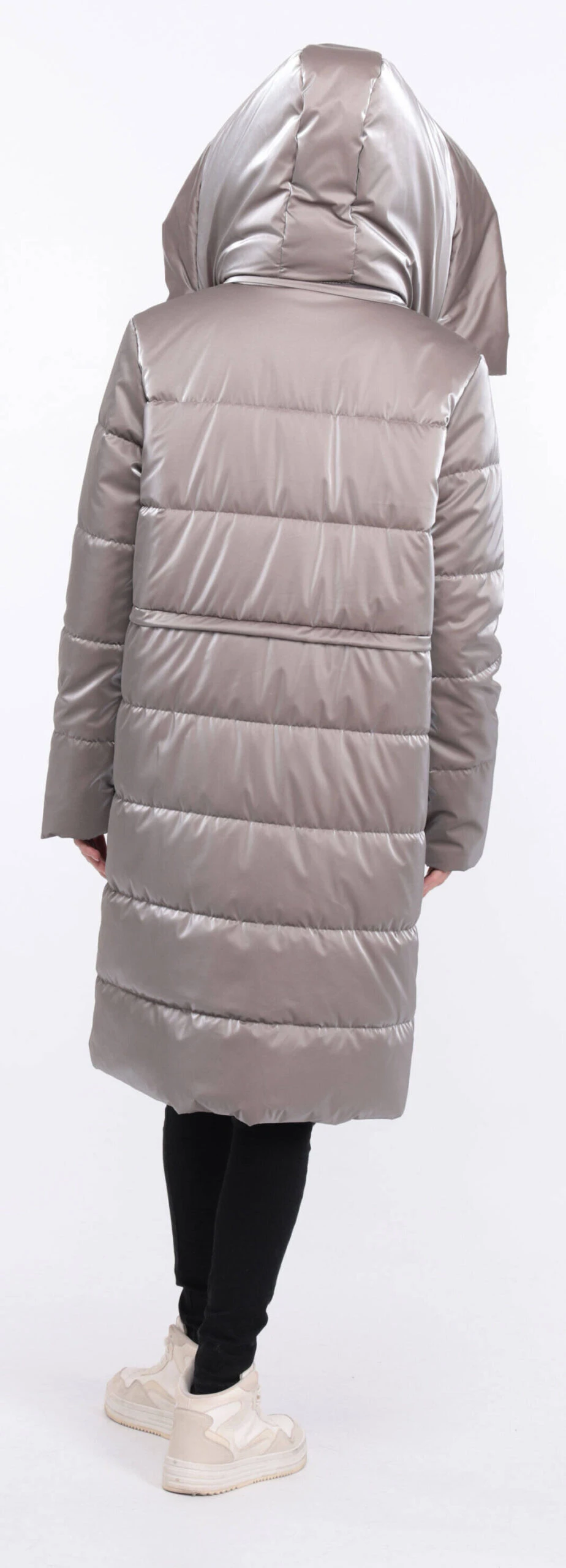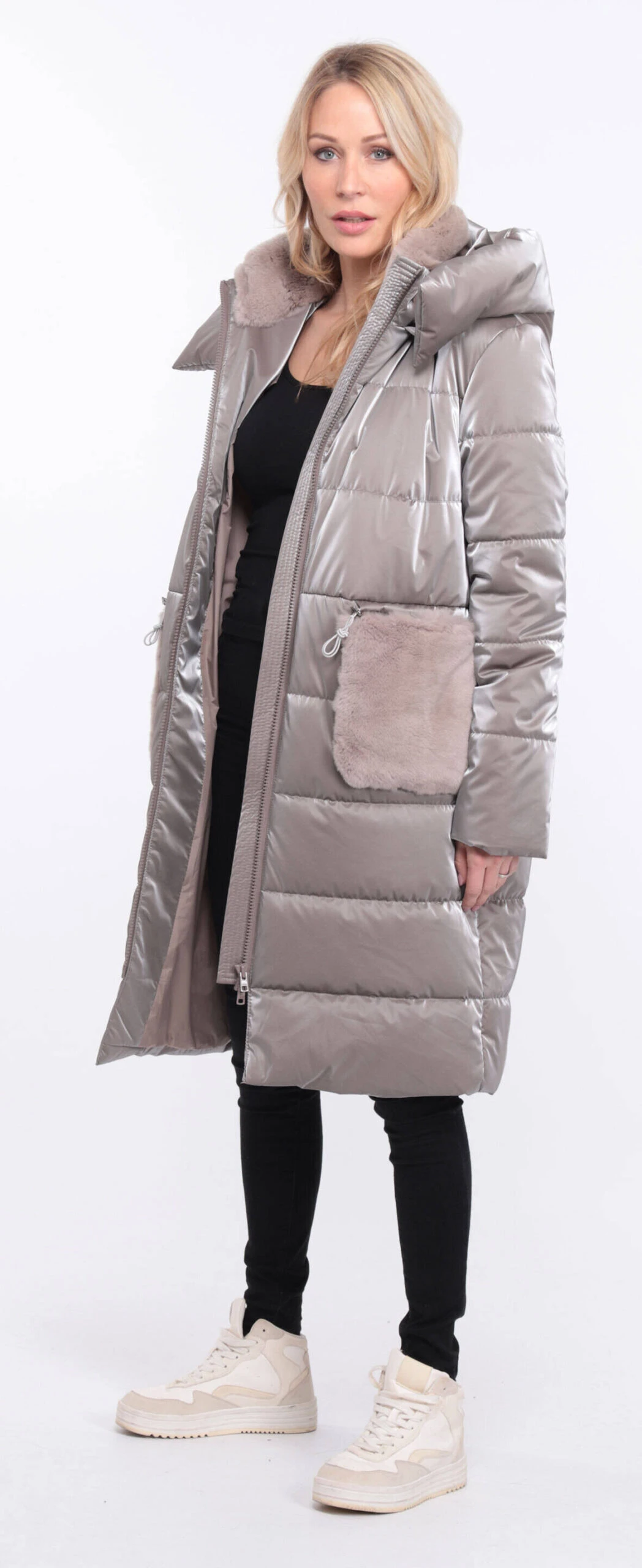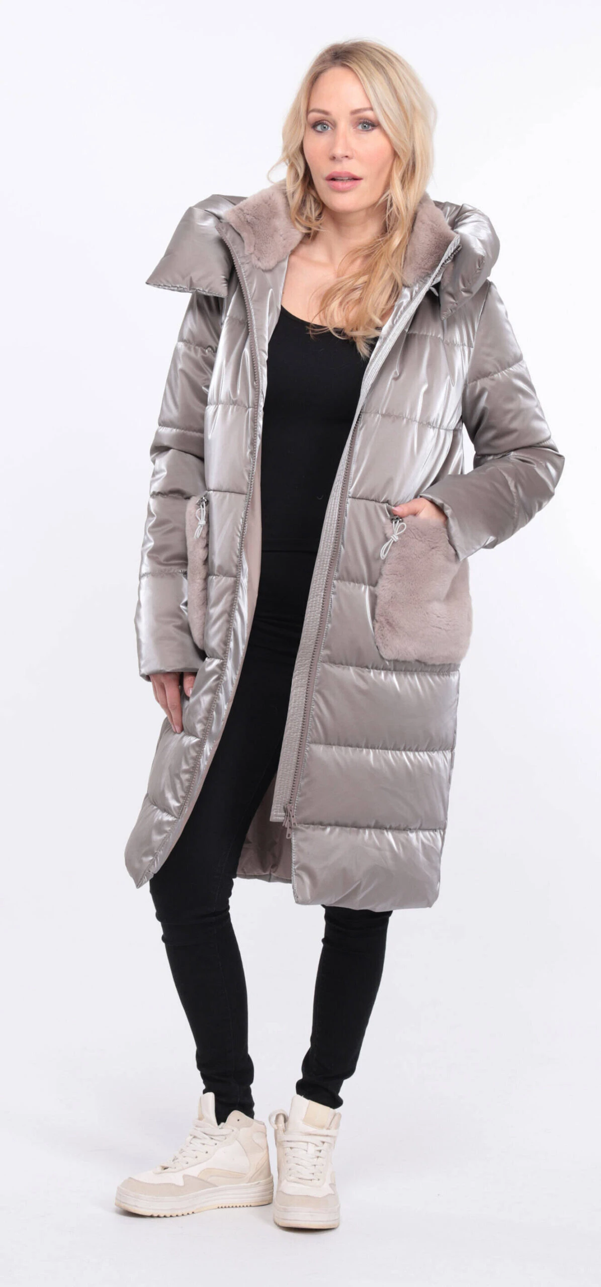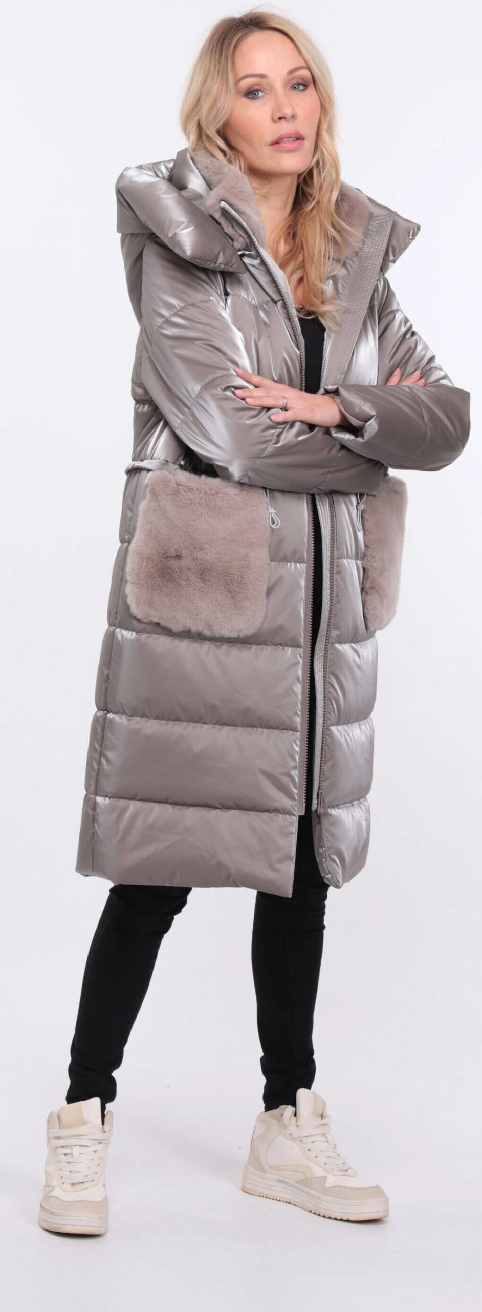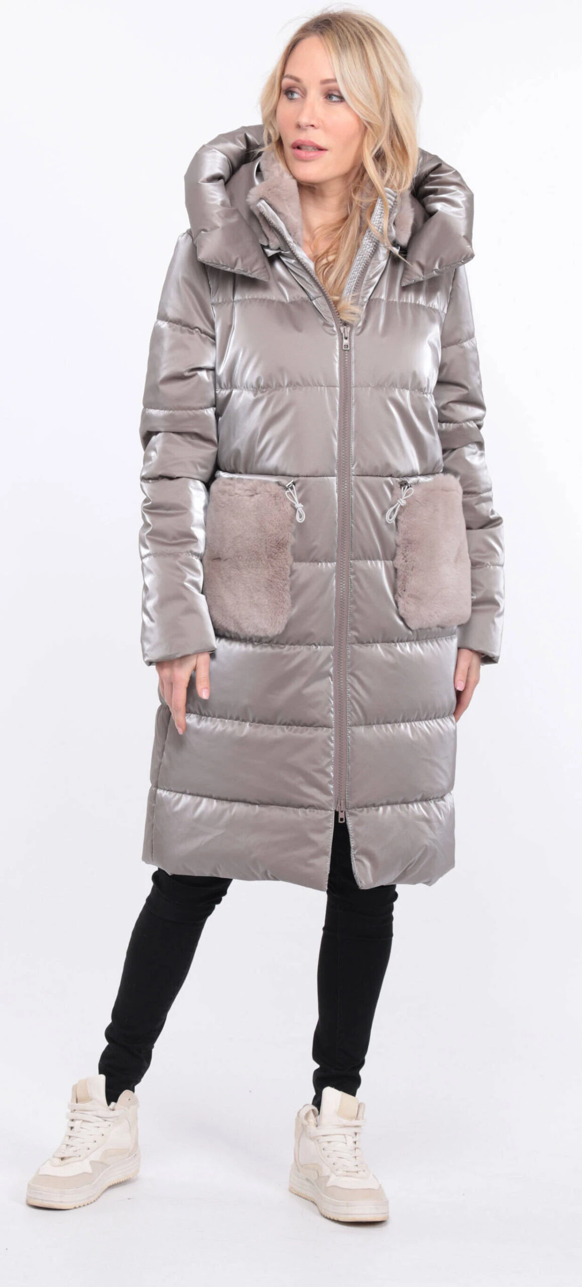 Manteau long pour femme en tissu taupe , on retrouve un look doudoune . La coupe est droite , confort , vous avez du lapin au niveau du col et des poches . La doudoune possède une capuche , se ferme à l’aide d’un zip droit , vous avez deux grandes poches .