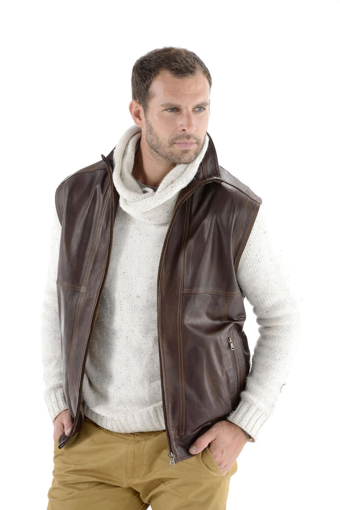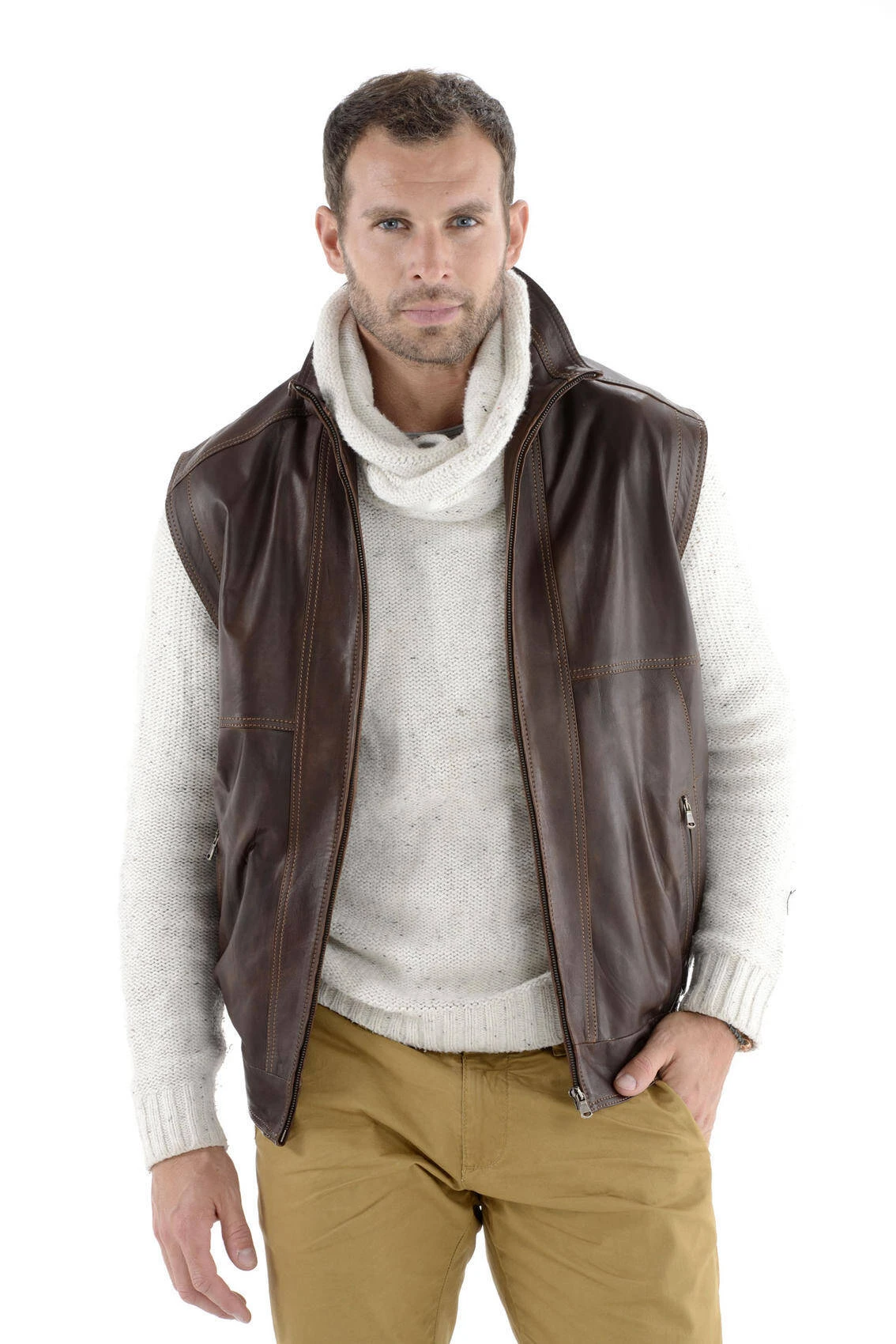 Gilet en cuir véritable d’agneau pleine fleur pour homme de couleur marron . Ce gilet est un produit intersaison, son cuir est souple, léger pour le porter vers la belle saison mais il peut très bien être ajouter en hiver sur un pull. Vous retrouverez 2 poches au niveau de sa doublure en viscose, l’une se ferme à l’aide d’un bouton et l’autre à l’aide d’une fermeture éclaire, très pratique pour vos effets personnels . Pour accentuer son coté sport et lui donner un look plus tendance, toutes ses surpiqures sont d’un fil plus clair ce qui ressort tout le travail apporté au gilet. Vous disposez d’un col droit que vous pourrez porter comme un col chemise droit classique ou bien le relever pour plus de modernité. Ce gilet cuir d’agneau se ferme à l’aide d’une fermeture zip centrale très pratique , bien couvrant le vent ne peut pas s’y glisser, la coupe est droite donc très confortable. Vous retrouvez au niveau de la taille un élastique tout cuir pour plus de maintien, le gilet se prête parfaitement à votre silhouette. Vous retrouvez des doubles poches l’une est ouverte , l’autre se ferme par une fermeture , parfait pour y glisser clefs, papiers, etc et bien-sûre y mettre ses mains . Sa coupe intemporel, facile fait de ce modèle un très bon classique , il sera parfaire votre look et il s’adapte à toutes les morphologies. Le gilet fait 70 cms de longueur corps ( de la base du col jusqu’au bas de la ceinture ) sur une taille S .