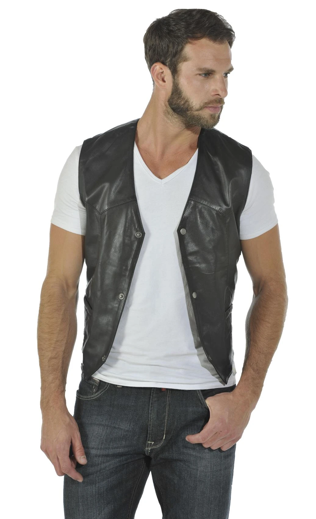 Gilet sans manches en cuir d’agneau pour homme de couleur noir de la marque Cuirs Guignard. C’est le gilet cuir traditionnel par excellence, intemporel, vous retrouvez sa coupe style boléro , chic et habillé.Ce gilet en cuir pour homme est confectionné en cuir d’agneau noir pleine fleur dont l’aspect est lisse et plutôt mât, très facile d’entretien. Vous allez apprécier de porter ce cuir léger, souple, qui va se patiner avec le temps pour donner un look vintage et rétro à ce gilet en cuir pour homme.Il se ferme à l’aide de 3 pressions et vous pouvez gérer le cintrage au niveau du dos il y a une petite patte de resserrage. Vous retrouvez sur le gilet en agneau deux poches passepoiles qui sont placées sur les hanches. Il a une doublure fin esprit satin en polyester noir unie avec deux poches intérieures, l »une se ferme à l’aide d’un bouton et l’autre grâce à une fermeture, idéale pour vos effets personnels. Vous ne sentirez pas sur vous ce gilet extrêmement léger, vous serez surpris par sa finesse, il se prête parfaitement au corps. Vous le porterez aussi bien comme notre mannequin en décontracté sur un tee shirt et un jeans que sur un pantalon plus chic et une chemise pour plus d’élégance. Il vous faut absolument ce petit gilet cuir dans votre dressing pour un look bad boy ou bien classe, à vous de choisir , il sera s’adapter à votre style . Ce gilet cuir mesure 57 cms de longueur corps, c’est à dire de la base du col au bas du gilet, sur une taille S.