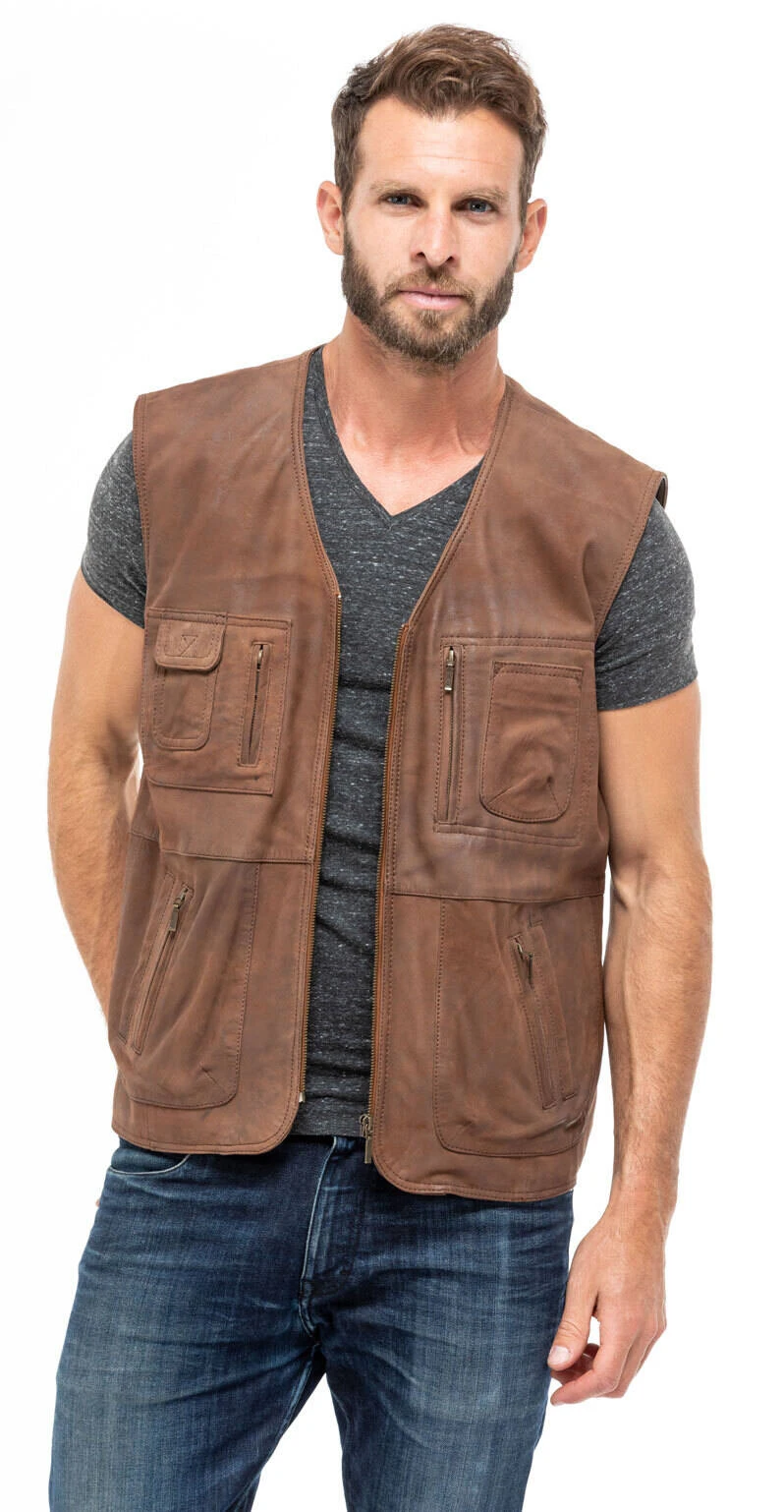 Gilet en cuir souple et léger d’agneau,aspect peau , cuir mât , très léger pour homme de coloris whisky. Ce gilet multipoches se démarque avec son look plus sport, pratique avec ses nombreuses poches. Il dispose d’un doublure fine en polyester avec 2 poches intérieures, une poche basique ouverte, une poche qui se ferme à l’aide d’un zip . Ce gilet est vraiment très agréable à porter , vous allez apprécier la souplesse de son cuir, on ne le sent pas sur soi, c’est une seconde peau, il suit parfaitement les mouvements du corps. Il dispose d’un col en V et d’une fermeture par zip centrale, très pratique et coupe très bien du vent. Comme vous l’avez remarqué, ce gilet est très fonctionnel et robuste, ce gilet cuir sera votre meilleur allié pour vos activités d’extérieur.Ses 8 poches astucieuses en font une pièce indispensable de votre vestiaire et vous permettront de voyager malin. Nous appelons ce gilet d’agneau multipoches également gilet cuir reporter, vous pourrez le porter toute l’année . Le gilet fait 68 cms de longueur corps ( de la base du col au bas du gilet) sur une taille 48.