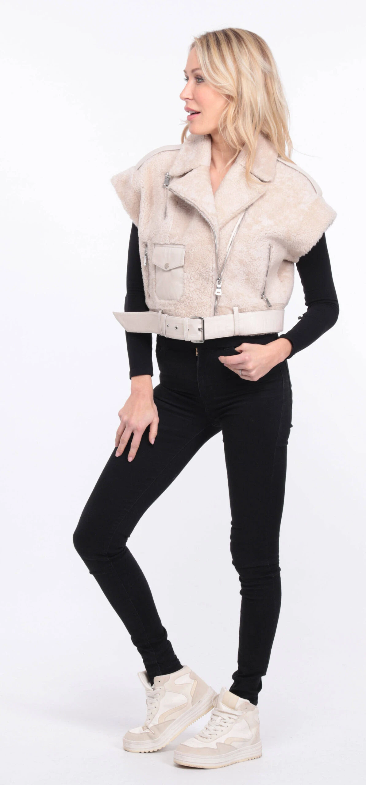 Petit blouson sans manches façon gilet dans un style perfecto. C’est très chaud avec sa laine, on lui retrouve un col tailleur , une fermeture asymétrique. Il y a des pattes d’épaules , une ceinture, deux poches zippées et une poche cuir à rabat pression. Le petit blouson est assez court et ajusté.