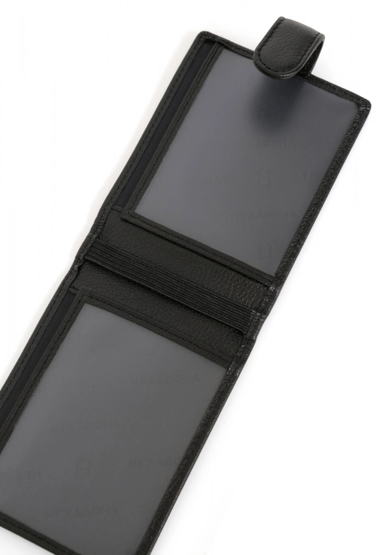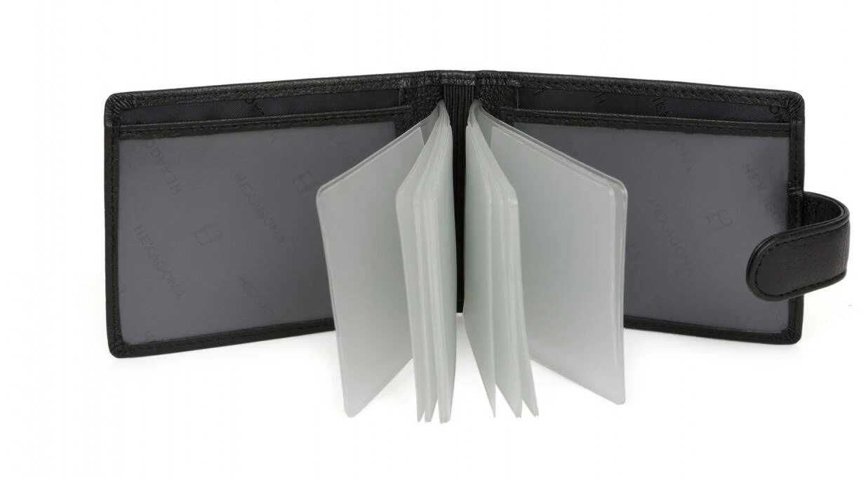 Porte-cartes en cuir de vachette grainé , Fermeture à patte à pression, Doublure : Synthétique, Finitions argent brillant. On retrouve un volet, deux poches plates à vue transparente et un feuillet plastique mobile de seize emplacements carte. Il est Compatible cartes de crédit.