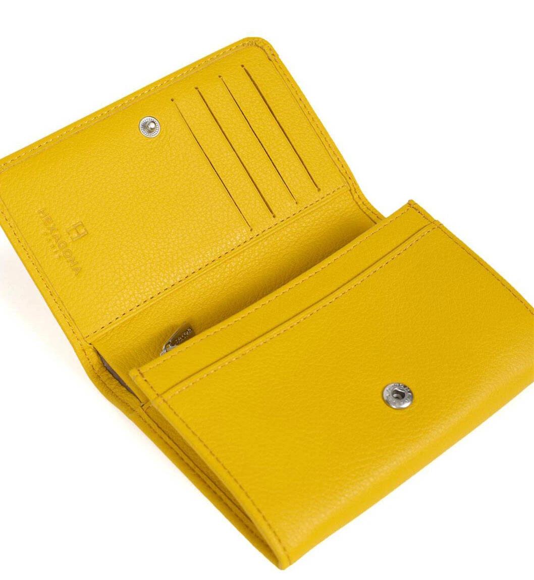 Portefeuille en cuir de vachette grainé de la marque Hexagona . IL possède une Fermeture à pression, il est Compatible cartes de crédit et CNI. A l’intérieur , on retrouve un volet, six poches plates (dont un zippée), un porte-monnaie zippé, une poche billets et huit emplacements carte.