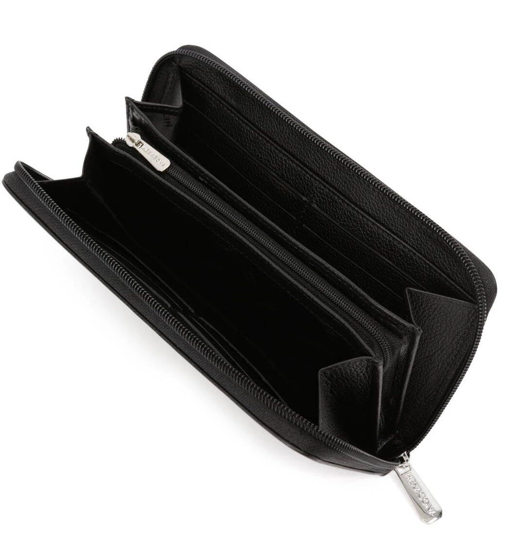 Portefeuille en cuir de vachette grainé , Fermeture zippée, Finitions argent brillant. On retrouve quatre poches plates, un porte-monnaie zippé et douze emplacements carte. Il est Compatible cartes de crédit, CNI, permis de conduire, passeport et carte grise.