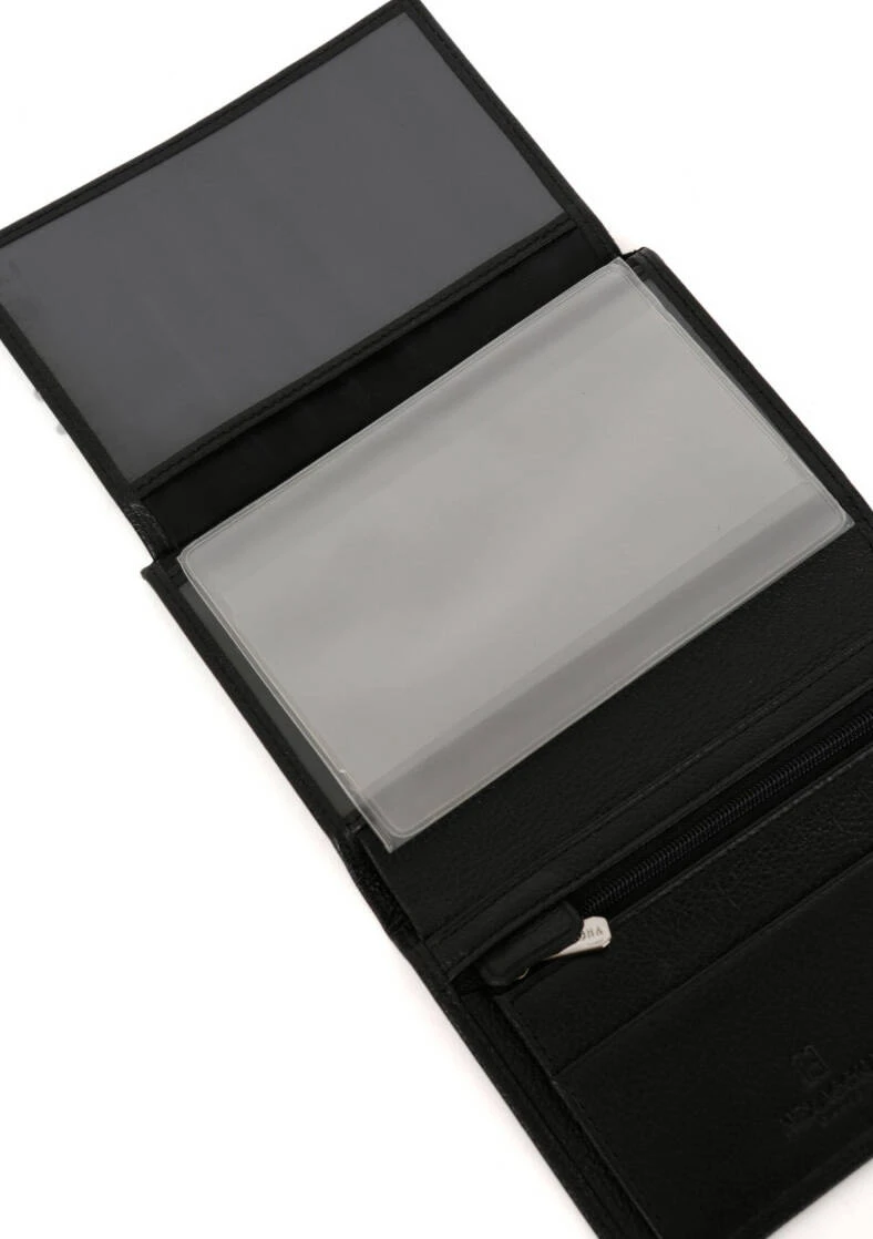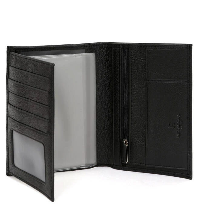 Portefeuille européen en cuir de vachette grainé noir, il est entièrement doublé, ses finitions sont argent brillant .Il possède deux volets, cinq poches plates (dont deux à vue transparente), un porte-monnaie zippé, une poche billets et cinq emplacements carte (dont une à vue transparente). IL est Compatible cartes de crédit, CNI, permis de conduire, passeport et carte grise.