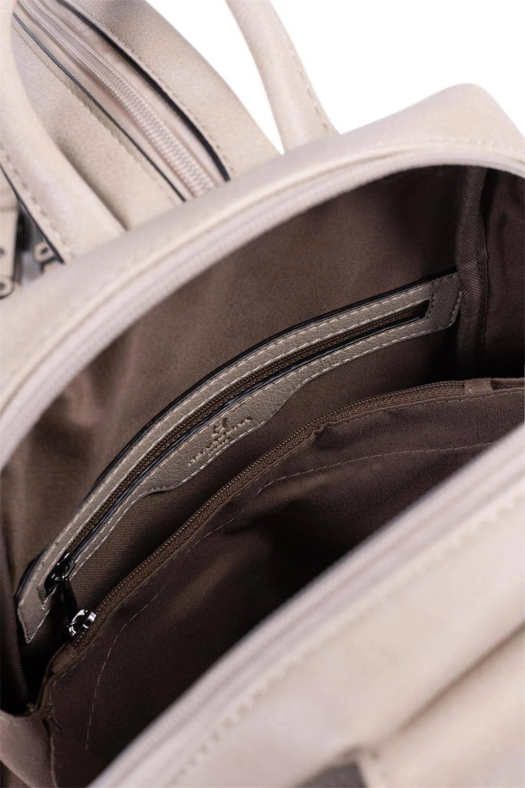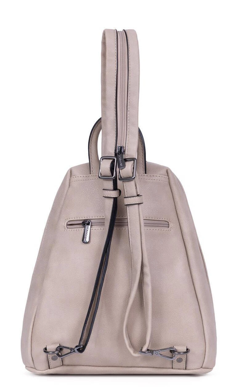 Sac à dos en matière synthétique pour femme, il se ferme à l’aide d’un zip à double curseur. Sous le dessous du sac, on retrouve une métallerie canon de fusil pour éviter le frottement. A l’intérieur du sac à dos , vous avez 1 compartiment principal avec 1 poche de séparation zippée + 1 poche plate zippée + 1 compartiment téléphone. On retrouve en plus 2 poches avant zippées (dont 1 plate) et 1 poche arrière plate zippée. Il y a 2 bretelles transformables réglables + 1 poignée non réglable.Comptez une longueur de 28 cm pour 11 cm de Large et 35 cm de Hauteur .