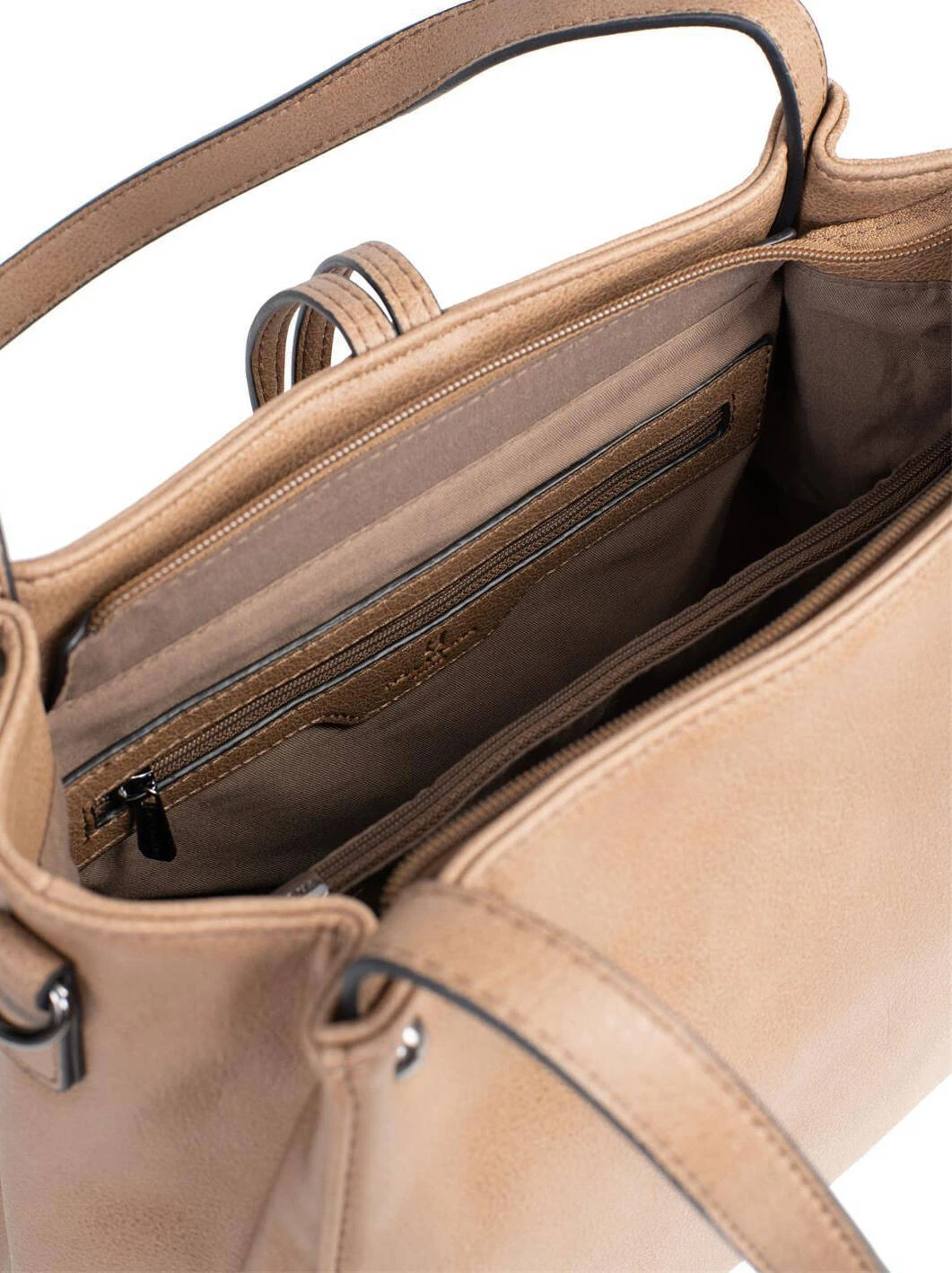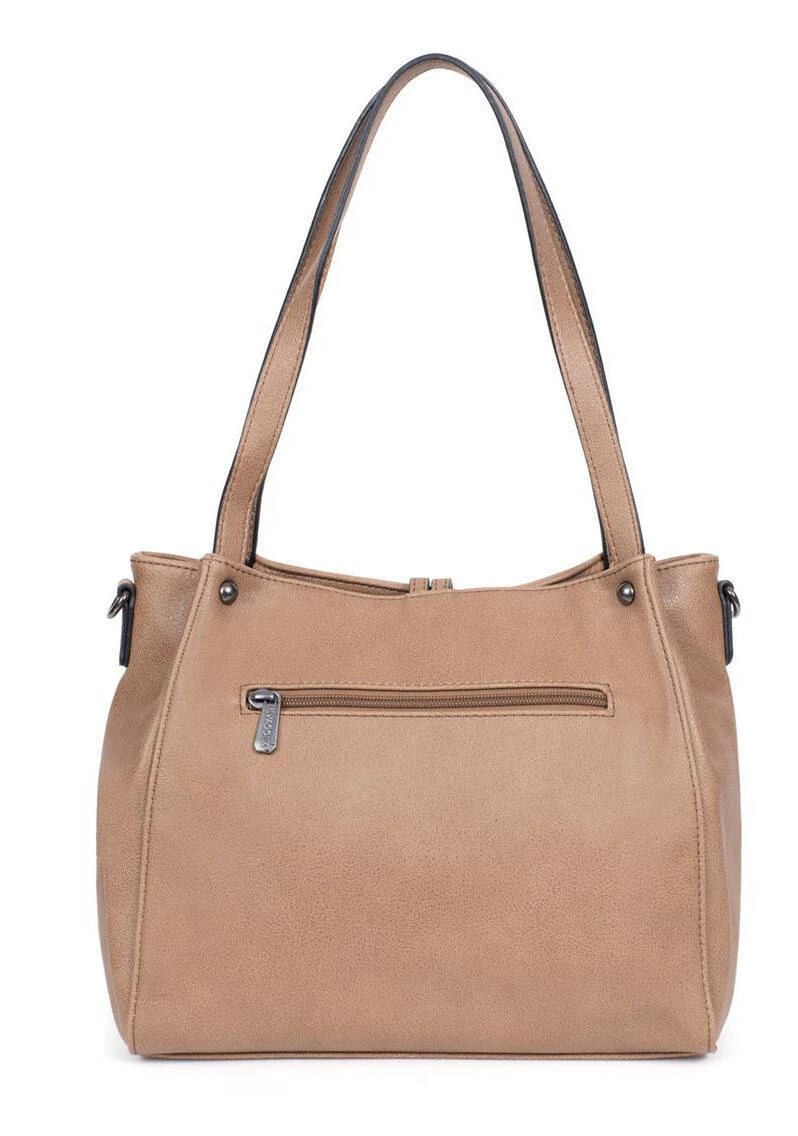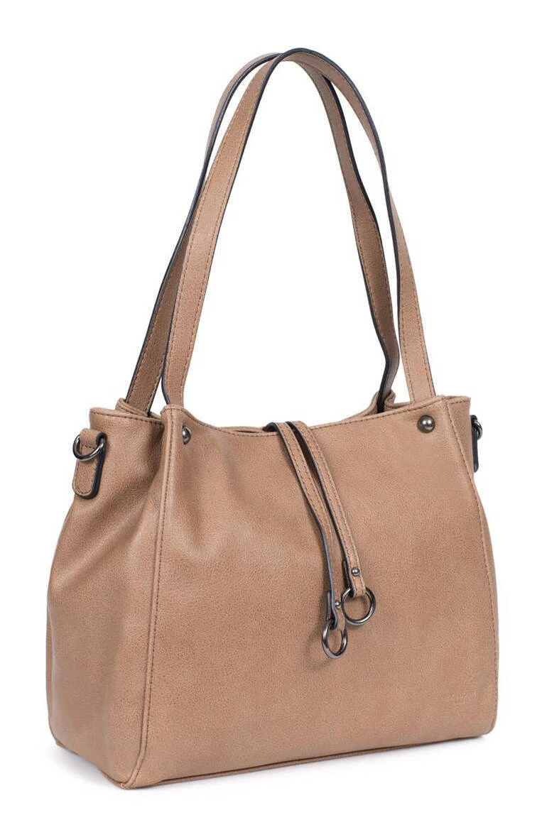 Sac porté épaule 2 anses en matière synthétique, il possède un zip de fermeture, des canons de fusil sous le dessous du sac. A l’intérieur, on retrouve 1 compartiment principal avec 1 poche de séparation zippée + 1 poche plate zippée + 2 poches plates (dont 1 compartiment téléphone) et 1 poche arrière plate zippée. Pour le porté épaule, vous avez 2 anses non réglables de 52.5 cm de long par 1.5 cm de large. En complément , vous avez aussi 1 bandoulière supplémentaire réglable amovible ( 76 à 133.5 cm pour 1.5 cm de large ) .