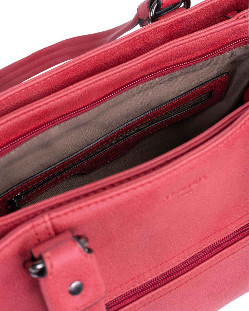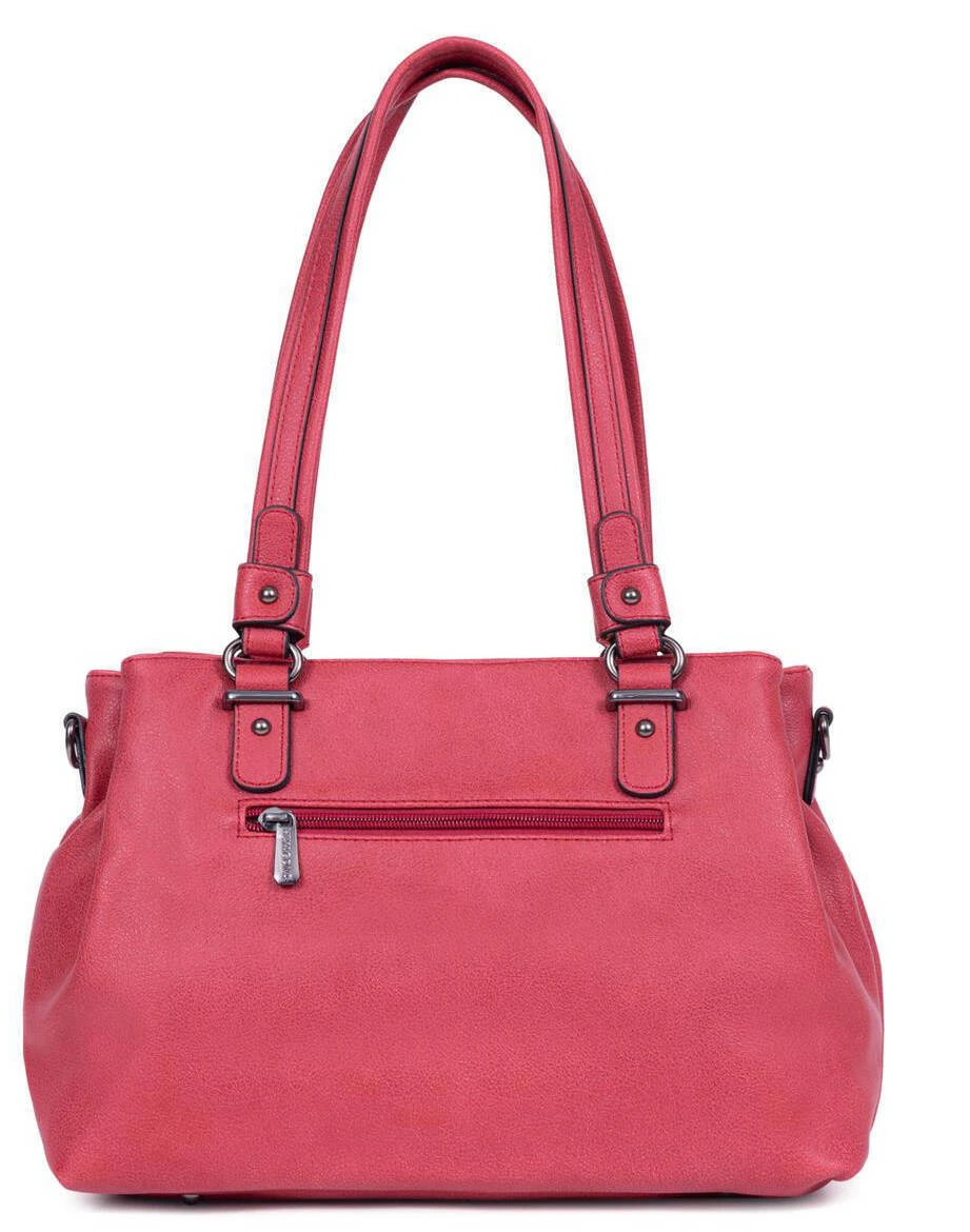 Sac porté épaule avec 2 anses en matière synthétique, il possède des fermetures zippées. Sous le dessous du sac, vous avez des finitions canons de fusil. Sur l’avant,il y a 1 poche avant plate zippée mais aussi 1 poche arrière plate zippée. A l’intérieur, on retrouve 3 compartiments principaux avec 1 poche plate zippée + 2 poches plates (dont 1 compartiment téléphone). Il se porte principalement à l’épaule avec ses 2 anses non réglables de 61 cm x 2.5 . Mais vous avez également en ajout 1 bandoulière supplémentaire réglable amovible ( de 81 cm à 143.5 cm x 1.5cm ) .