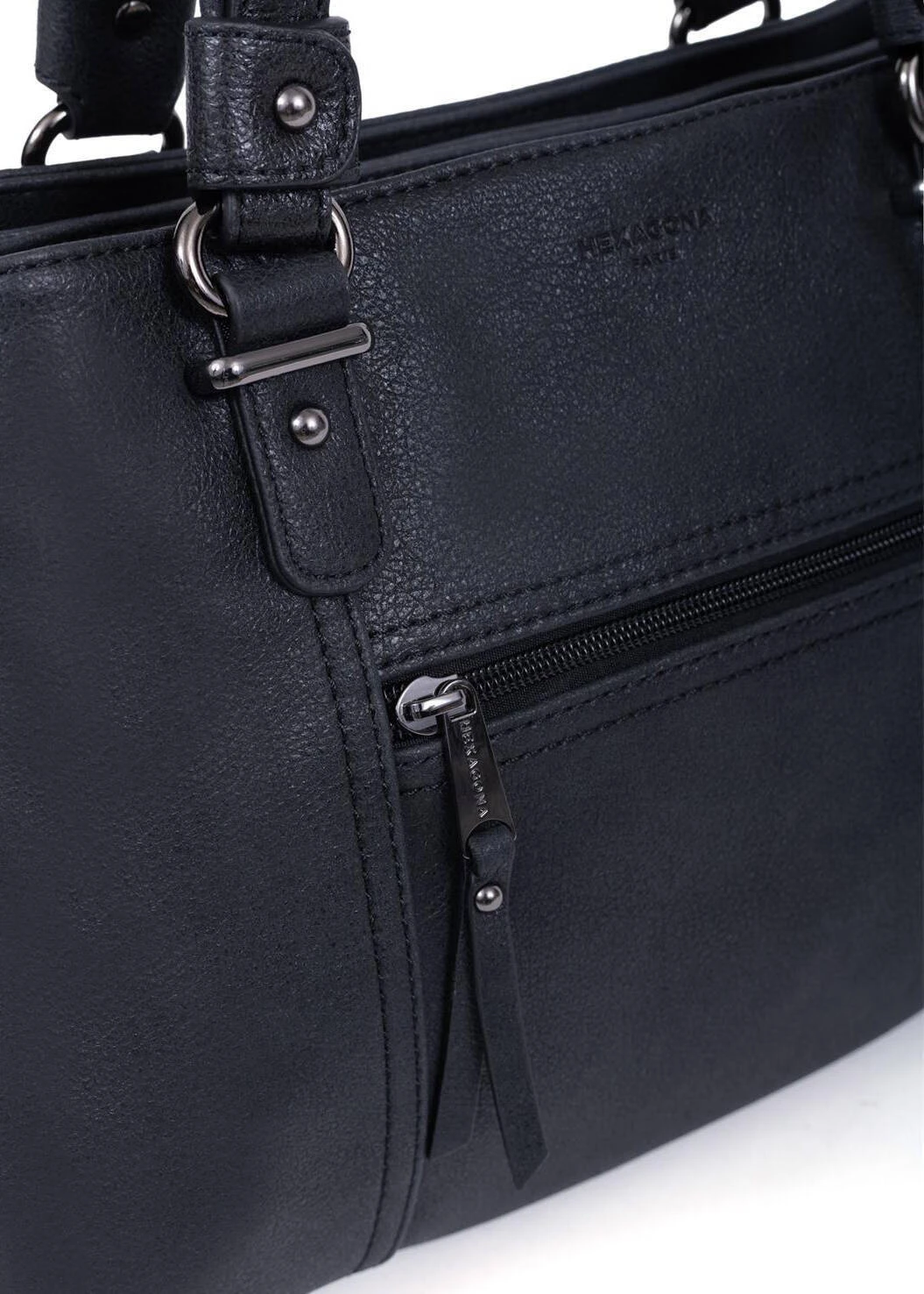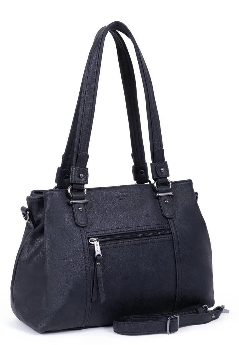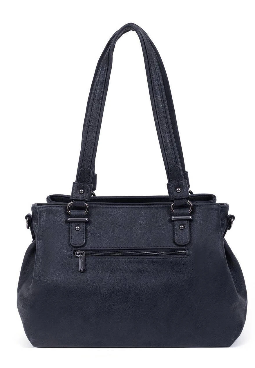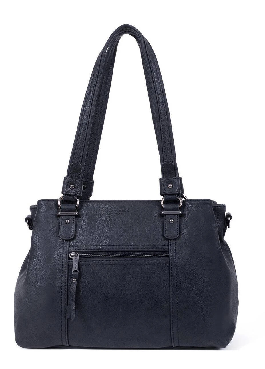Sac porté épaule avec 2 anses en matière synthétique, il possède des fermetures zippées. Sous le dessous du sac, vous avez des finitions canons de fusil. Sur l’avant,il y a 1 poche avant plate zippée mais aussi 1 poche arrière plate zippée. A l’intérieur, on retrouve 3 compartiments principaux avec 1 poche plate zippée + 2 poches plates (dont 1 compartiment téléphone). Il se porte principalement à l’épaule avec ses 2 anses non réglables de 61 cm x 2.5 . Mais vous avez également en ajout 1 bandoulière supplémentaire réglable amovible ( de 81 cm à 143.5 cm x 1.5cm ) .