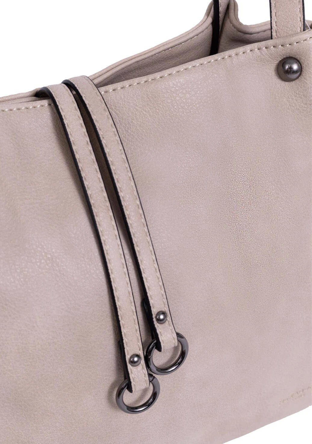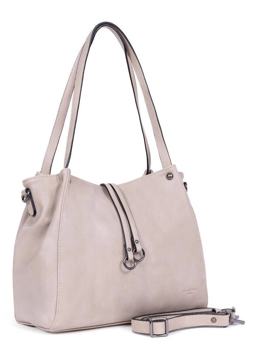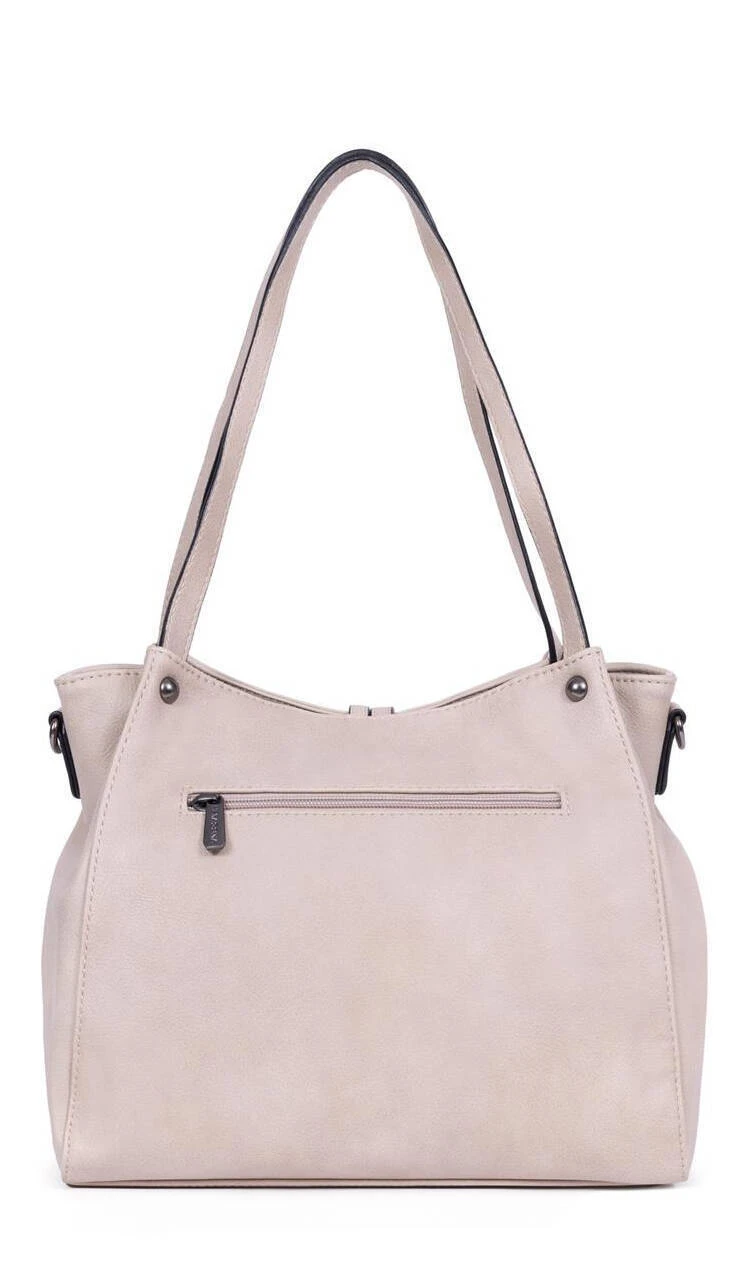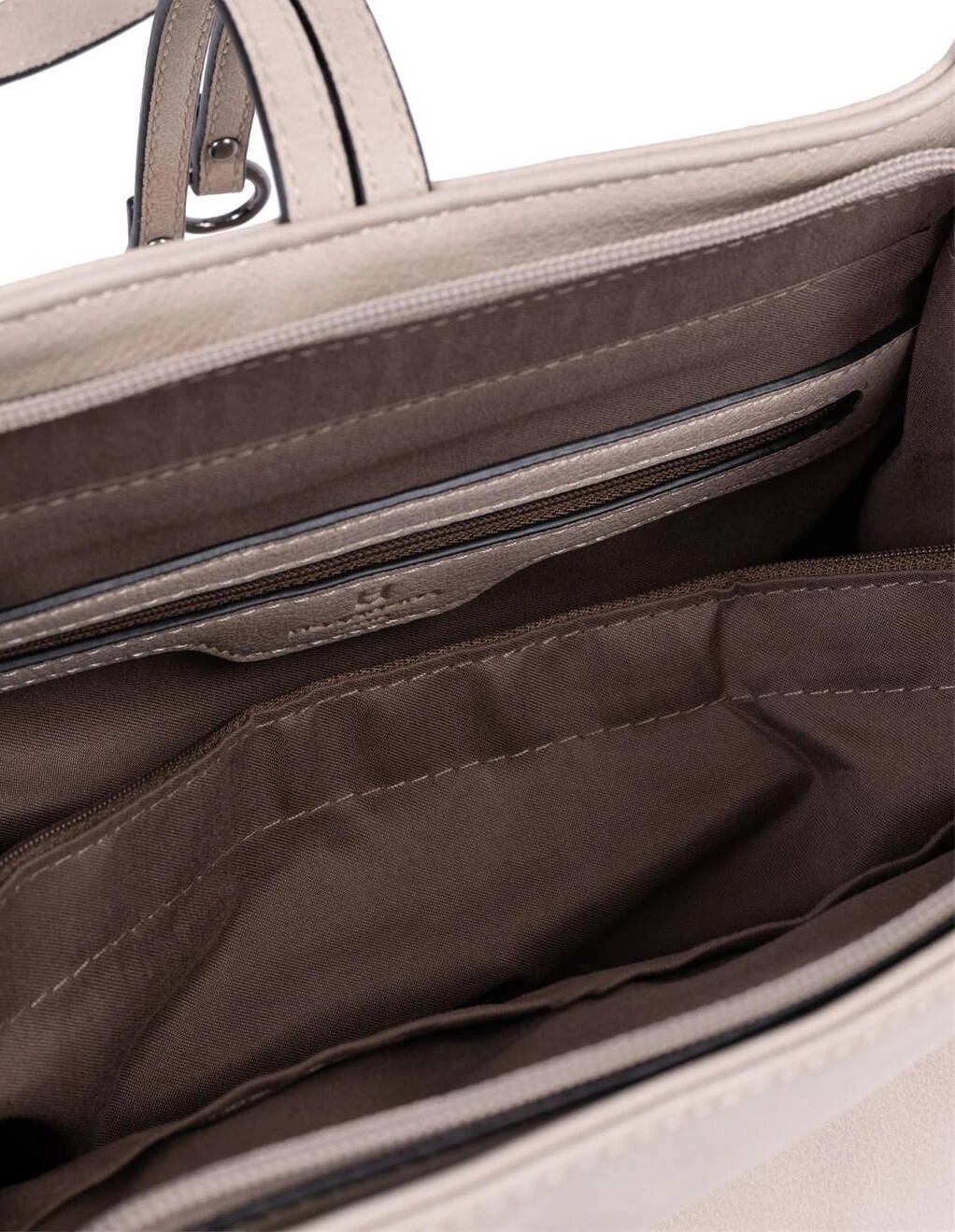 Sac porté épaule 2 anses en matière synthétique, il possède un zip de fermeture, des canons de fusil sous le dessous du sac. A l’intérieur, on retrouve 1 compartiment principal avec 1 poche de séparation zippée + 1 poche plate zippée + 2 poches plates (dont 1 compartiment téléphone) et 1 poche arrière plate zippée. Pour le porté épaule, vous avez 2 anses non réglables de 52.5 cm de long par 1.5 cm de large. En complément , vous avez aussi 1 bandoulière supplémentaire réglable amovible ( 76 à 133.5 cm pour 1.5 cm de large ) .