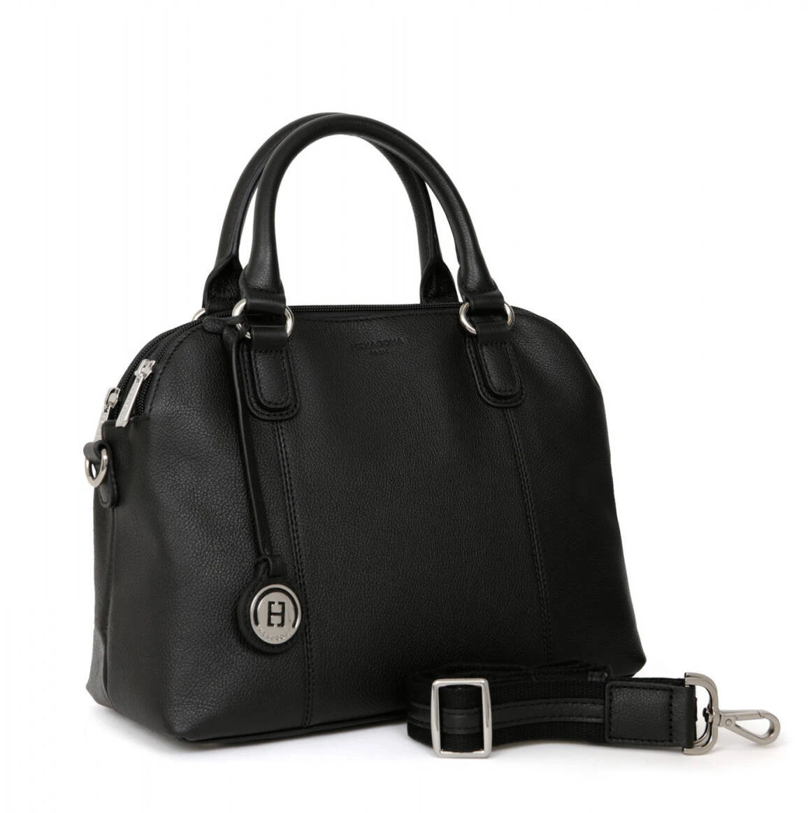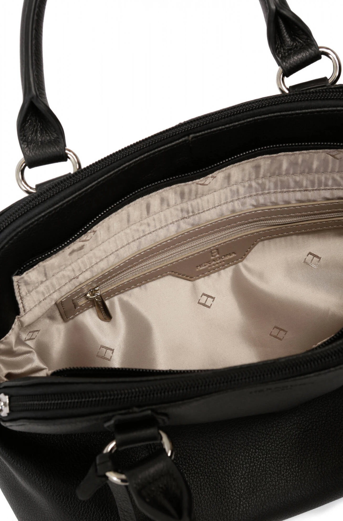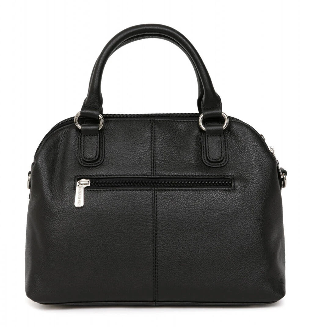 Sac porté main 2 poignées en cuir de vachette grainé noir . L’intérieur est entièrement doublé , doublure synthétique. Vous avez 3 compartiments , avec une poche plate zippée et deux poches plates (dont un compartiment téléphone) , tous fermés à l’aide d’un zip .Ses Finitions sont de couleur argent brillant. Sur l’arrière , on retrouve une poche plate zippée. Vous avez Deux poignées non réglables (33 cm)et Une bandoulière supplémentaire réglable amovible (78 cm mini / 137 cm maxi).