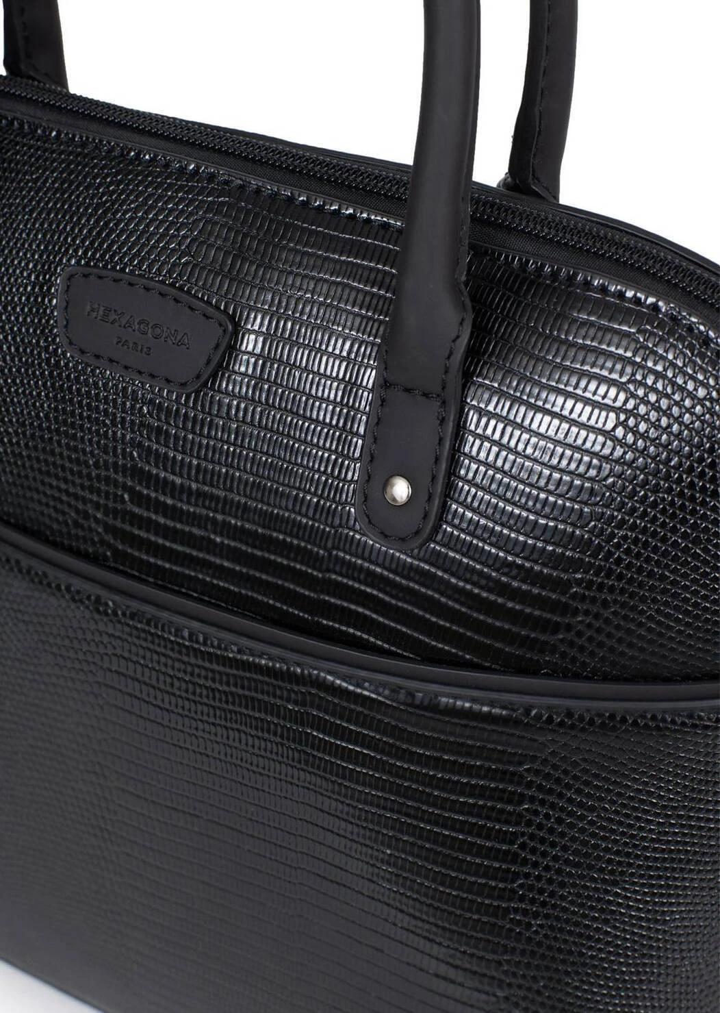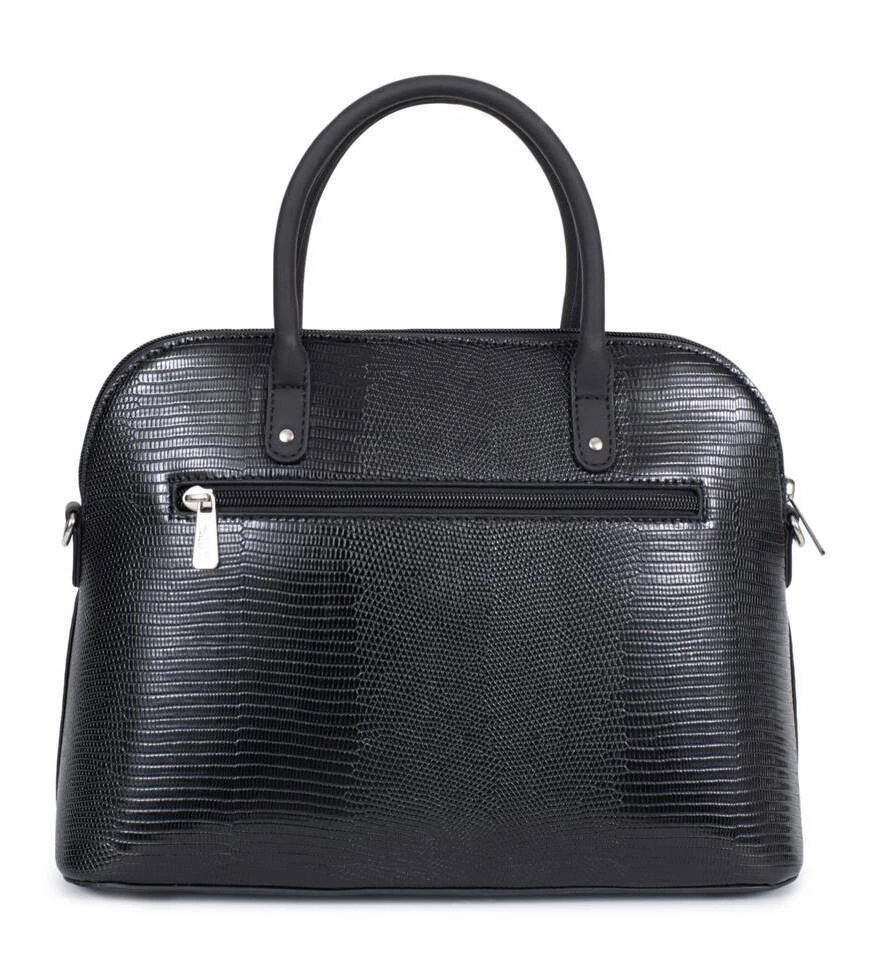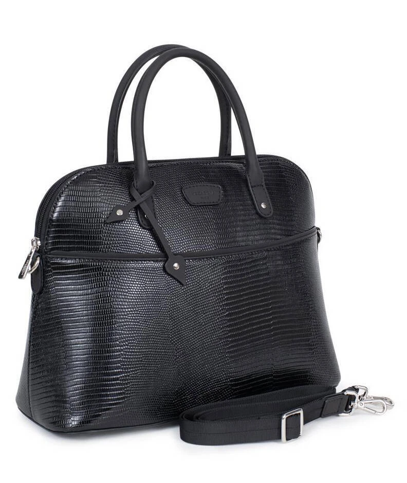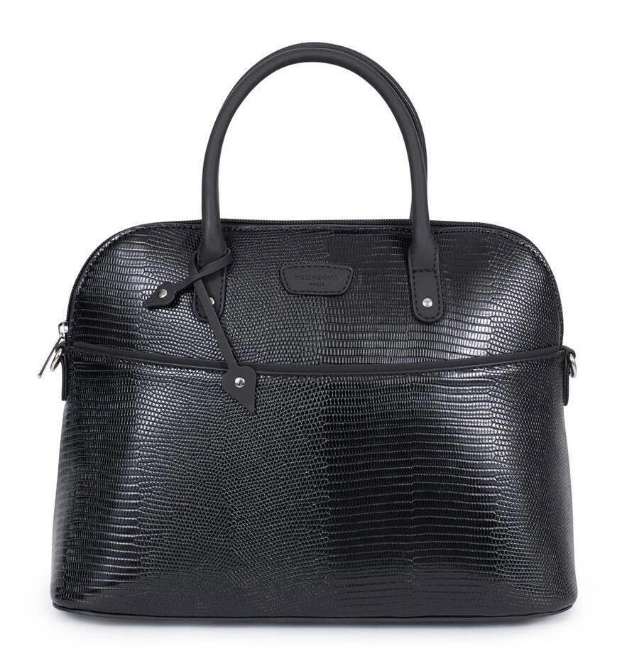 Sac porté main 2 poignées Synthétique grain lézard, il se ferme à l’aide d’un zip, la métallerie est de couleur argent brillant . A l’intérieur , vous avez 1 compartiment principal avec 1 poche de séparation zippée + 1 poche plate zippée + 2 poches plates (dont 1 compartiment téléphone) et 1 poche arrière plate zippée. IL se porte à la main avec ses 2 poignées non réglables qui font 31 cm de long par 1.5 cm de large. Vous avez en complément une bandoulière réglable amovible ( de 83 à 148 cm de long pour 2 cm de large ) .