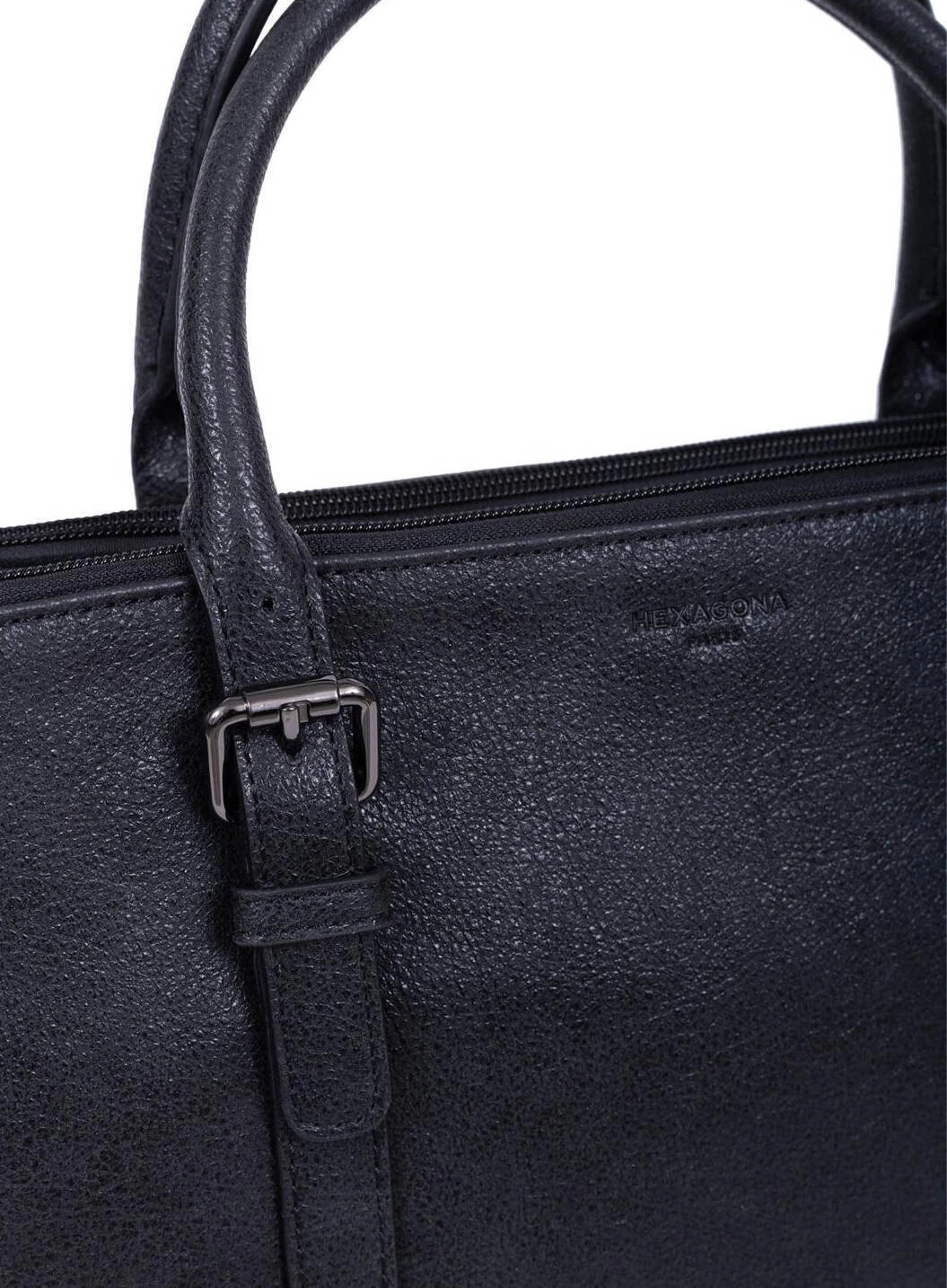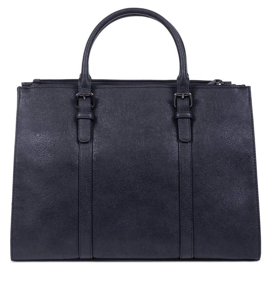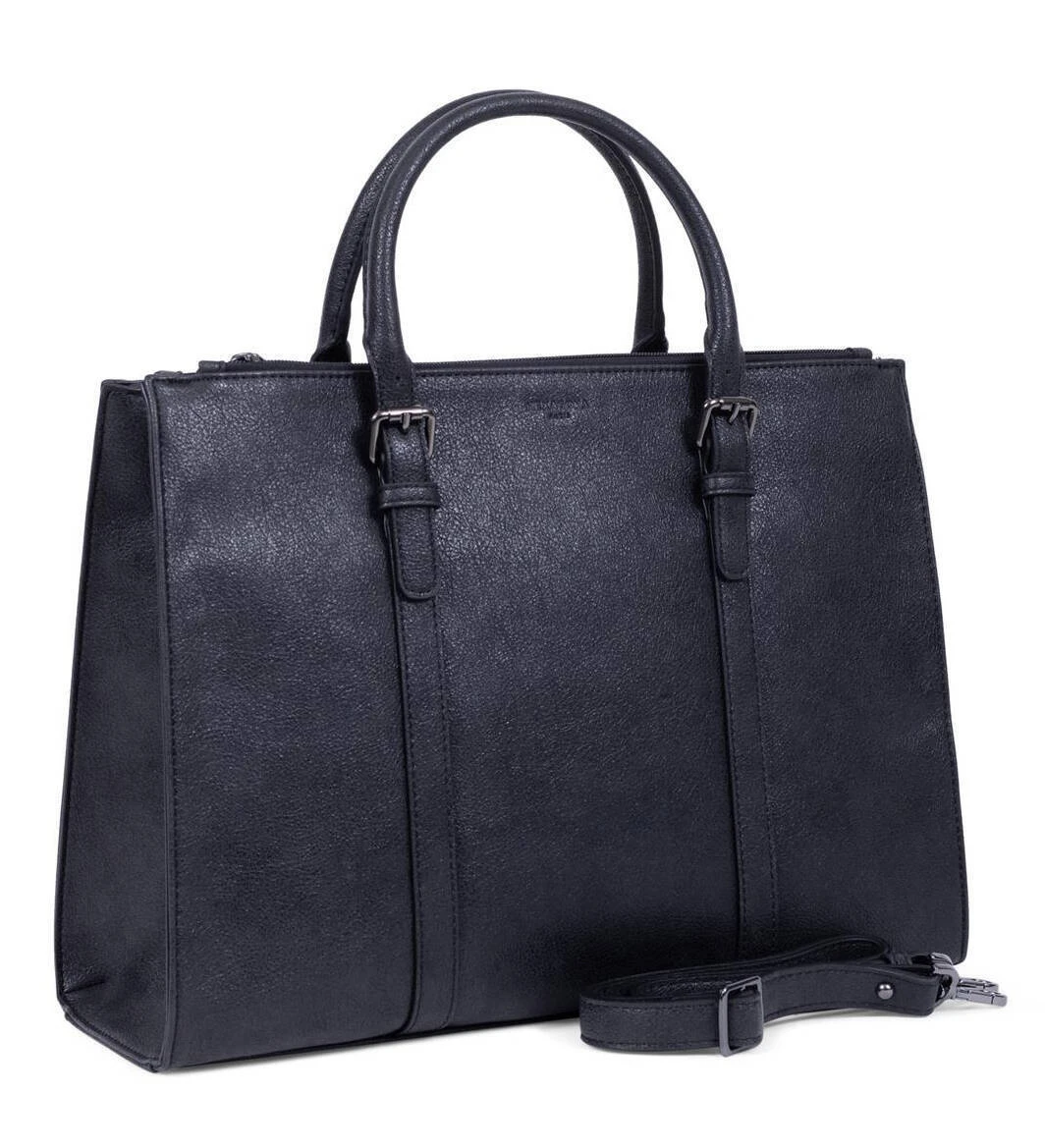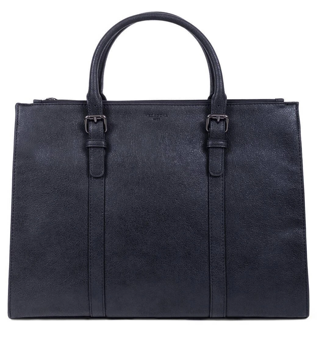 Sac porté main 2 poignées synthétique, il se ferme à l’aide d’un zip. On retrouve des canons de fusils sous le dessous du sac pour protection . A l’intérieur, vous avez 3 compartiments principaux avec 1 poche de séparation zippée + 1 poche plate zippée + 2 poches plates (dont 1 compartiment téléphone). Ce sac est de format compatible A4, il se porte principalement à la main grâce à ses 2 poignées réglables 3 crans( de 34 à 44 cm de long par 1.5 cm de large ) . Et vous avez aussi en complément 1 bandoulière supplémentaire réglable amovible ( de 76 cm à 133.5 cm par 2 cm de large) .