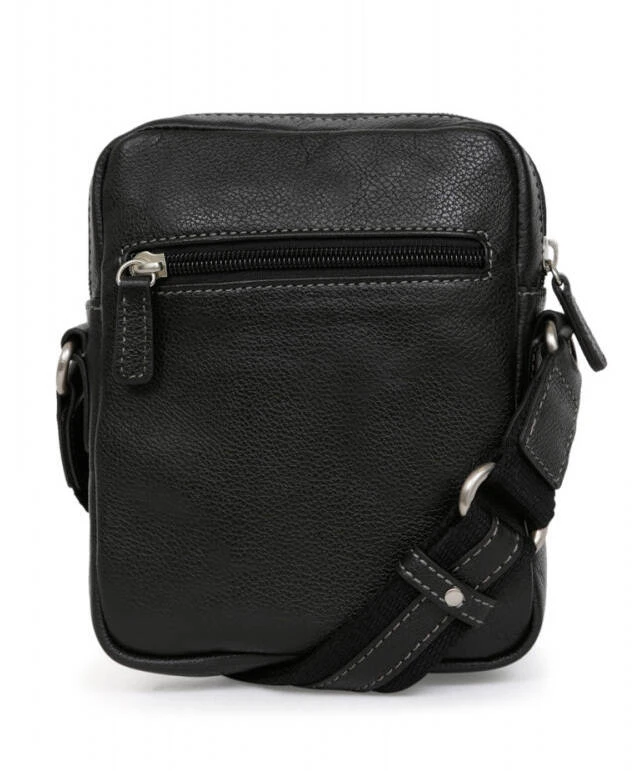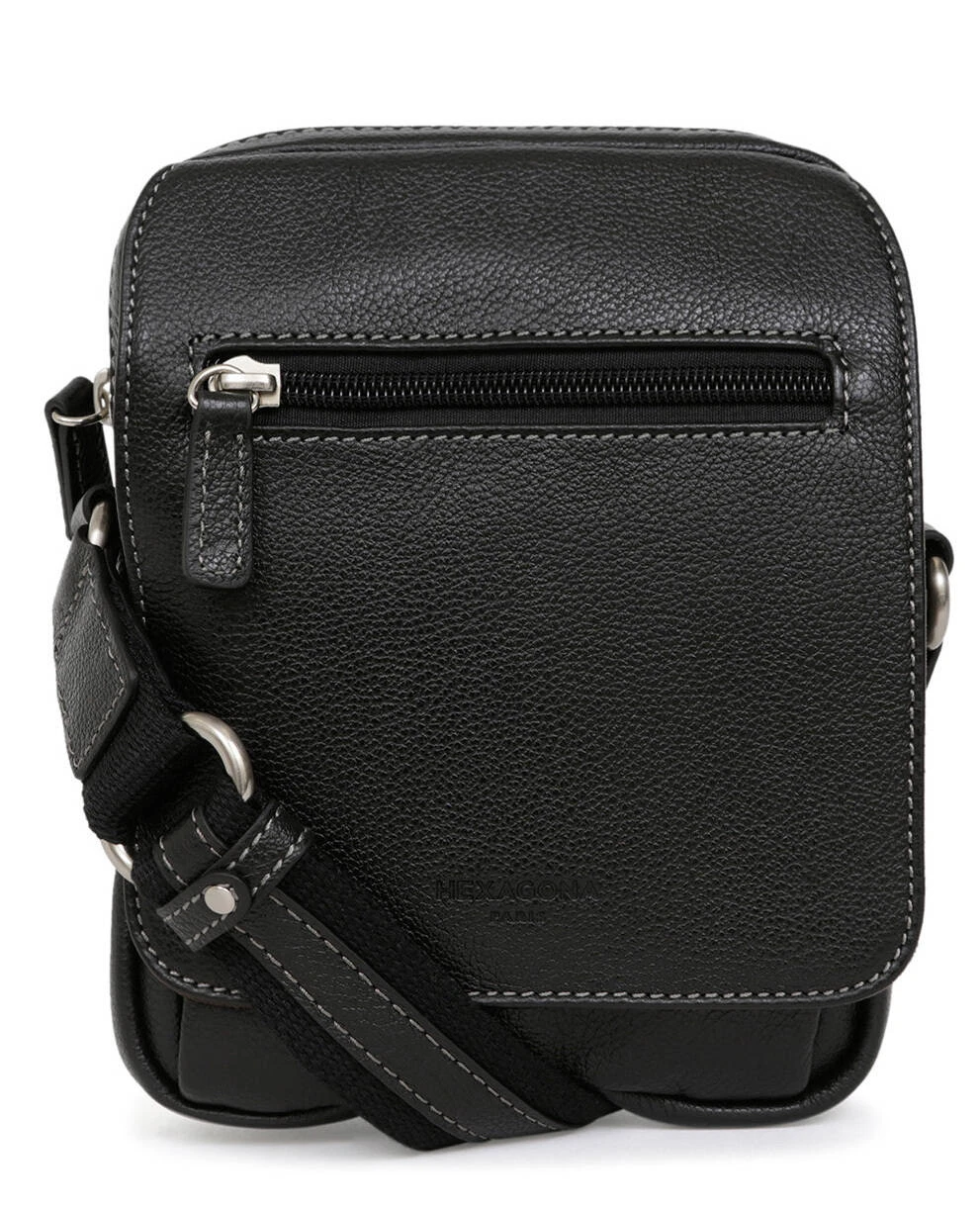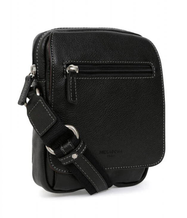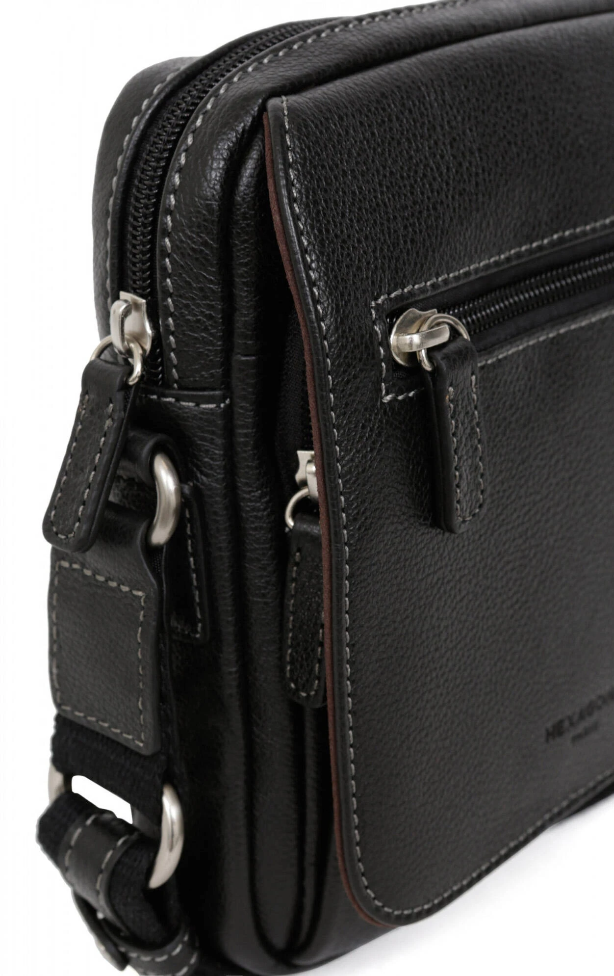 Sacoche en cuir de vachette grainé noir . IL est doublé synthétique, ses finitions sont argent . IL se Ferme à l’aide d’un zip . Sur l’avant , vous avez deux poches zippées avec deux poches plates (dont une compartiment téléphone) . Sur l’arrière in retrouve également une poche plate zippée. A l’intérieur, vous avez un compartiment principal avec une poche plate zippée. Sa bandoulière est réglable.