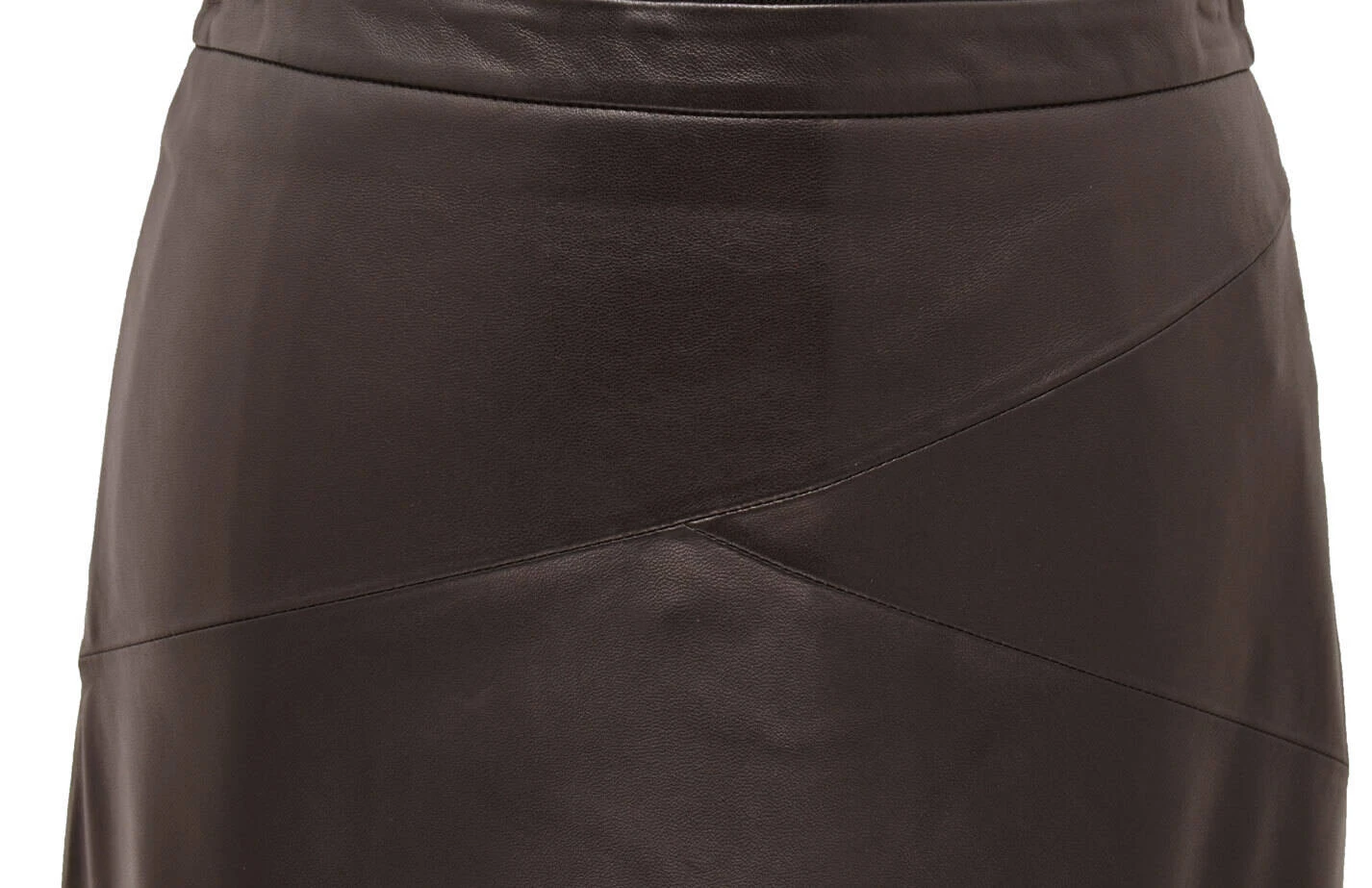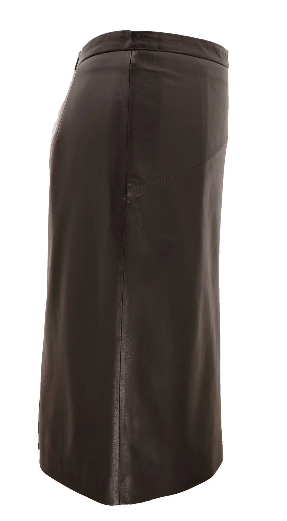 Jupe en cuir d’agneau noir , dans une coupe droite. Cette jupe est très sobre , élégante .Elle est doublée en polyester, le cuir d’agneau est souple. Elle se prête ainsi parfaitement aux mouvements du corps. Il y a un petit empiècement ceinture au niveau de la taille . Vous avez des petites pinces sur l’arrière , un zip pour pouvoir l’enfiler. Sur le bas de la jupe, on retrouve une fente pour plus d’aisance et de confort . Sur le devant, une petite fantaisie , très discrète avec ses empiècements qui donne un peu de relief à la jupe . Comptez une longueur genou, classique, la longueur peut toutefois être retouchée si besoin.