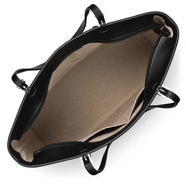 Grand sac cabas Constance par Lancaster : Refente de cuir de vachette – Fermé par zip – Format A4 – Intérieur : 2 poches plaquées, 1 poche zippée – Poche arrière zippée – Anses réglables – Doublure Suédine coloris taupe – Métal argenté brillant – Dimensions : L32 x H28 x P15 cm – Coloris : Noir