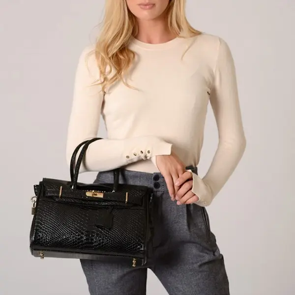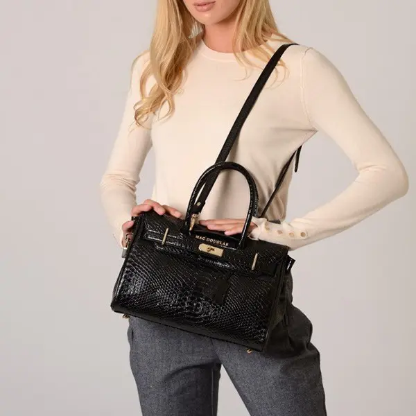 Le petit sac à main Mac Douglas noir serpent se porte à la main par ses doubles poignées ou à l’épaule ou croisé par sa bandoulière ajustable amovible.