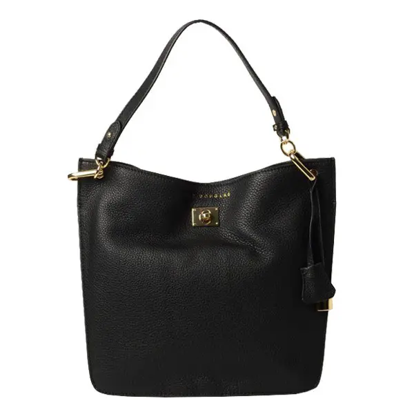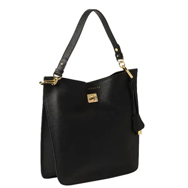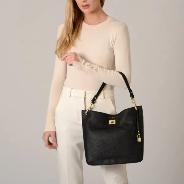 L’extérieur est décoré de pièces en métal dorées et du joli cuir de vachette grainé noir. La fermeture du sac shopping se fait par un fermoir tourniquet.